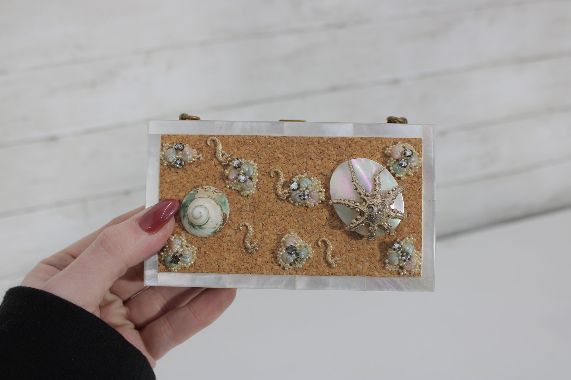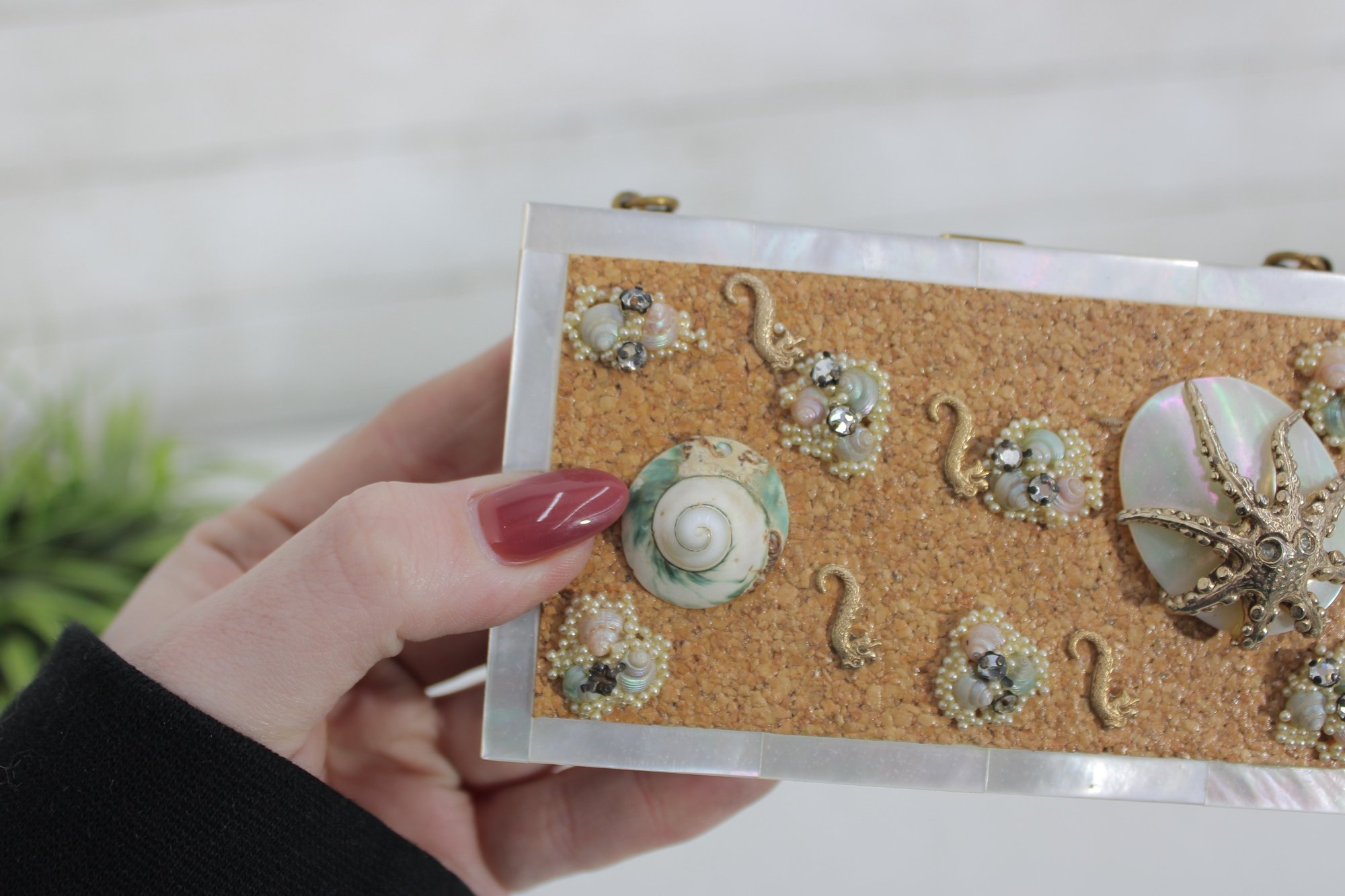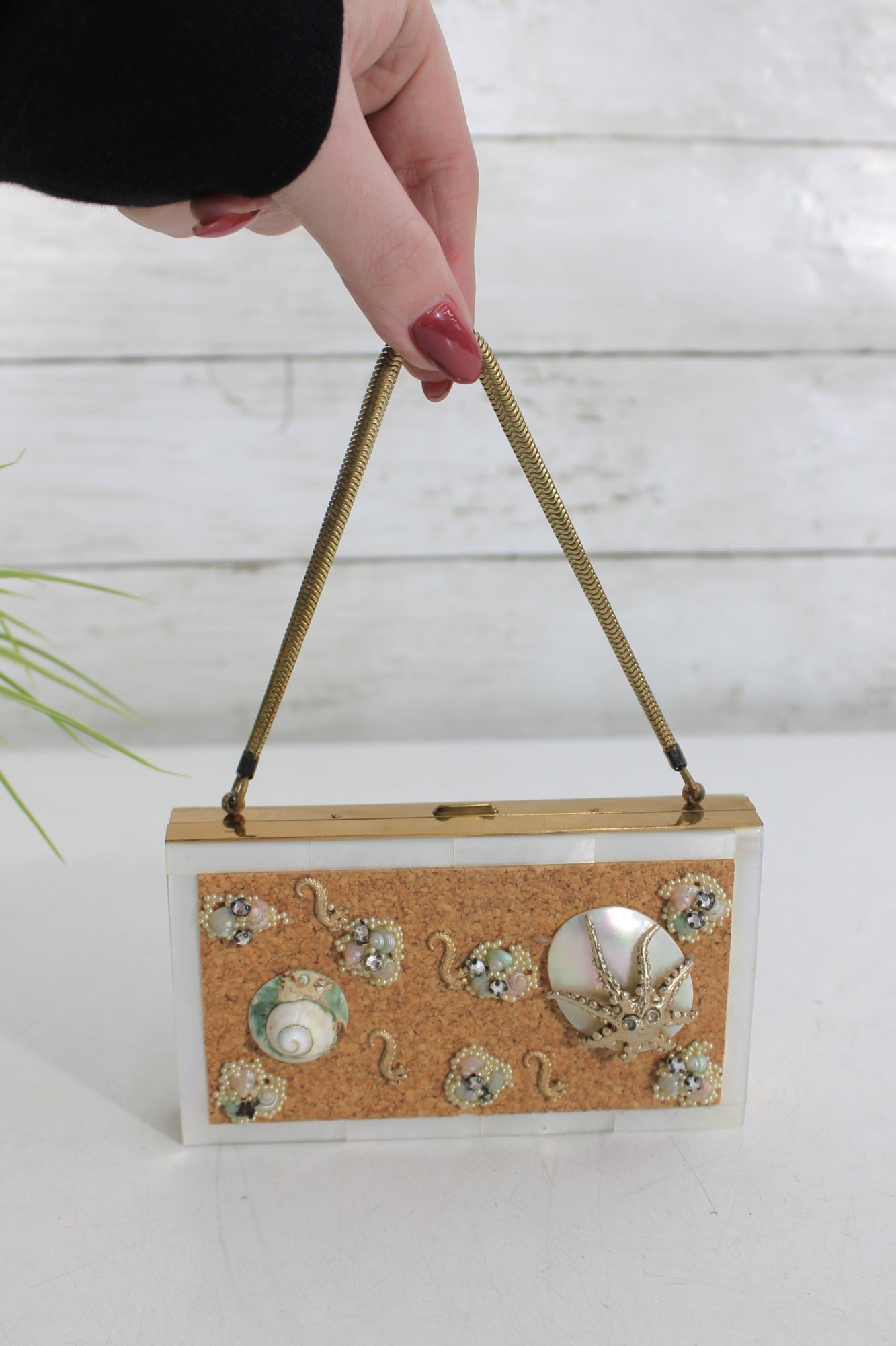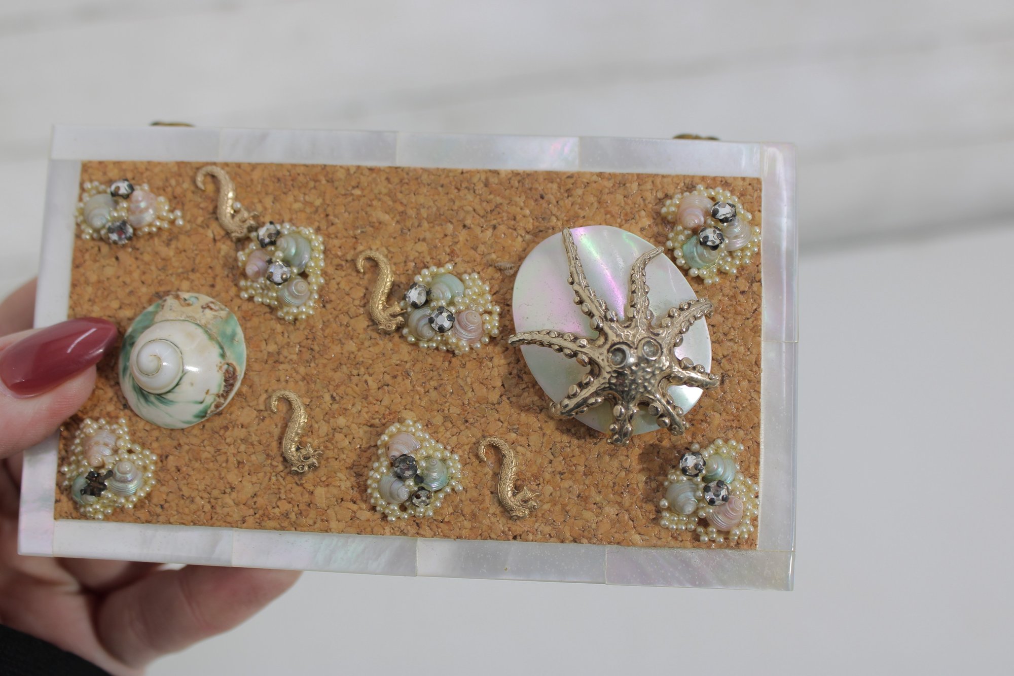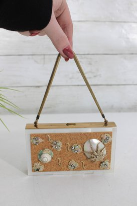 Charming vintage Mother of pearl compact evening bag measuring approximately 3” x 5.25”. This unique accessory features a beautiful seaside-inspired design with decorative seashells, starfish, and textured embellishments set against a cork-style background.