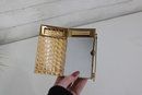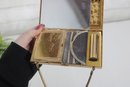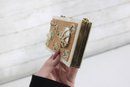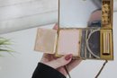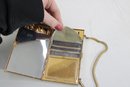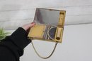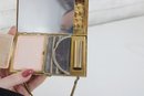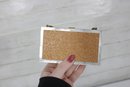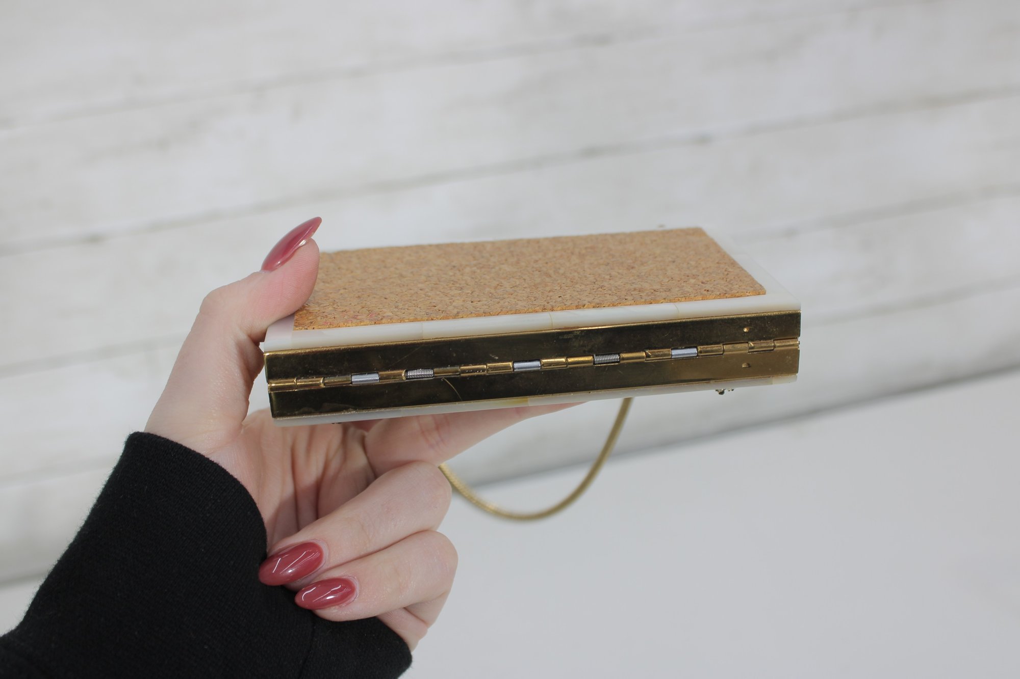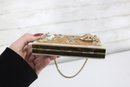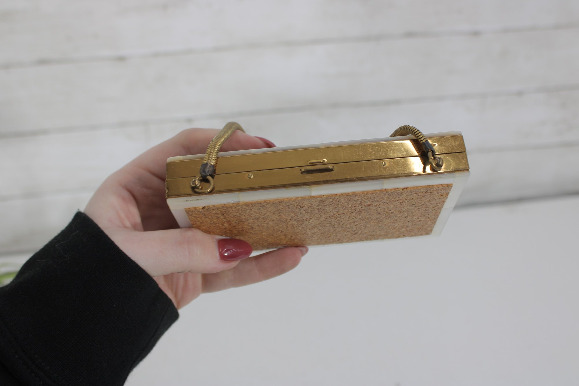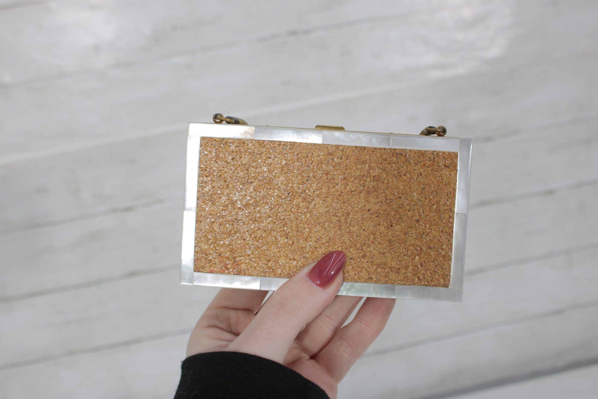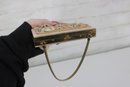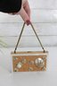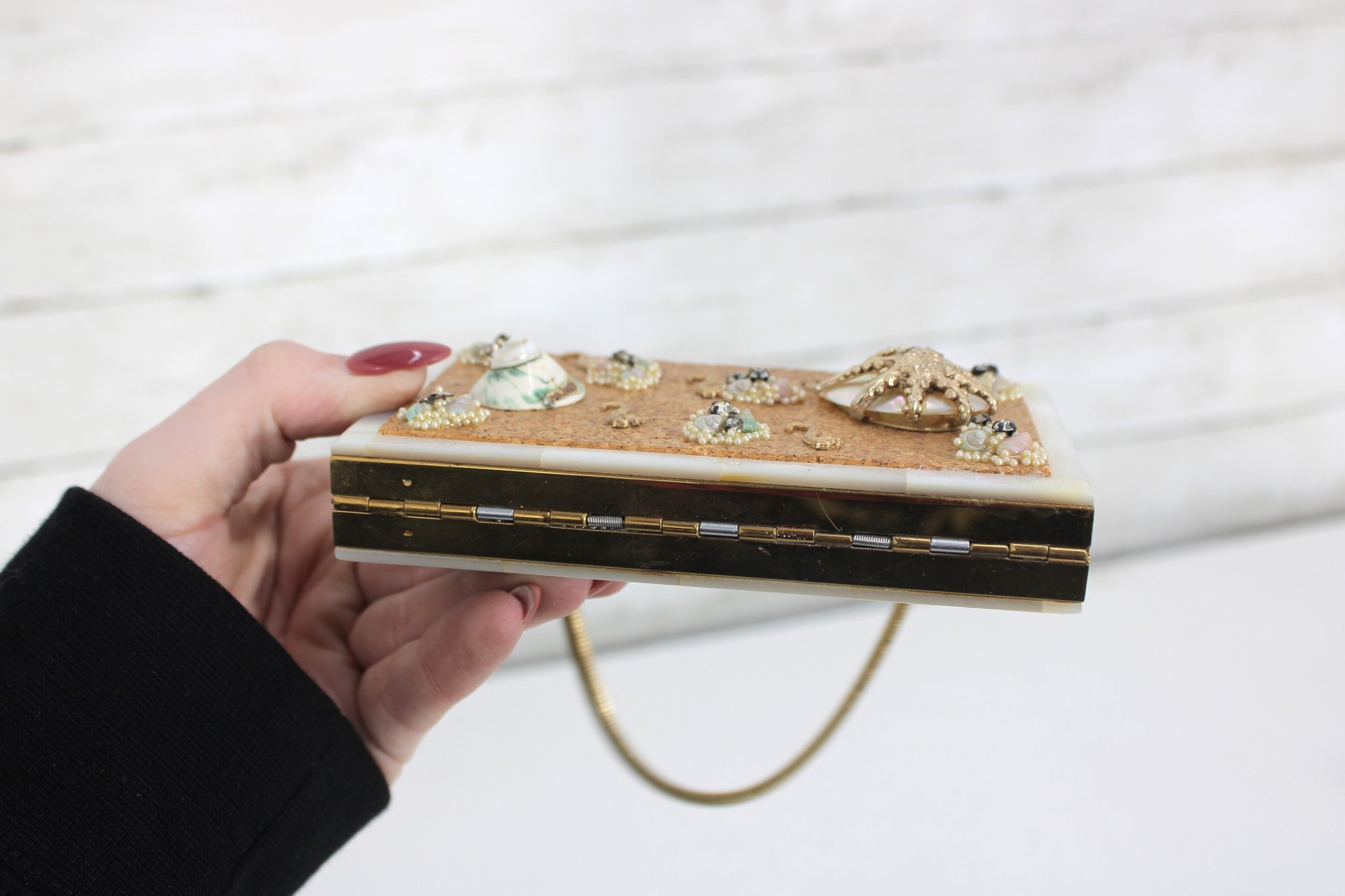 Charming vintage Mother of pearl compact evening bag measuring approximately 3” x 5.25”. This unique accessory features a beautiful seaside-inspired design with decorative seashells, starfish, and textured embellishments set against a cork-style background.