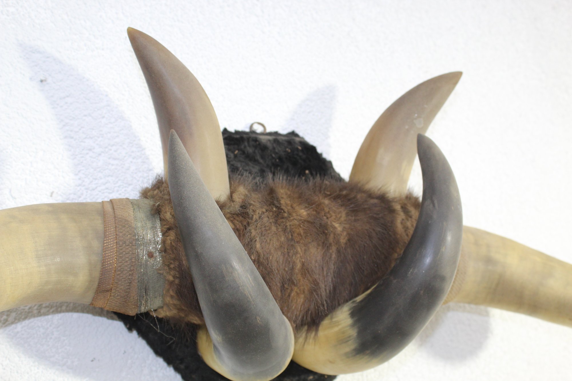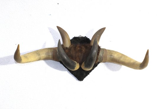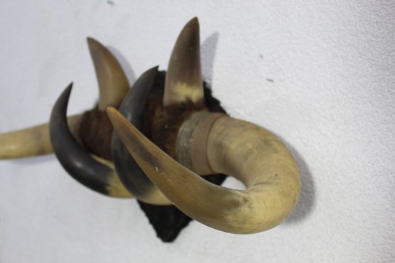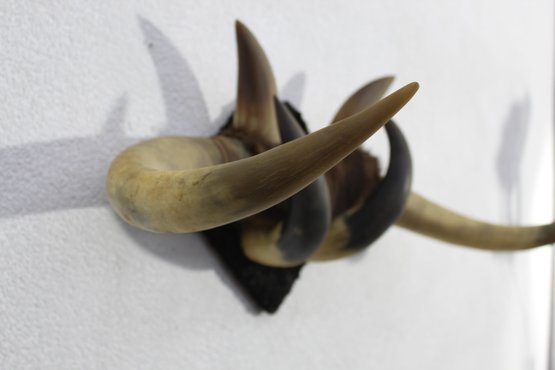 a touch of rustic charm and natural beauty to your space with this striking vintage wall-mounted set of animal horns. The horns are securely affixed to a rustic backing covered with faux fur, creating a bold and eye-catching display piece. This unique decorative item is perfect for adding character to a hunting lodge, cabin, or eclectic home decor.