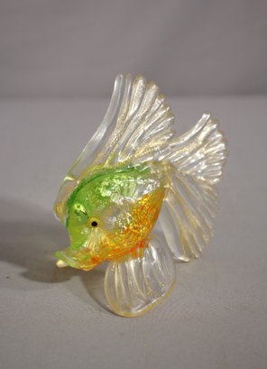 a beautiful example of the exquisite craftsmanship from the renowned glassmakers of Murano, Italy. This decorative piece features vibrant green and orange hues with delicate gold flecks embedded within the glass, creating a striking and elegant appearance. The fish is finely detailed with expressive eyes and flowing fins,