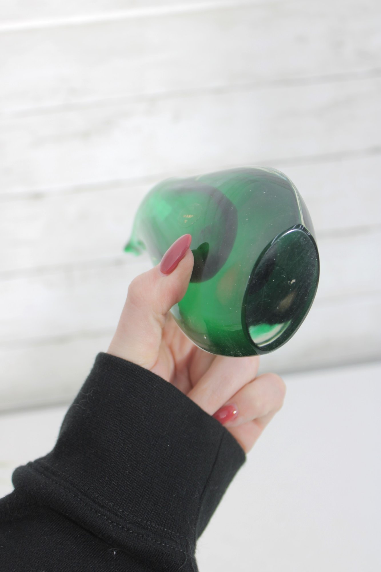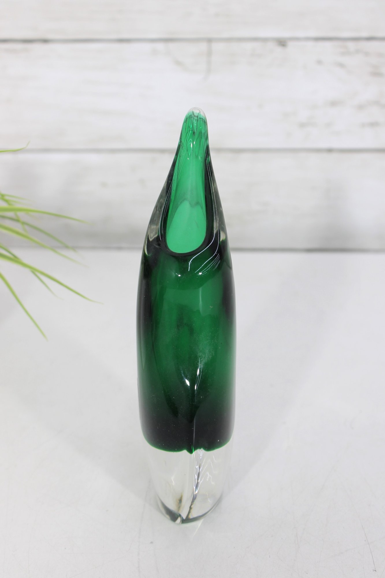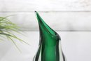 The sculptural, flame-like form with an elongated pulled rim gives the vase wonderful movement and sophistication. The clear outer layer enhances the depth of the green core, catching light beautifully from every angle.