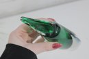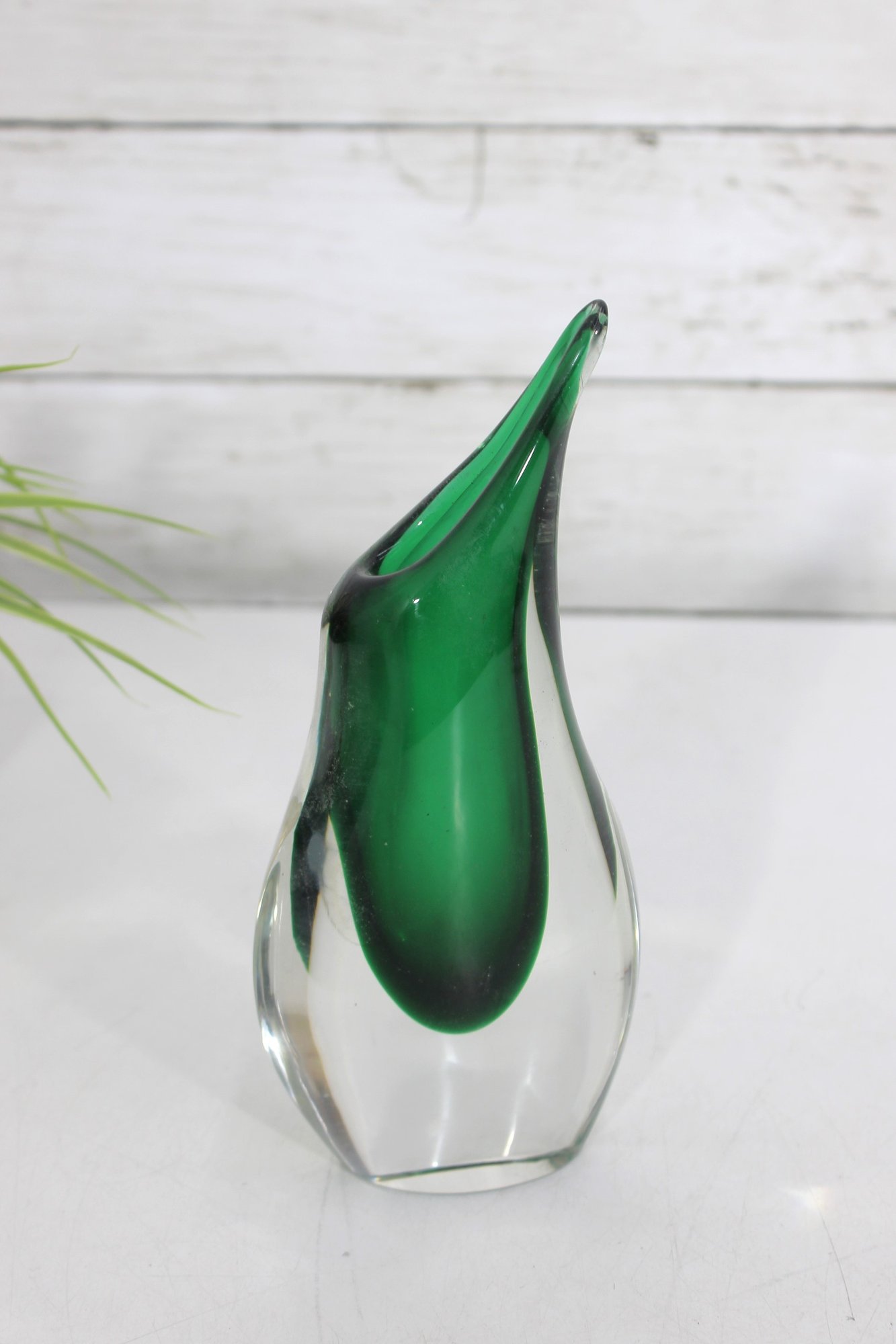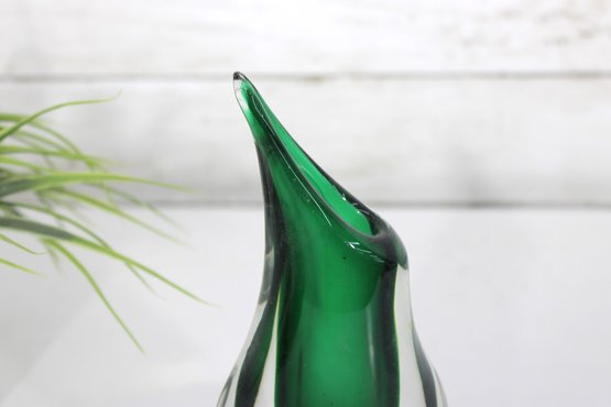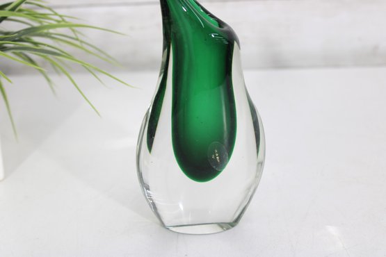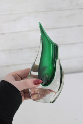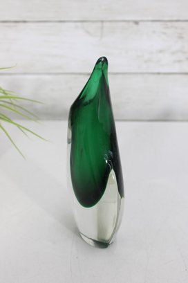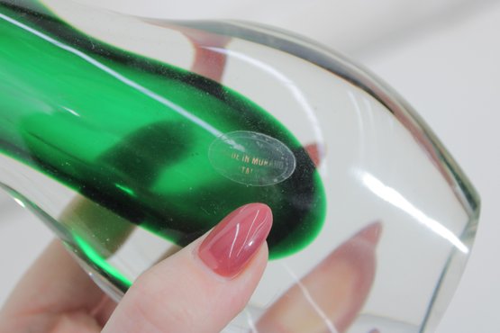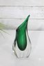 Murano-style art glass vase standing approximately 8 inches high. This striking piece features a rich emerald green interior encased in clear glass, creating a beautiful sommerso effect.