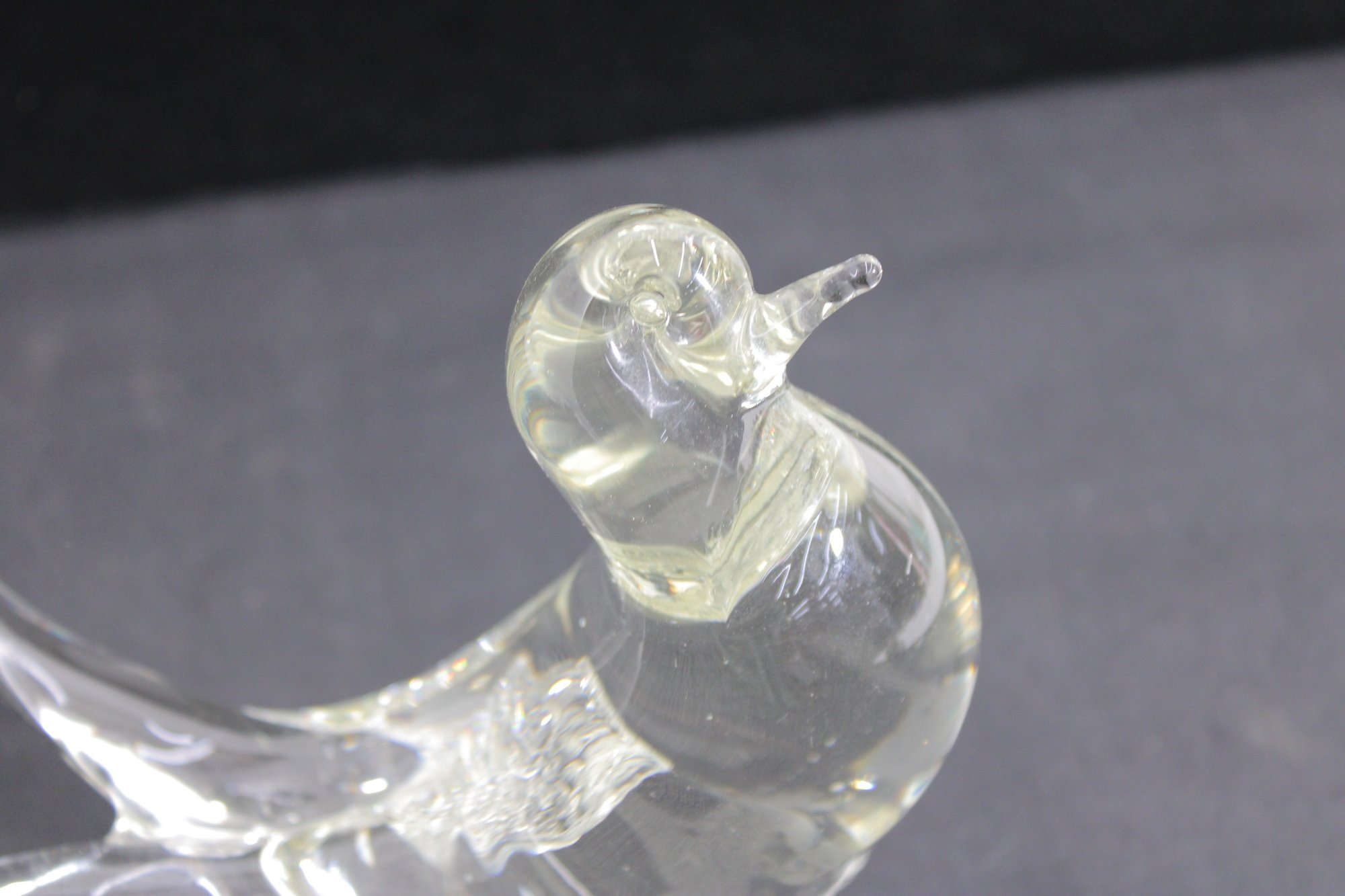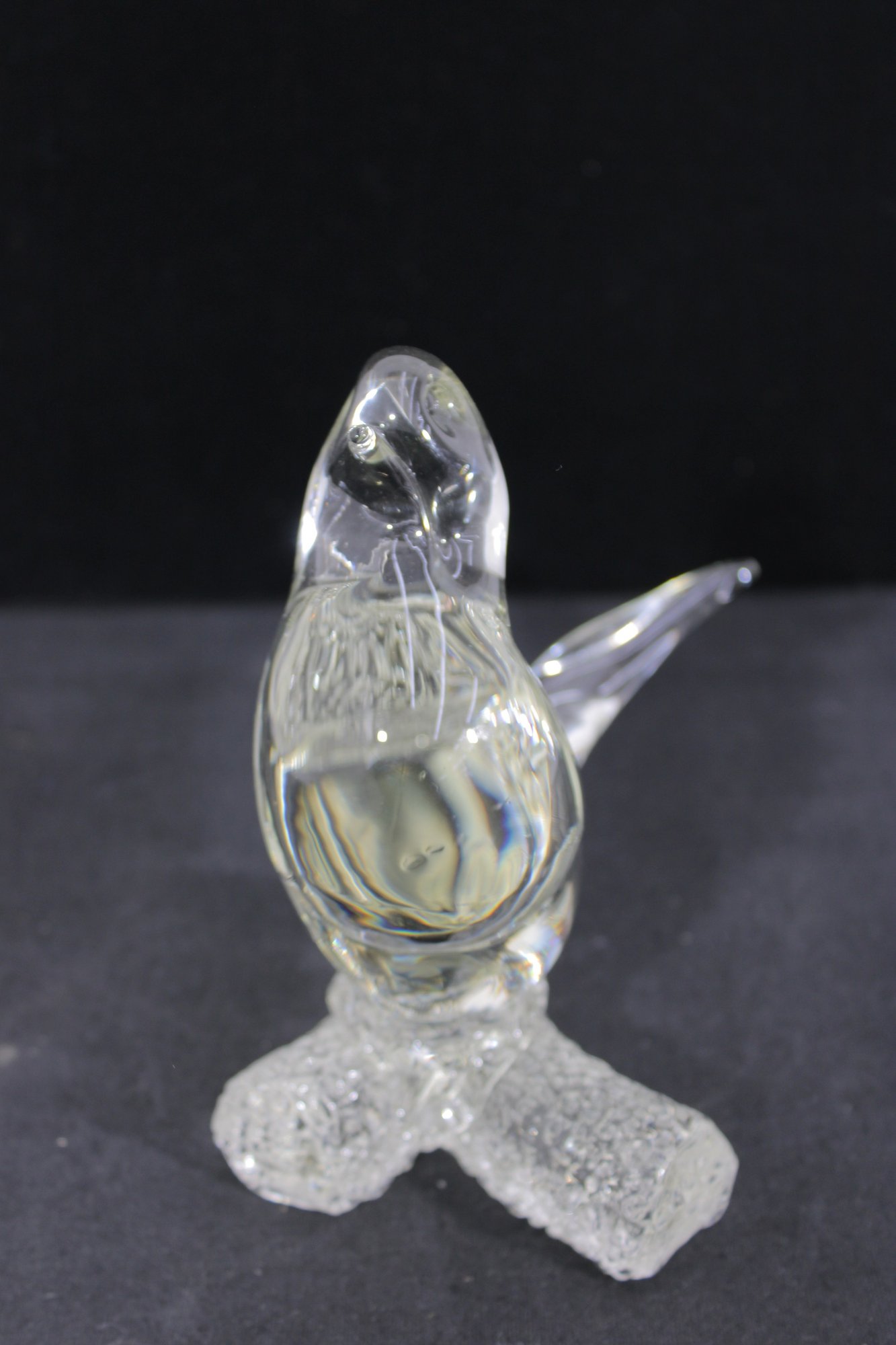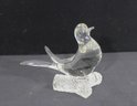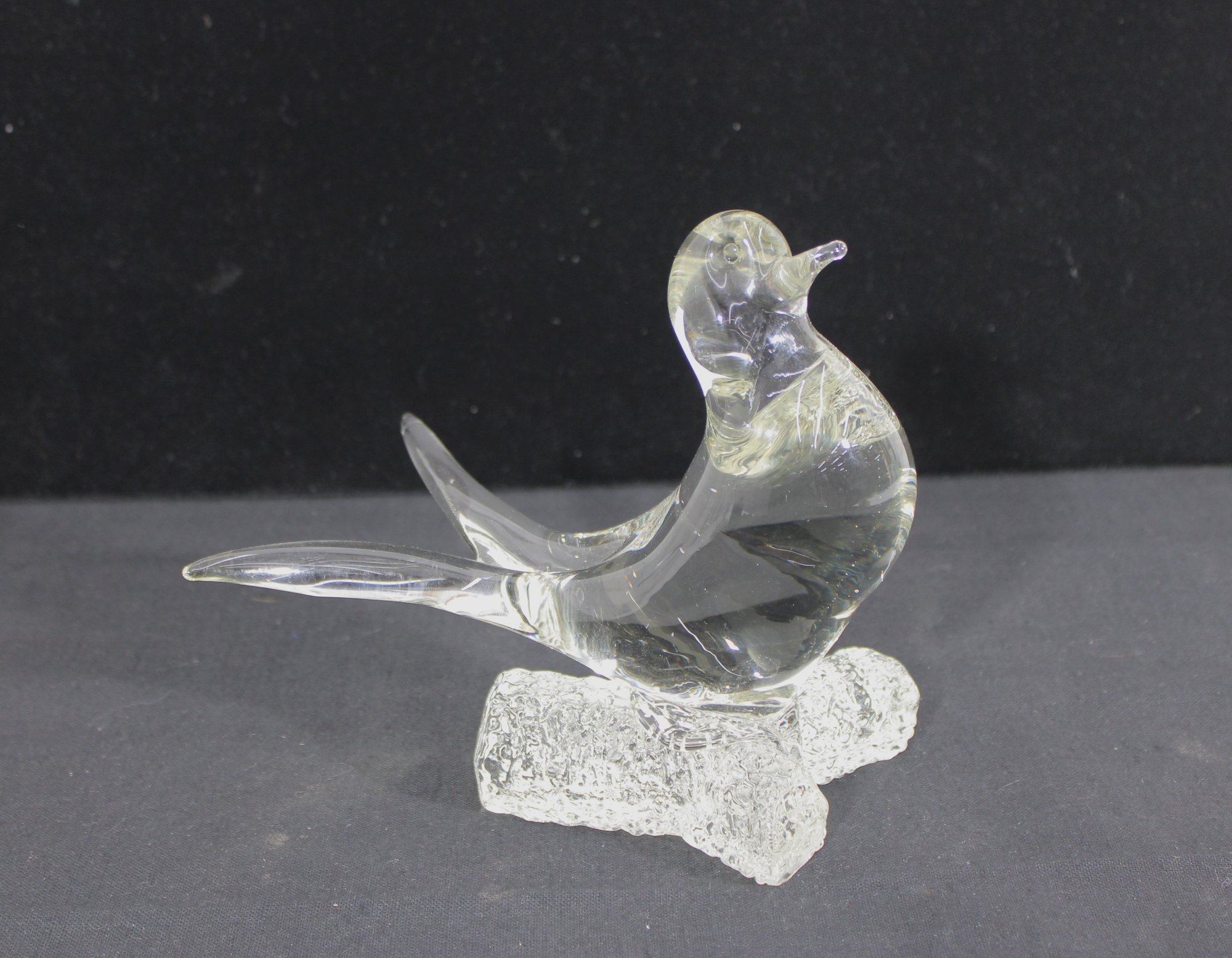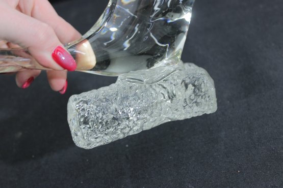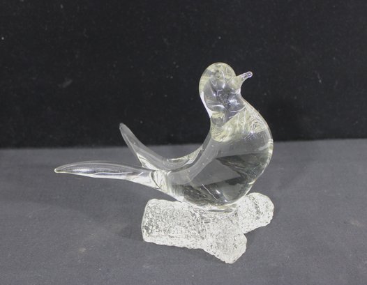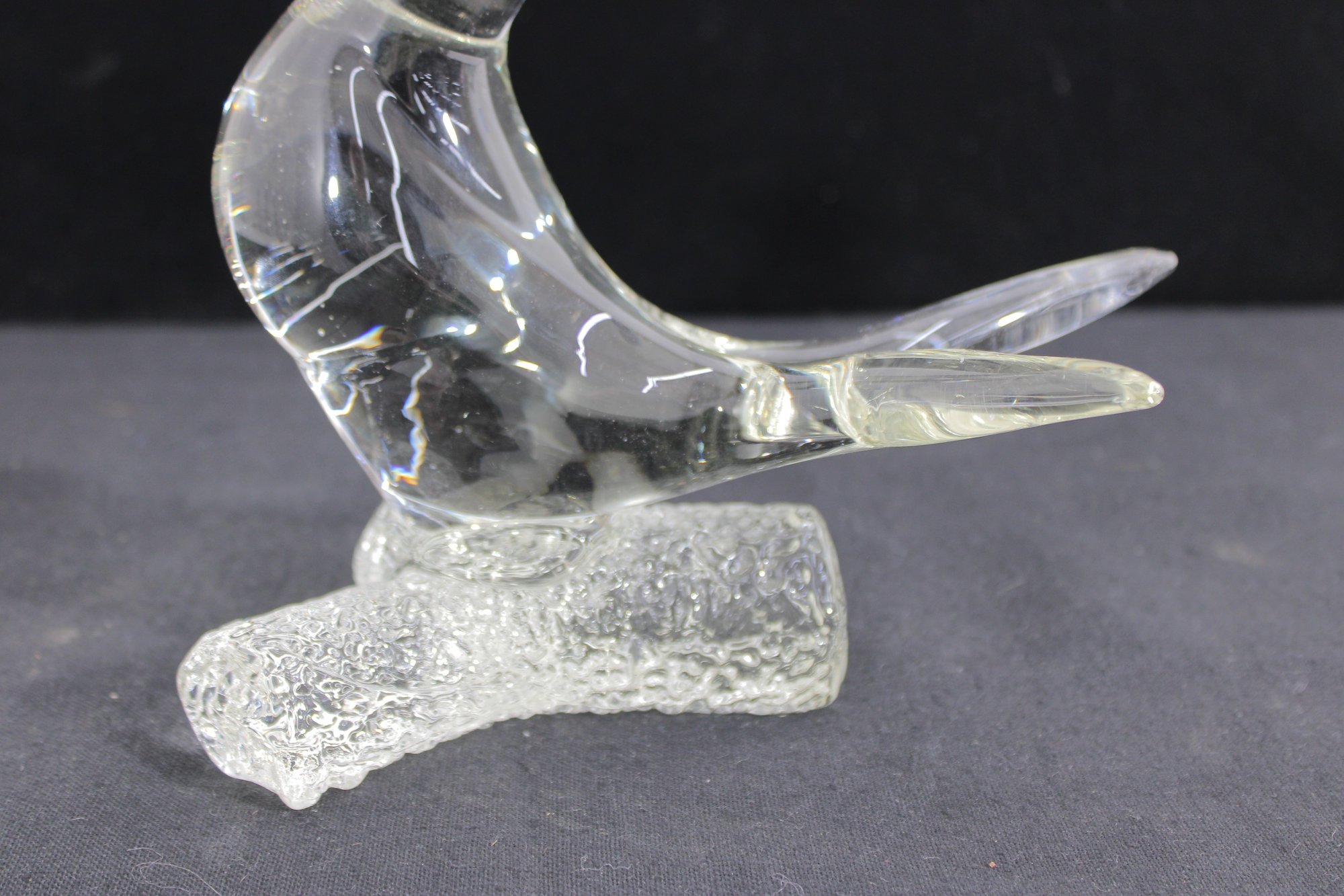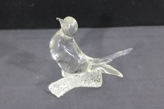A graceful vintage Murano-style art glass figurine featuring a single bird perched on a textured branch or log base. Crafted in clear glass, this elegant piece showcases smooth, flowing lines and refined craftsmanship, with beautifully shaped wings and tail feathers that give a sense of lightness and motion.