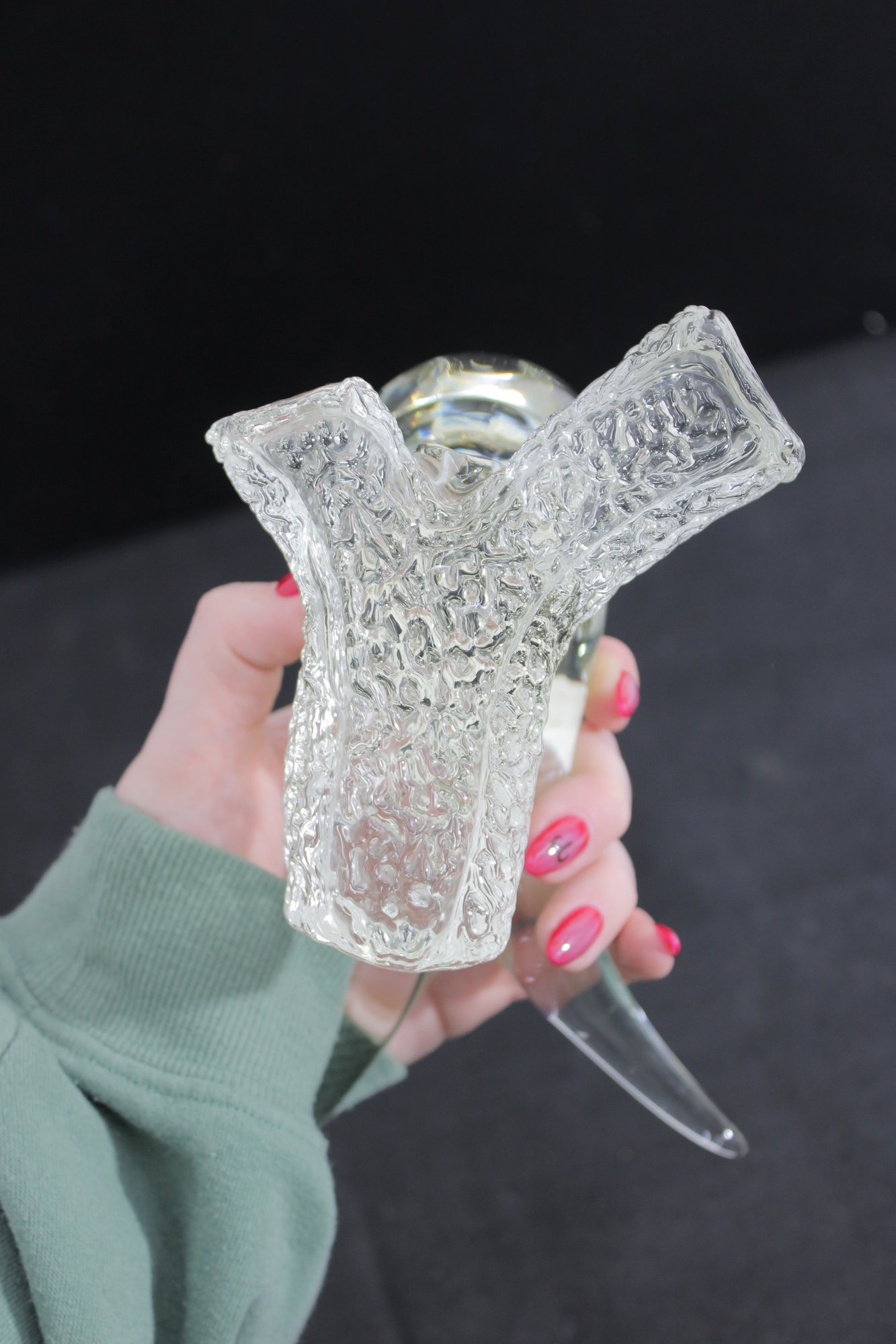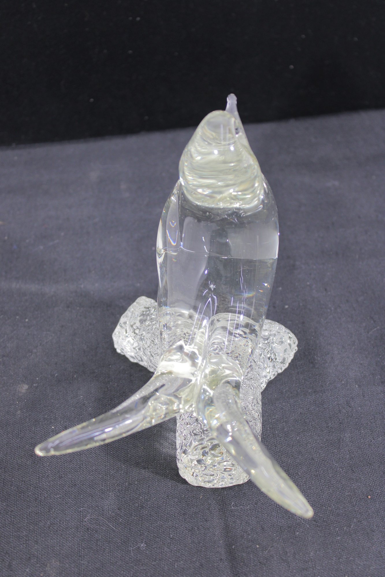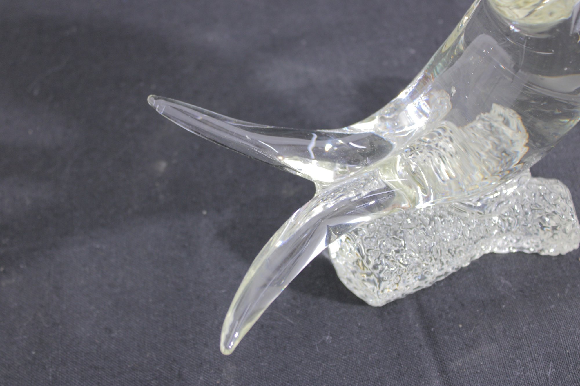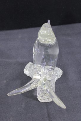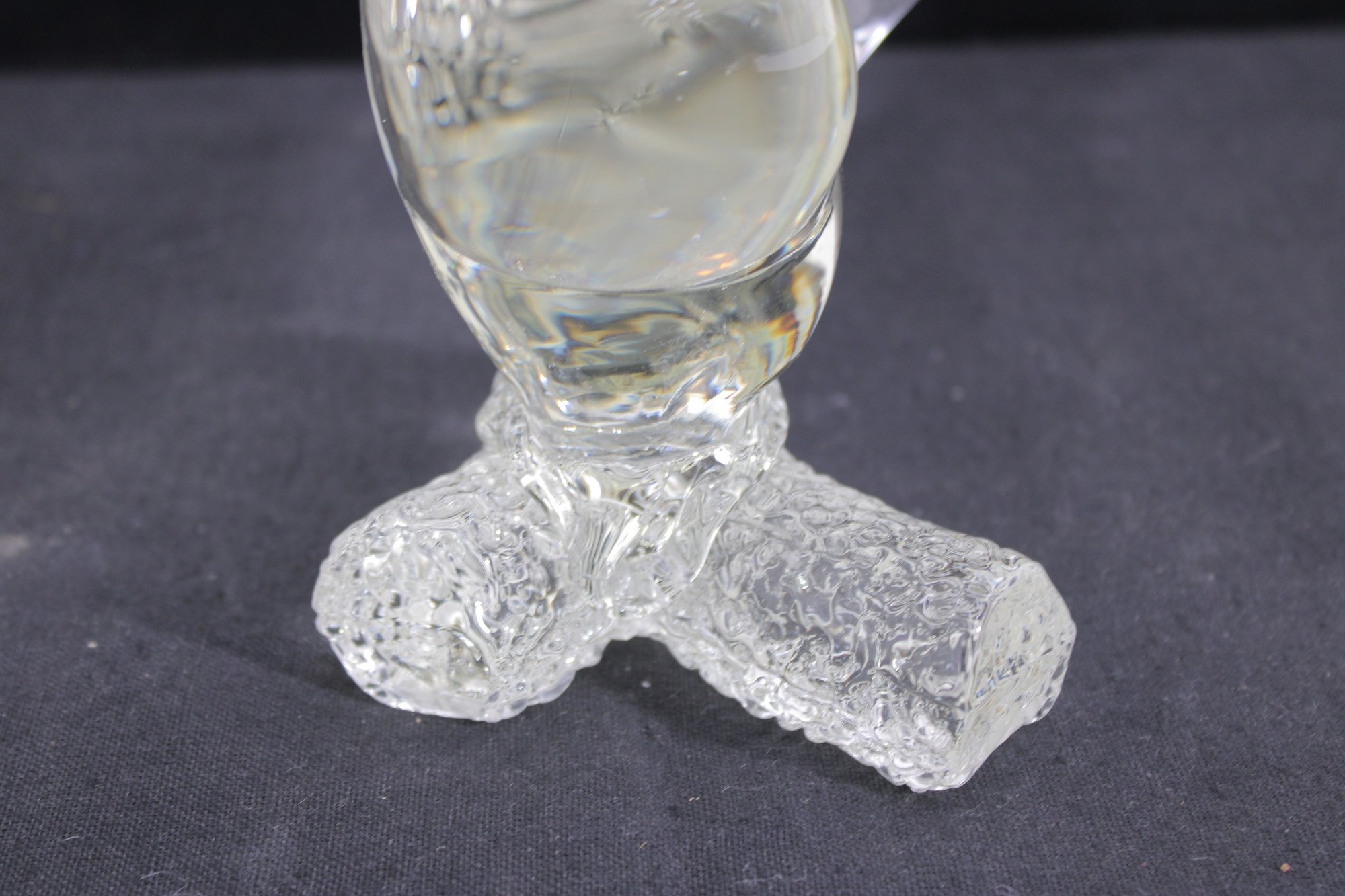 A graceful vintage Murano-style art glass figurine featuring a single bird perched on a textured branch or log base. Crafted in clear glass, this elegant piece showcases smooth, flowing lines and refined craftsmanship, with beautifully shaped wings and tail feathers that give a sense of lightness and motion.