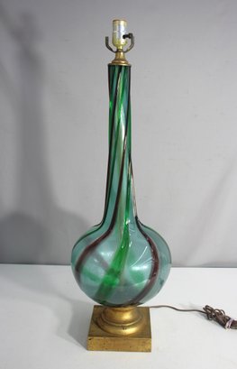 A stunning vintage table lamp featuring a Murano-style swirled glass body with green and brown tones. The elegant glass sits atop a sturdy and ornate brass base, exuding mid-century modern charm. The lamp is in good working condition, with visible patina and wear on the base, adding to its vintage appeal. Ideal for collectors or those seeking a statement lighting piece.