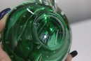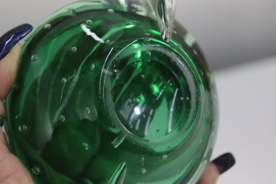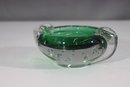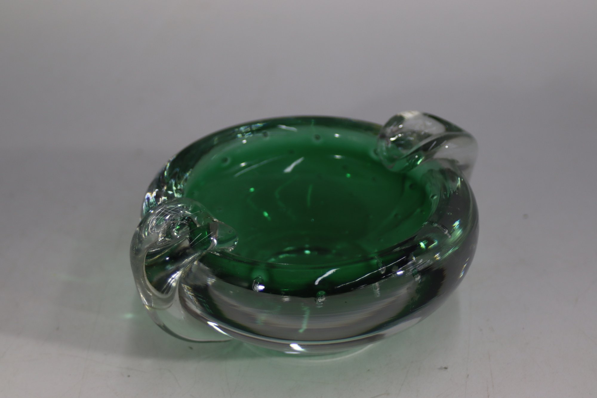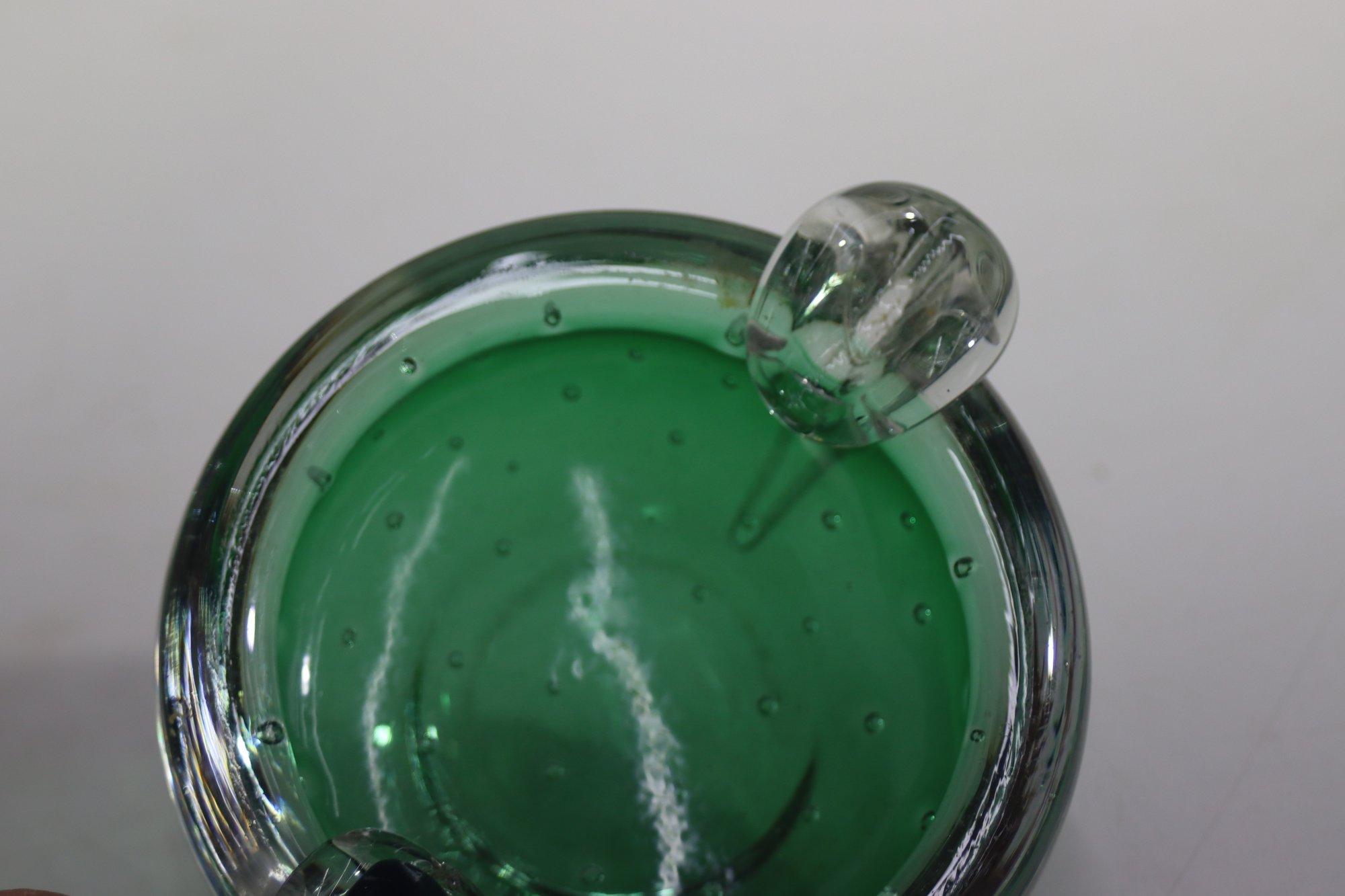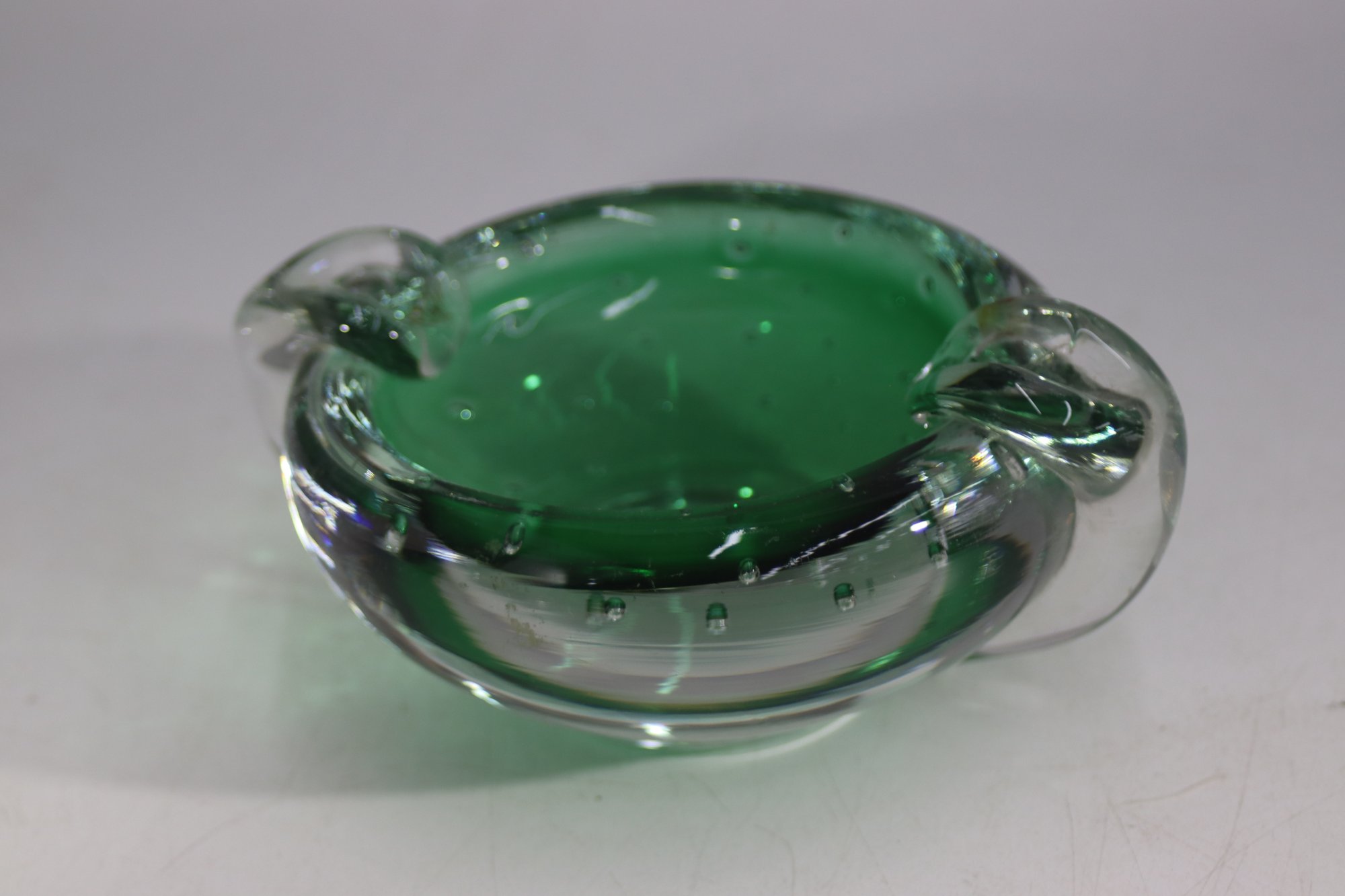 stunning vintage Murano-style art glass ashtray, featuring a beautiful green core encased in clear glass with an elegant controlled bubble design. This exquisite piece showcases expert craftsmanship, making it a perfect addition to any mid-century modern, retro, or art glass collection.