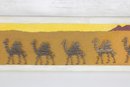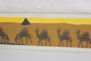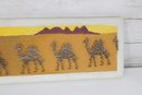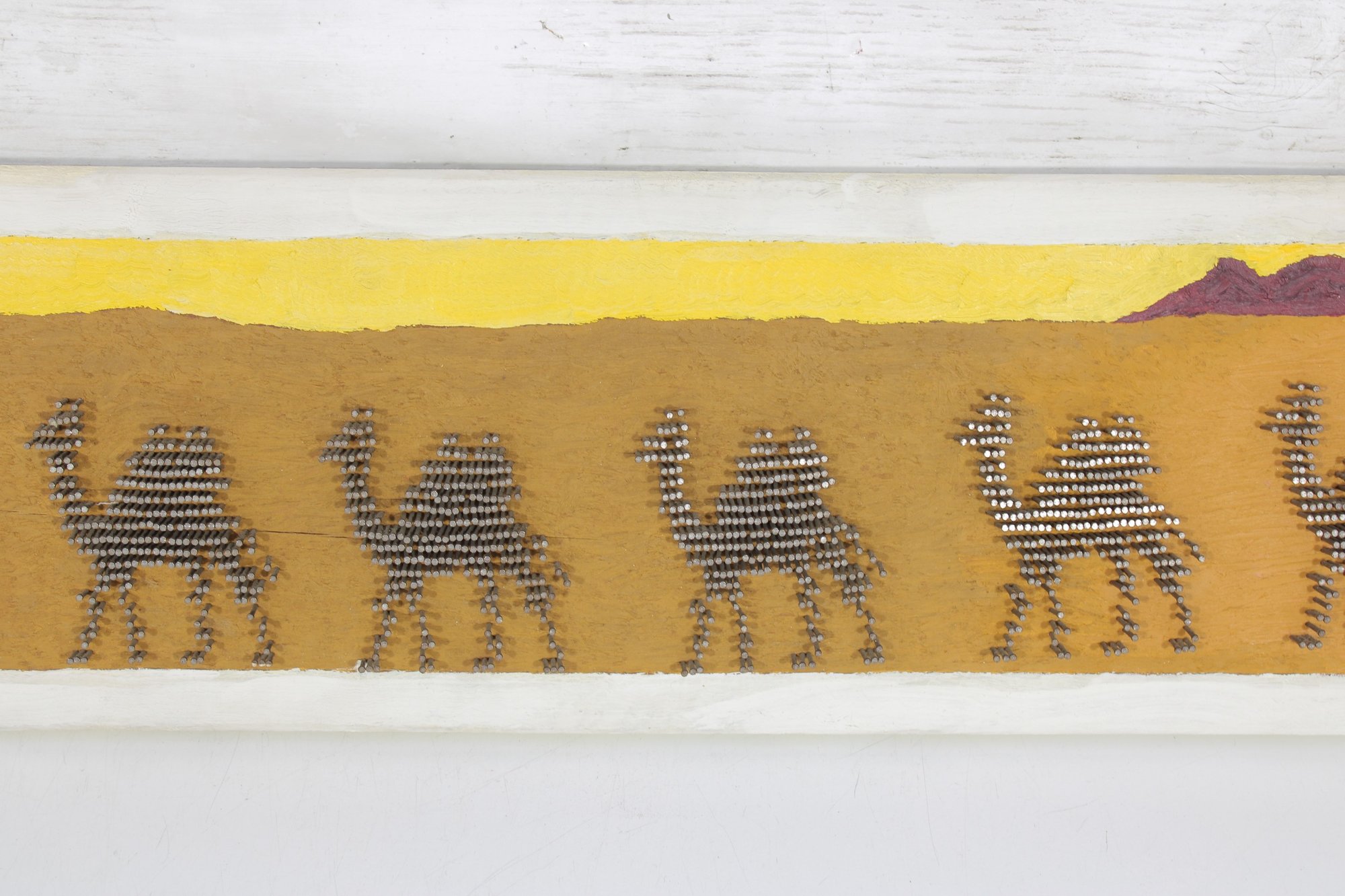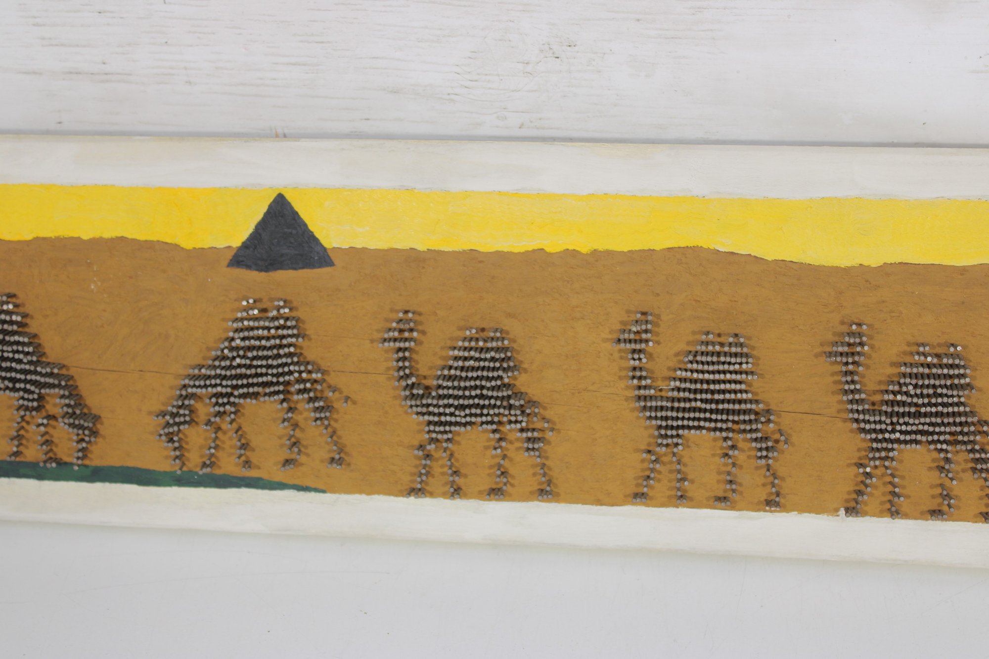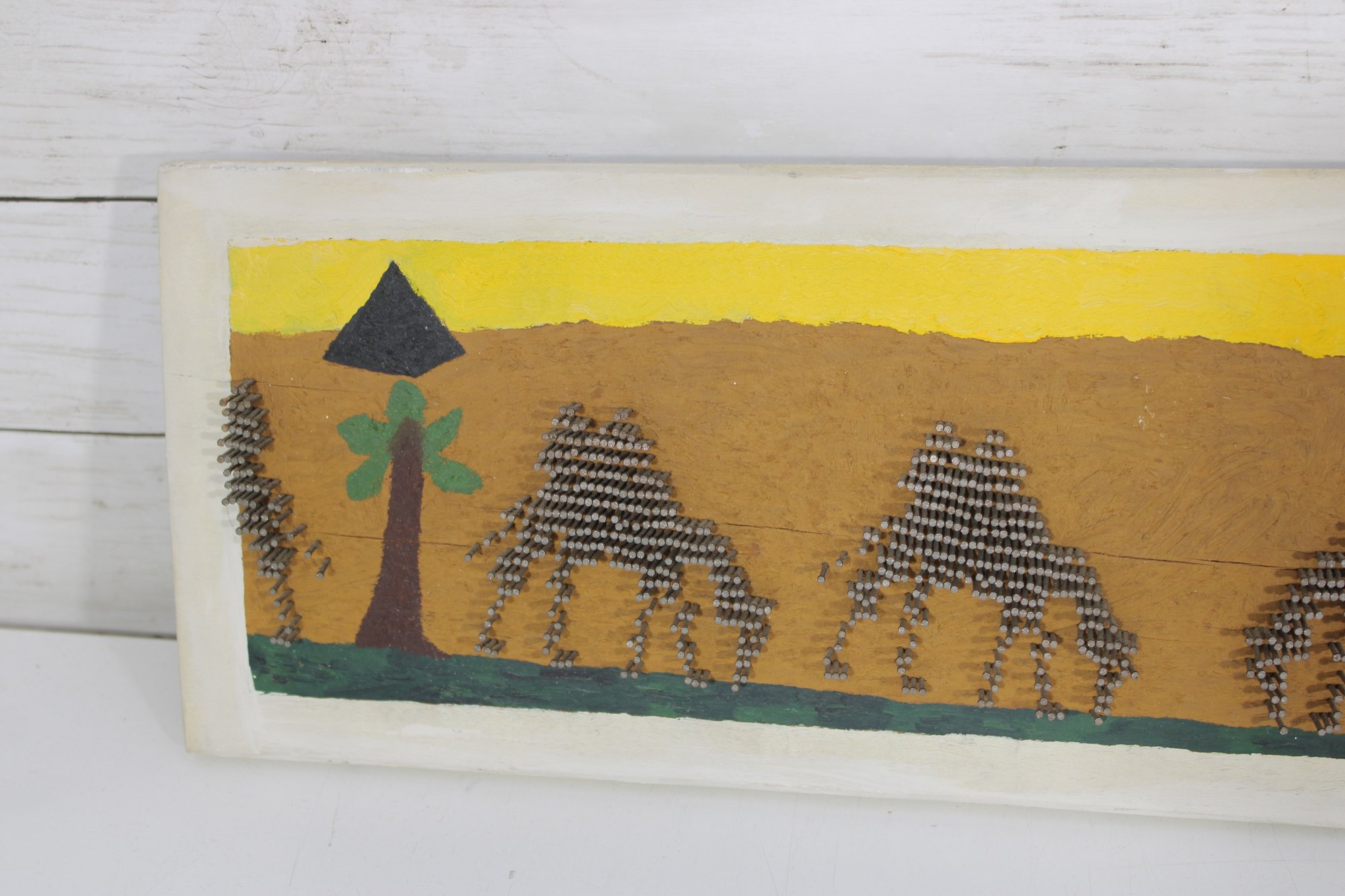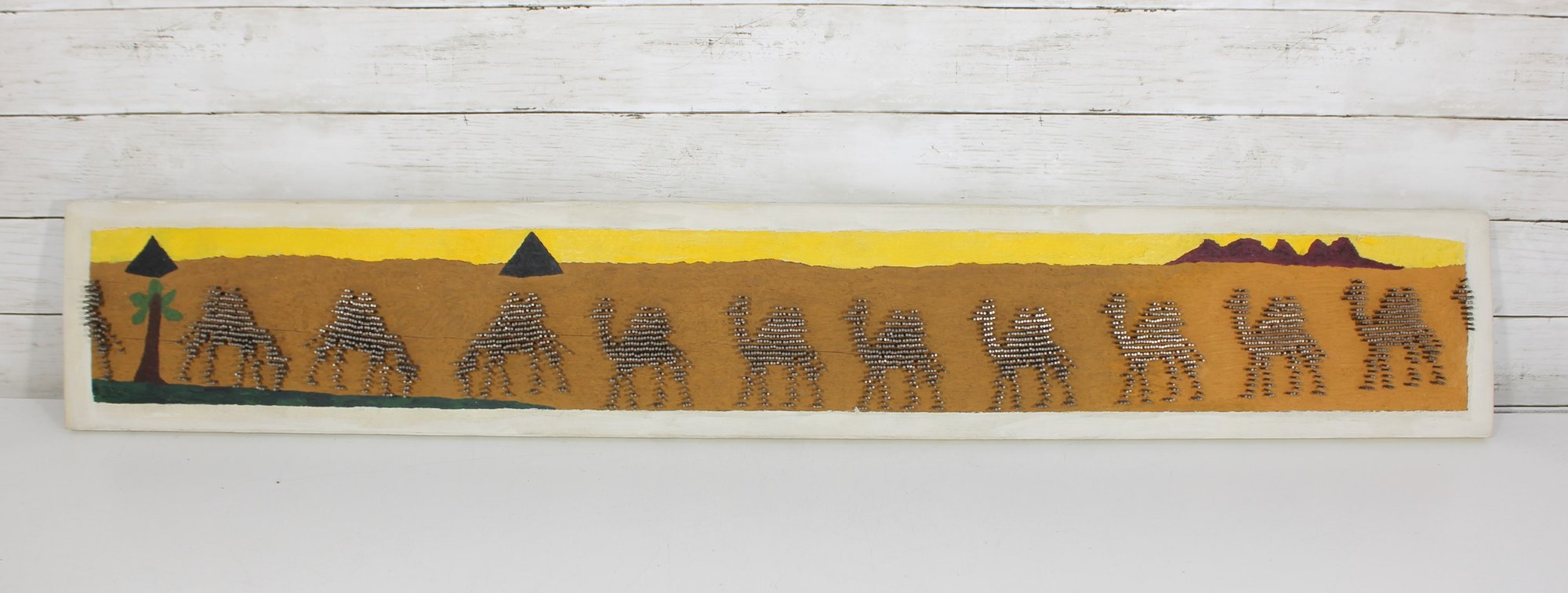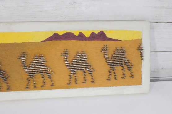 Unique vintage nail string art wall panel depicting a stylized desert caravan scene. This handcrafted piece features camels, pyramids, and palm trees set against a warm desert landscape, created using carefully arranged nails to form textured silhouettes.