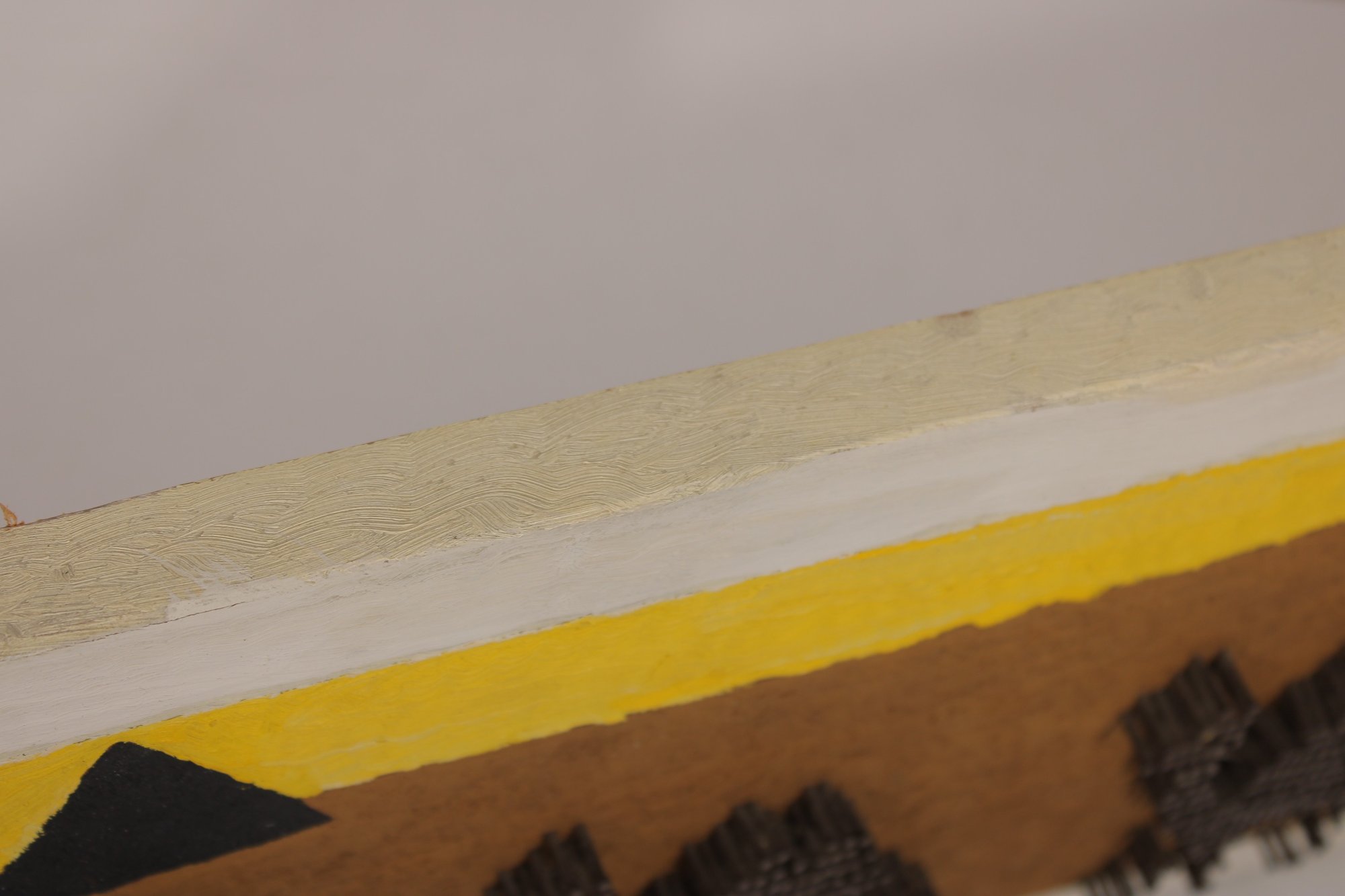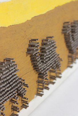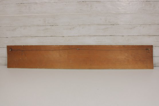 The combination of painted background and dimensional nailwork gives the artwork depth and visual interest, making it a standout piece of folk or mid-century decorative art. The long horizontal format makes it ideal for display above a sofa, bed, or hallway.