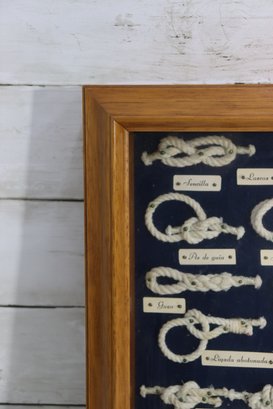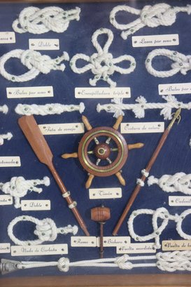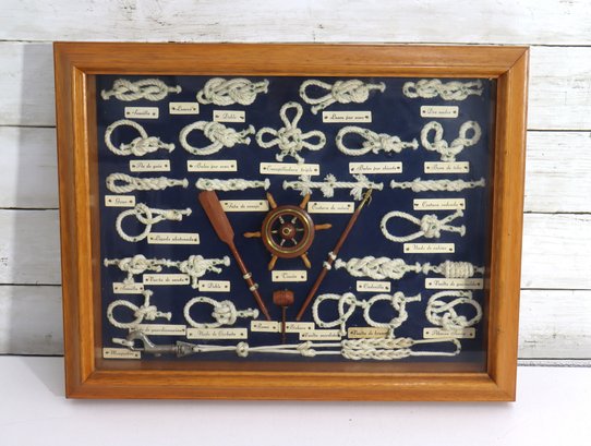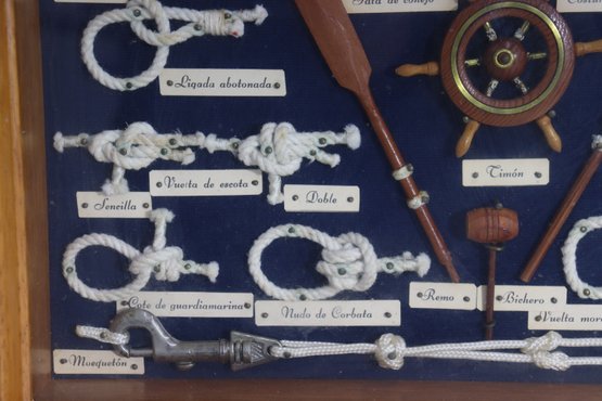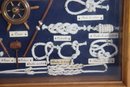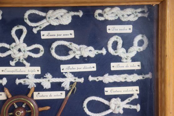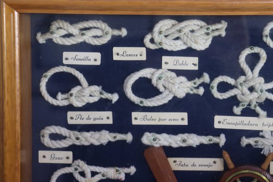Vintage framed nautical knot display featuring multiple types of ship / marine rope knots mounted inside a wood frame behind glass. Each knot is labeled in Spanish with small printed name tags, showing different rope tying techniques historically used in sailing and maritime craft. Center includes miniature ship wheel, paddles and nautical décor elements adding to the display authenticity.