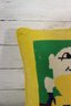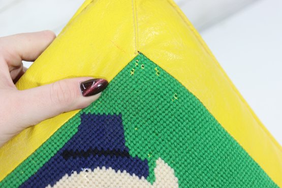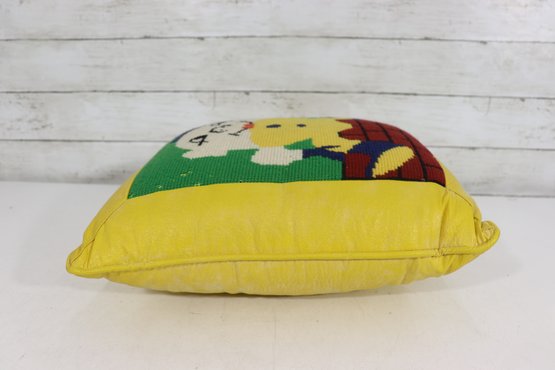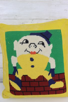 a charming vintage needlepoint accent pillow featuring a whimsical Humpty Dumpty design. This colorful pillow showcases a detailed needlepoint front with a bright yellow vinyl back, giving it a fun retro look that works beautifully in a child’s room, nursery, playroom, or vintage décor collection.