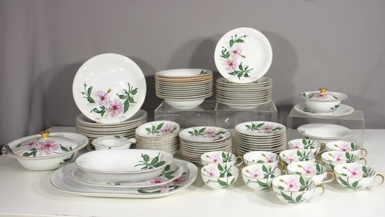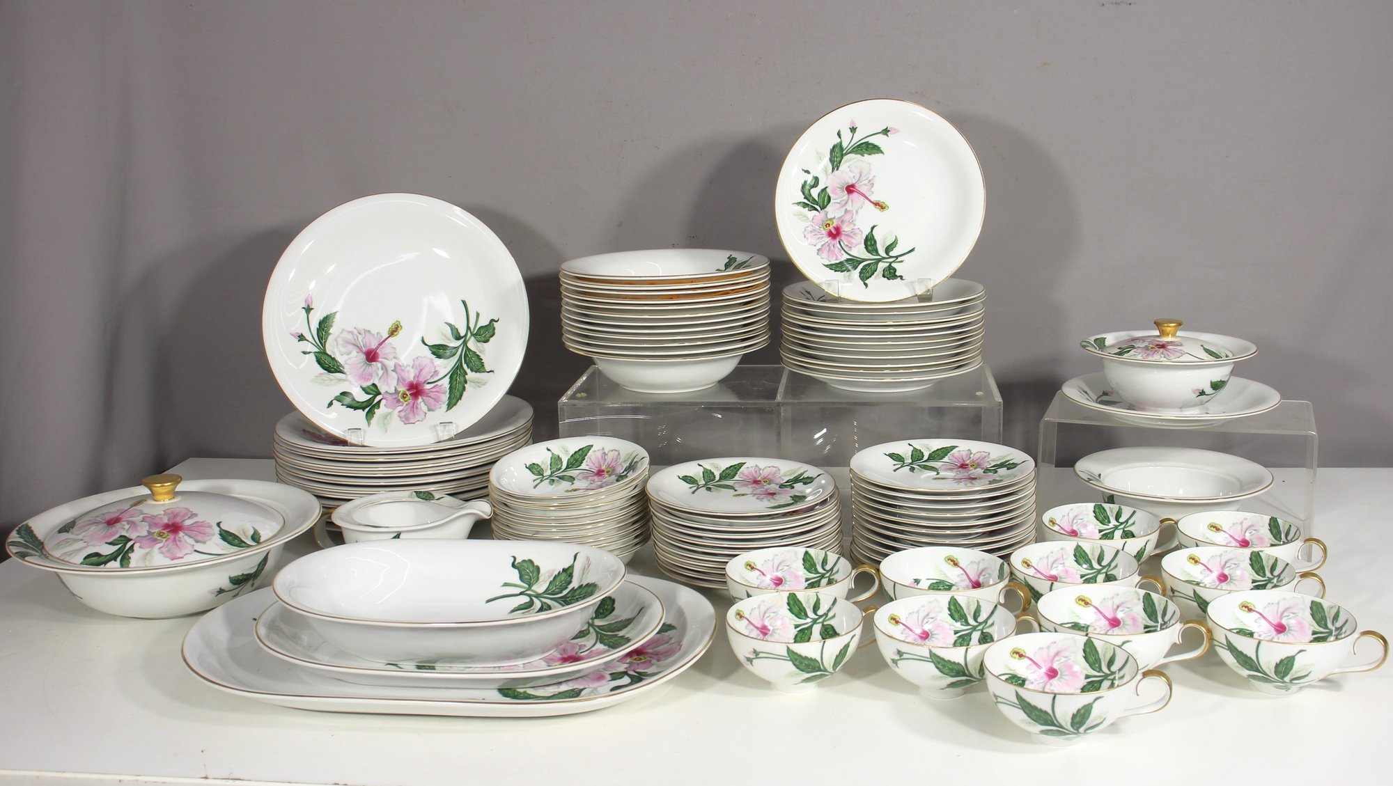 partial dinnerware set by Newcrest China, Japan, features the beautiful "Sonata" pattern, adorned with delicate pink hibiscus flowers, green leaves, and gold trim. A timeless and classic design, perfect for formal dining or display.