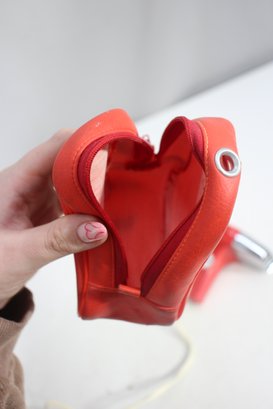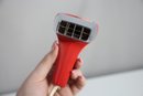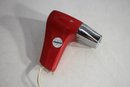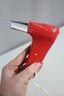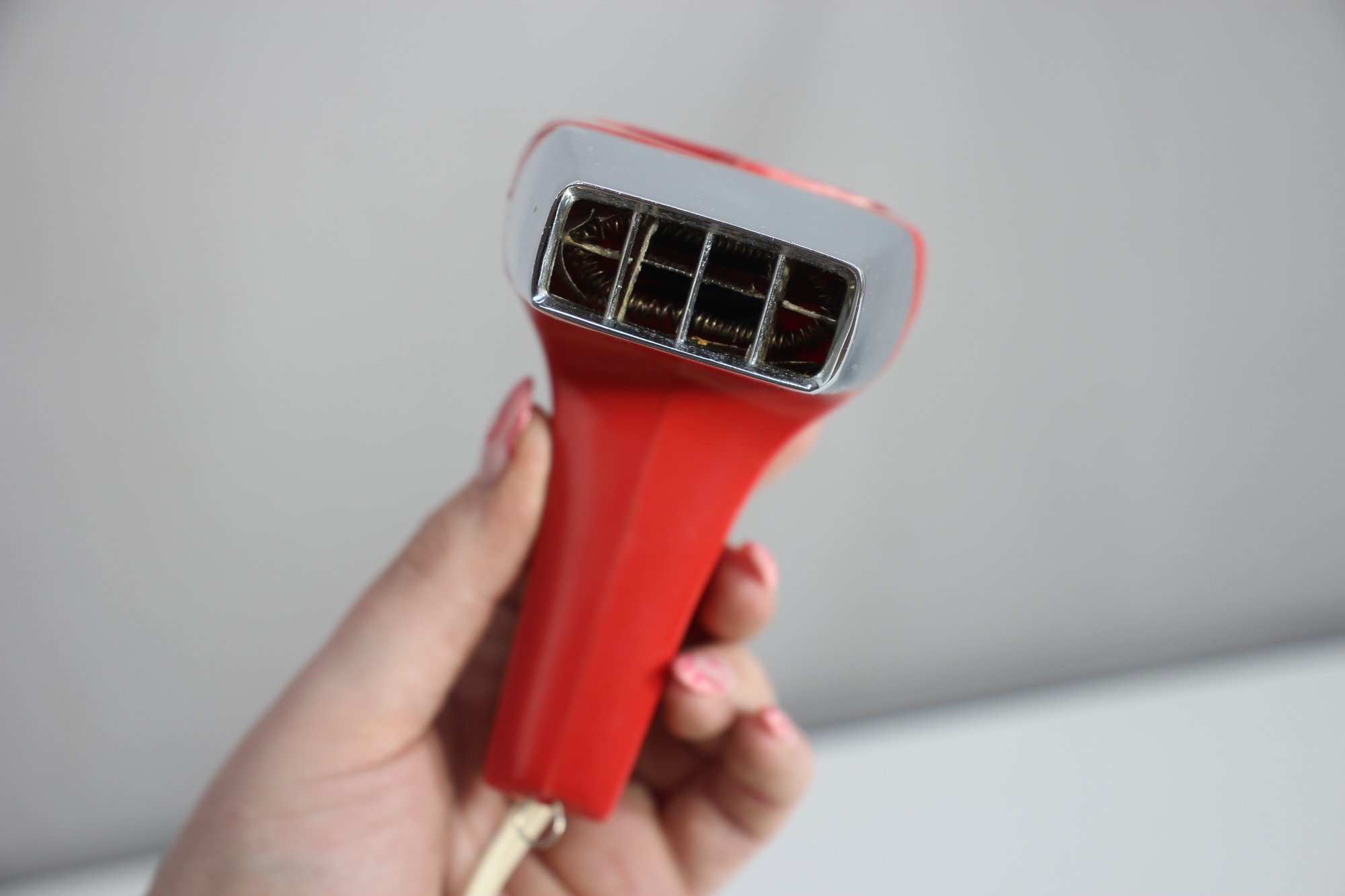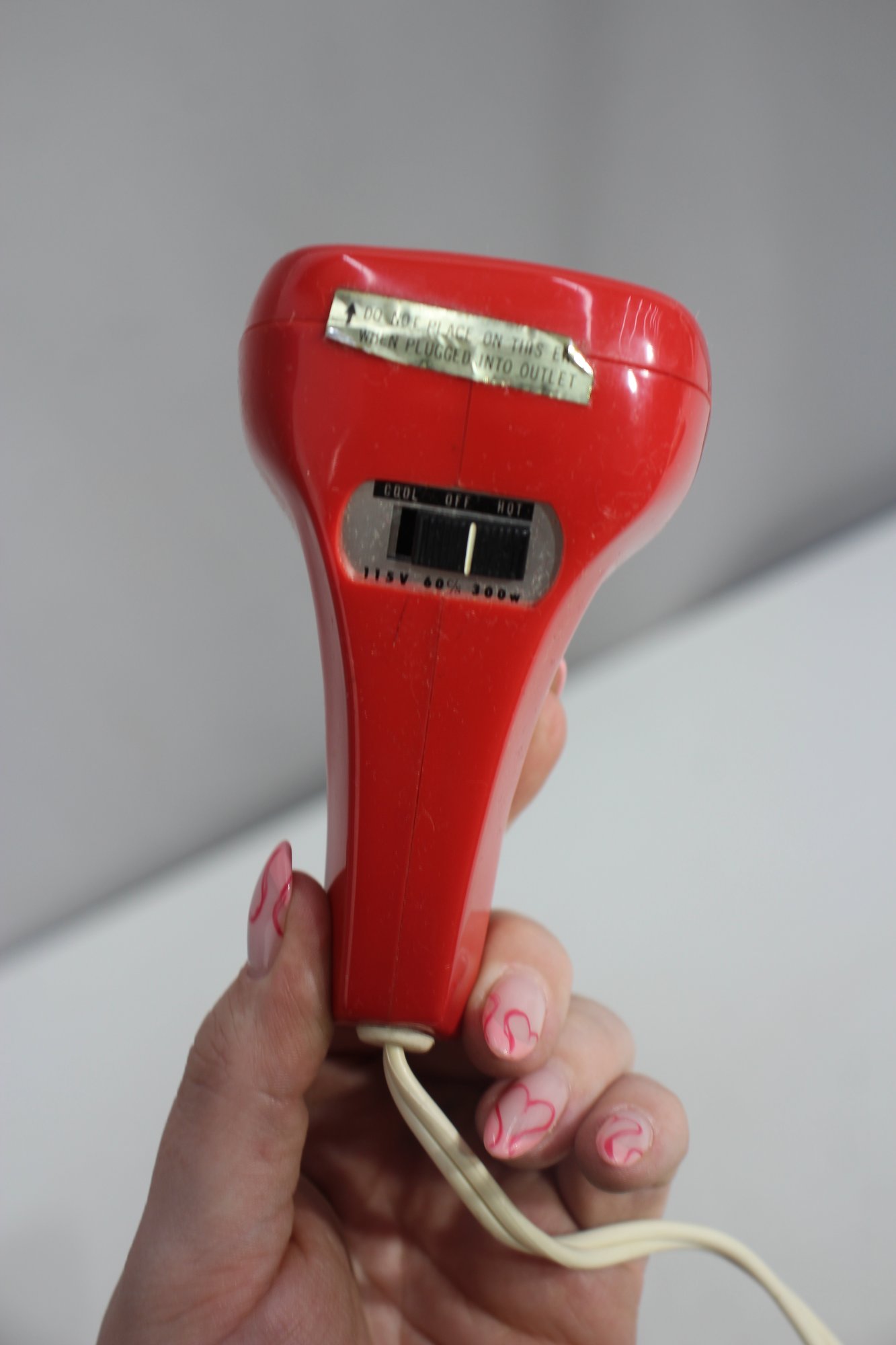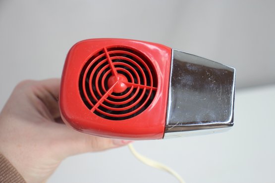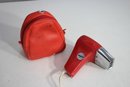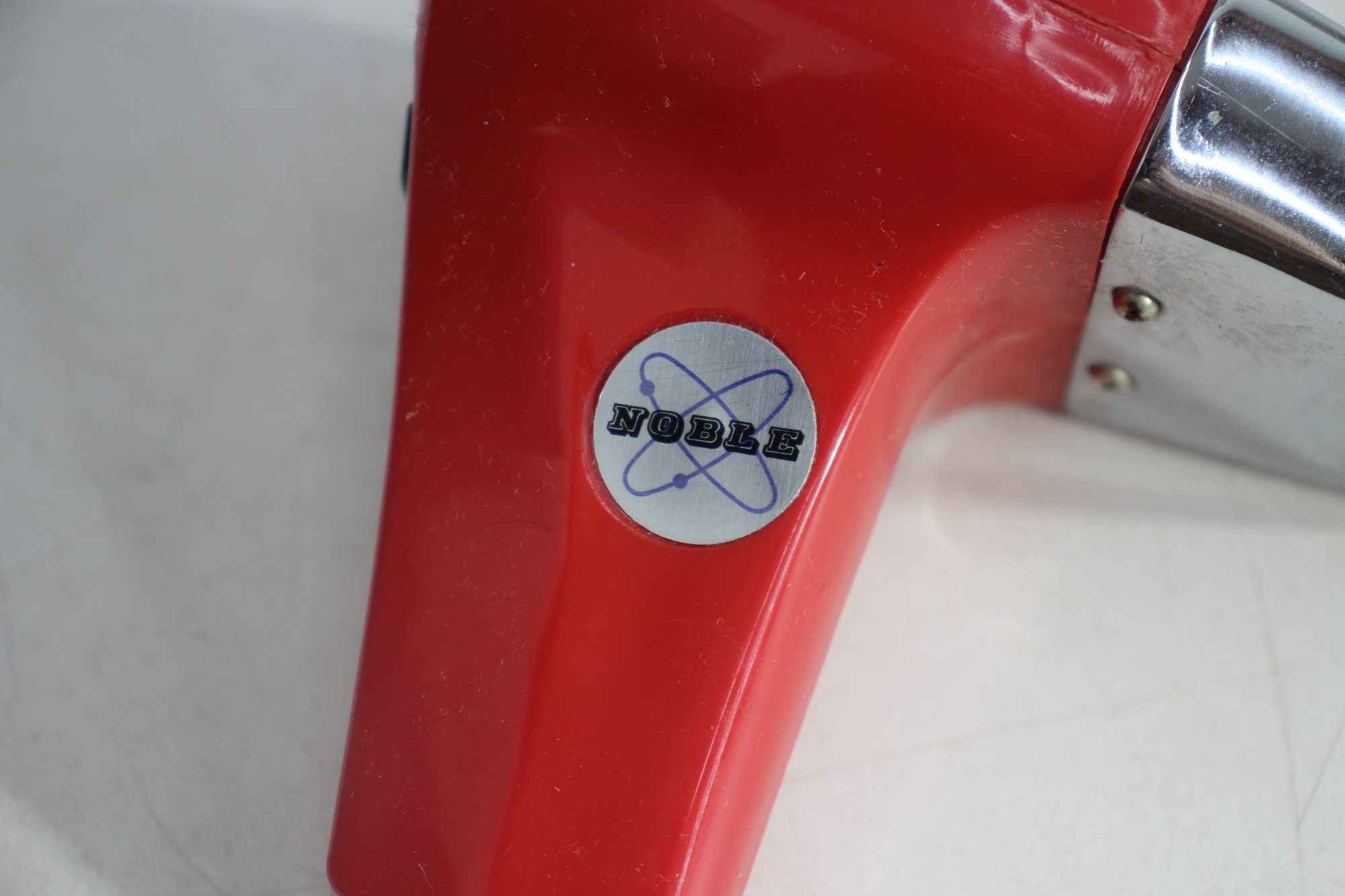 This vintage Noble travel hair dryer is a stylish and compact beauty tool, featuring a bold red plastic body with chrome accents. The retro design is complemented by the original red zippered carrying case, making it a great collectible or functional piece for vintage enthusiasts.