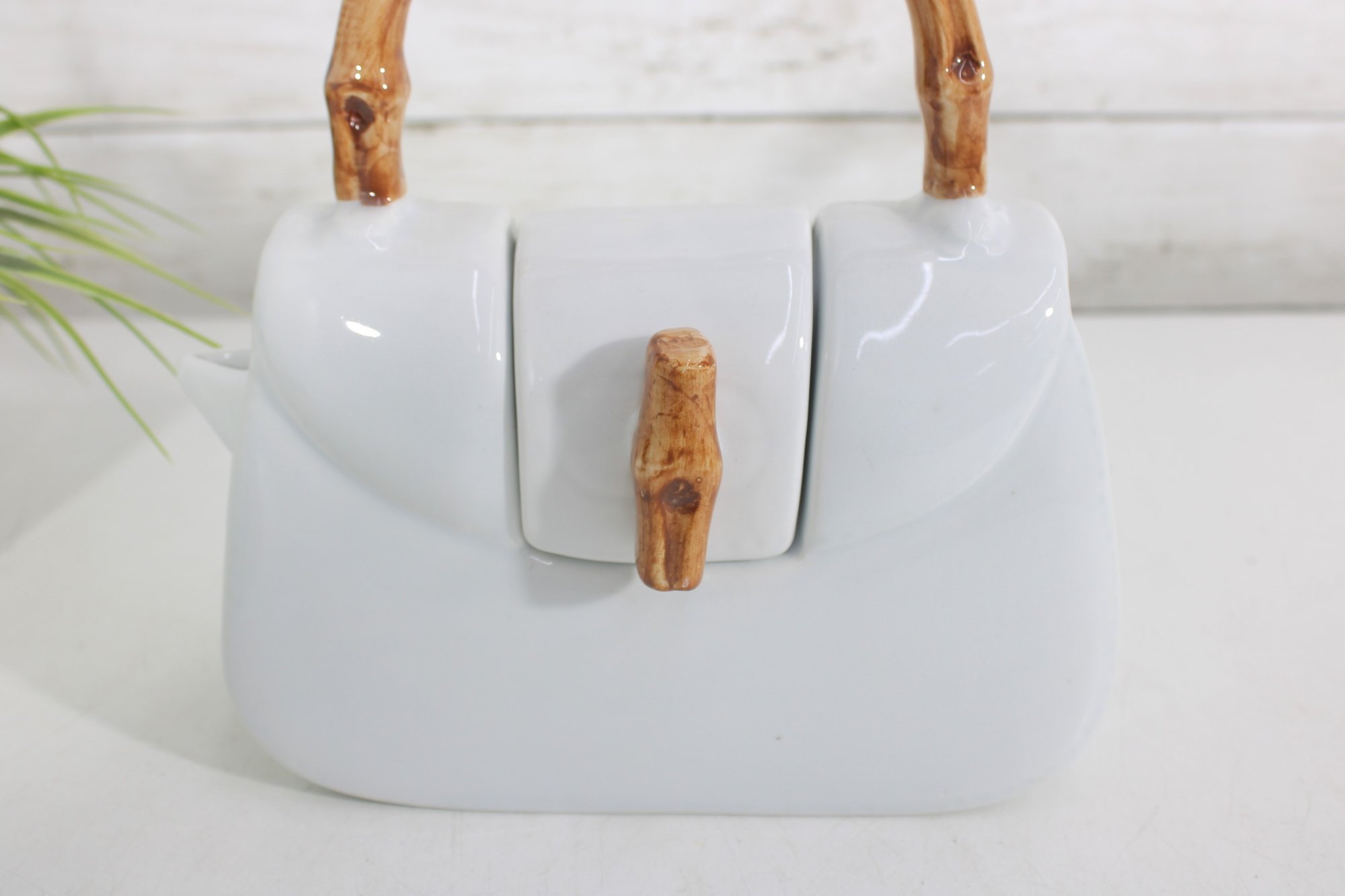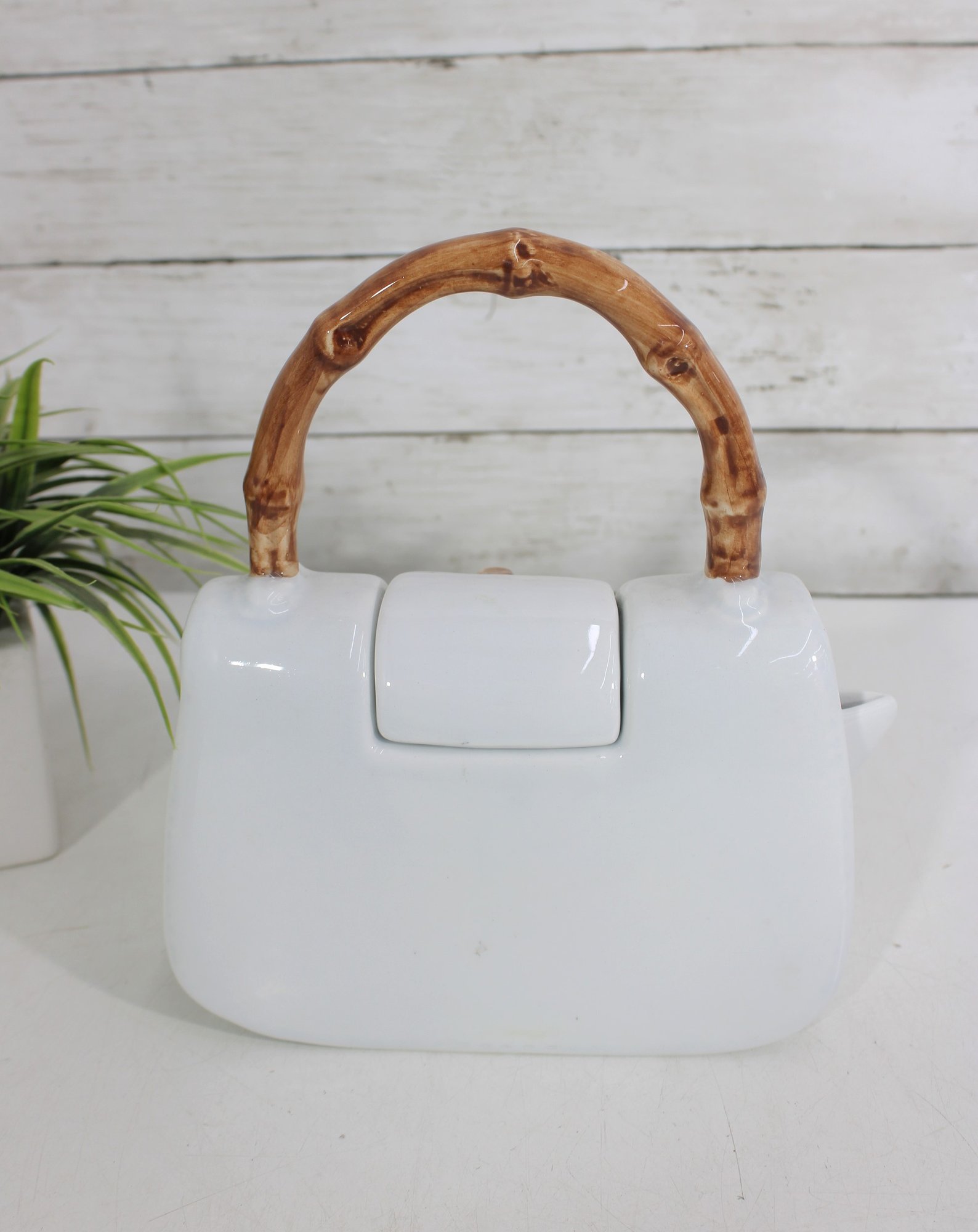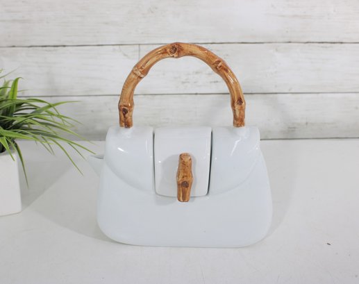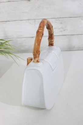 Measuring approximately 9 inches tall, this teapot combines functionality with playful design. The lid opens from the top, and the spout is cleverly integrated into the side, maintaining the purse-like appearance. The faux bamboo accents add a natural touch and contrast beautifully with the sleek white body.