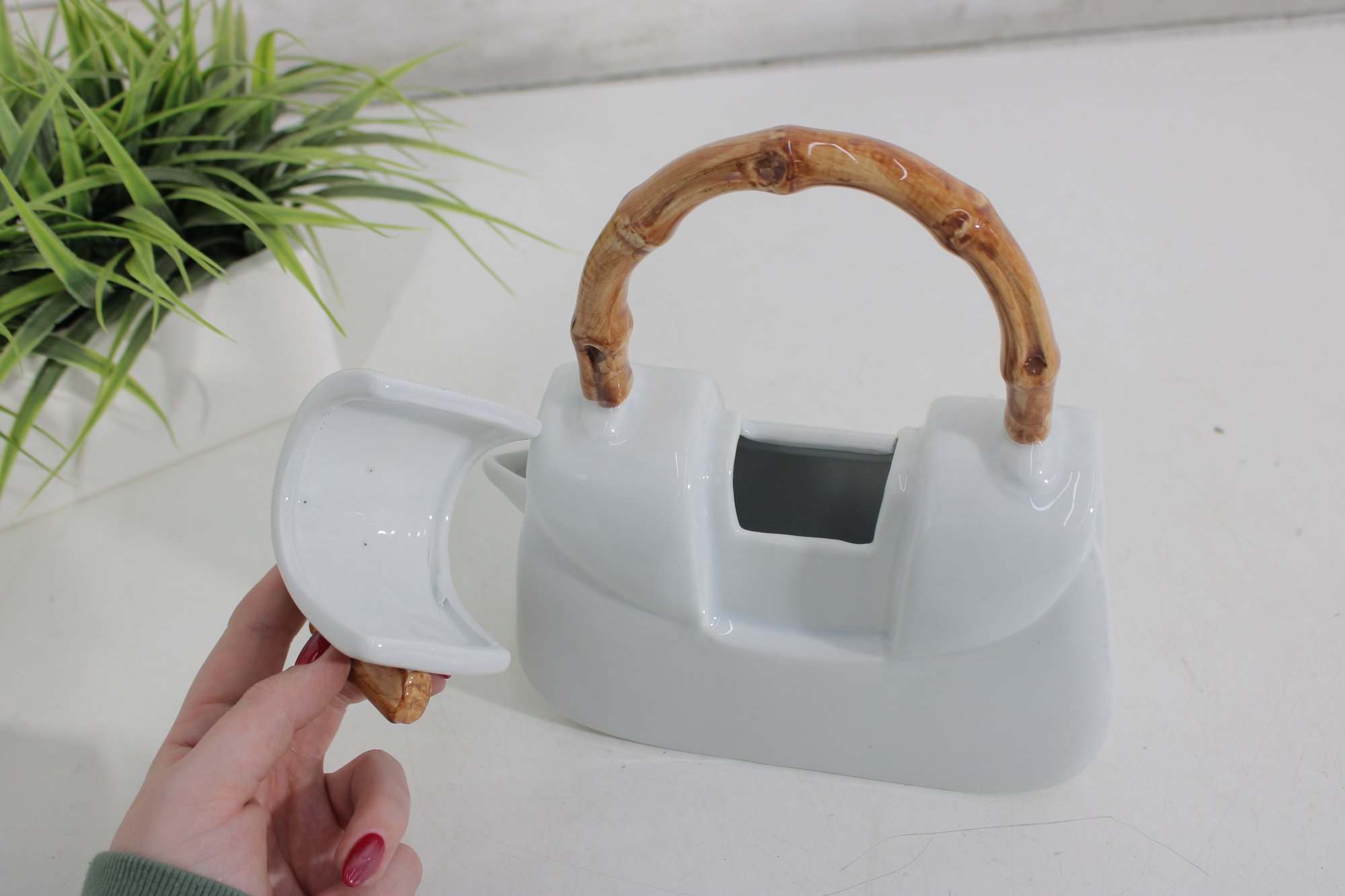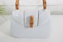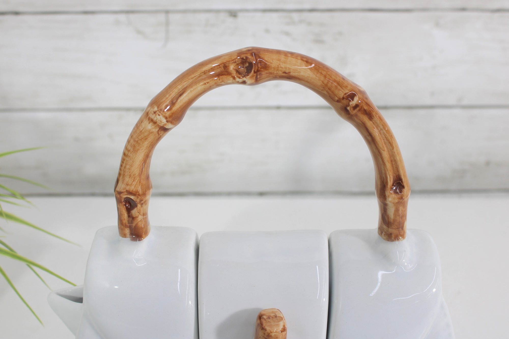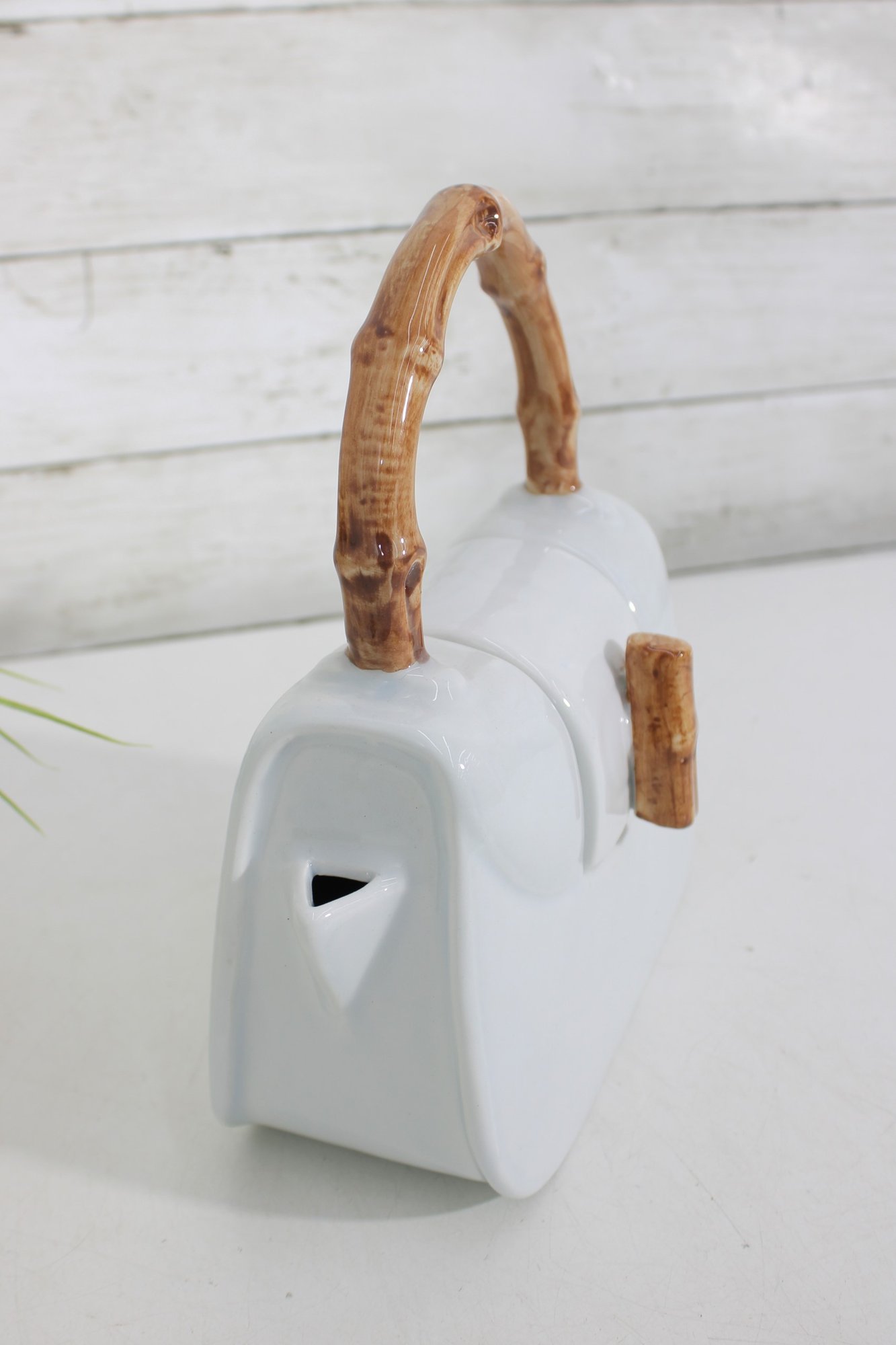 Measuring approximately 9 inches tall, this teapot combines functionality with playful design. The lid opens from the top, and the spout is cleverly integrated into the side, maintaining the purse-like appearance. The faux bamboo accents add a natural touch and contrast beautifully with the sleek white body.