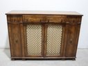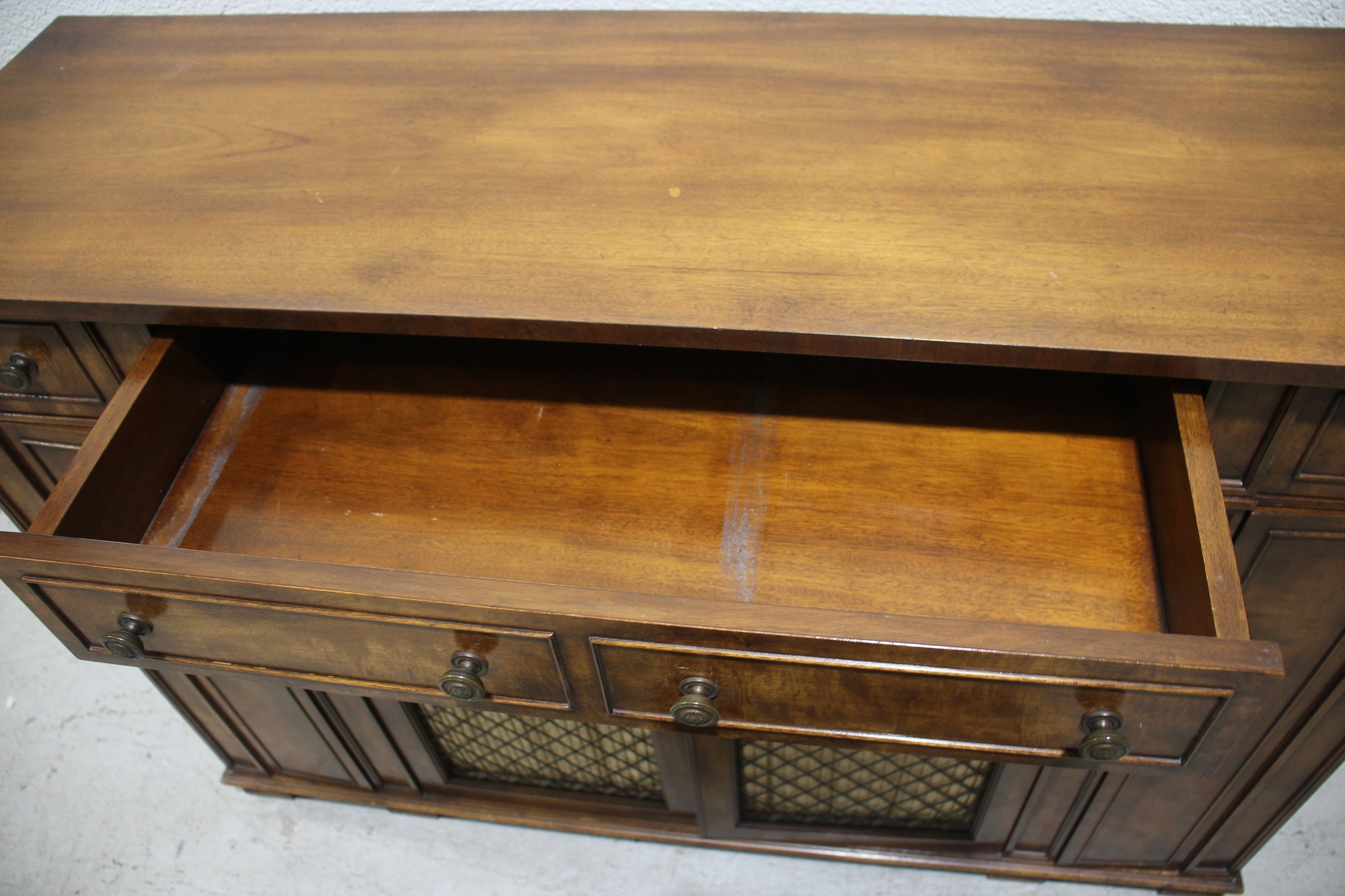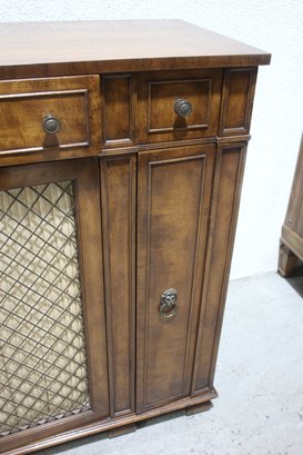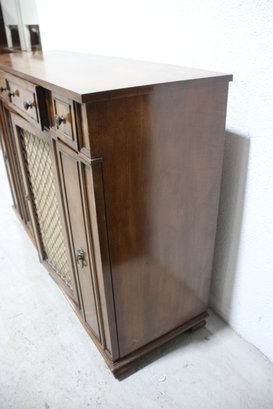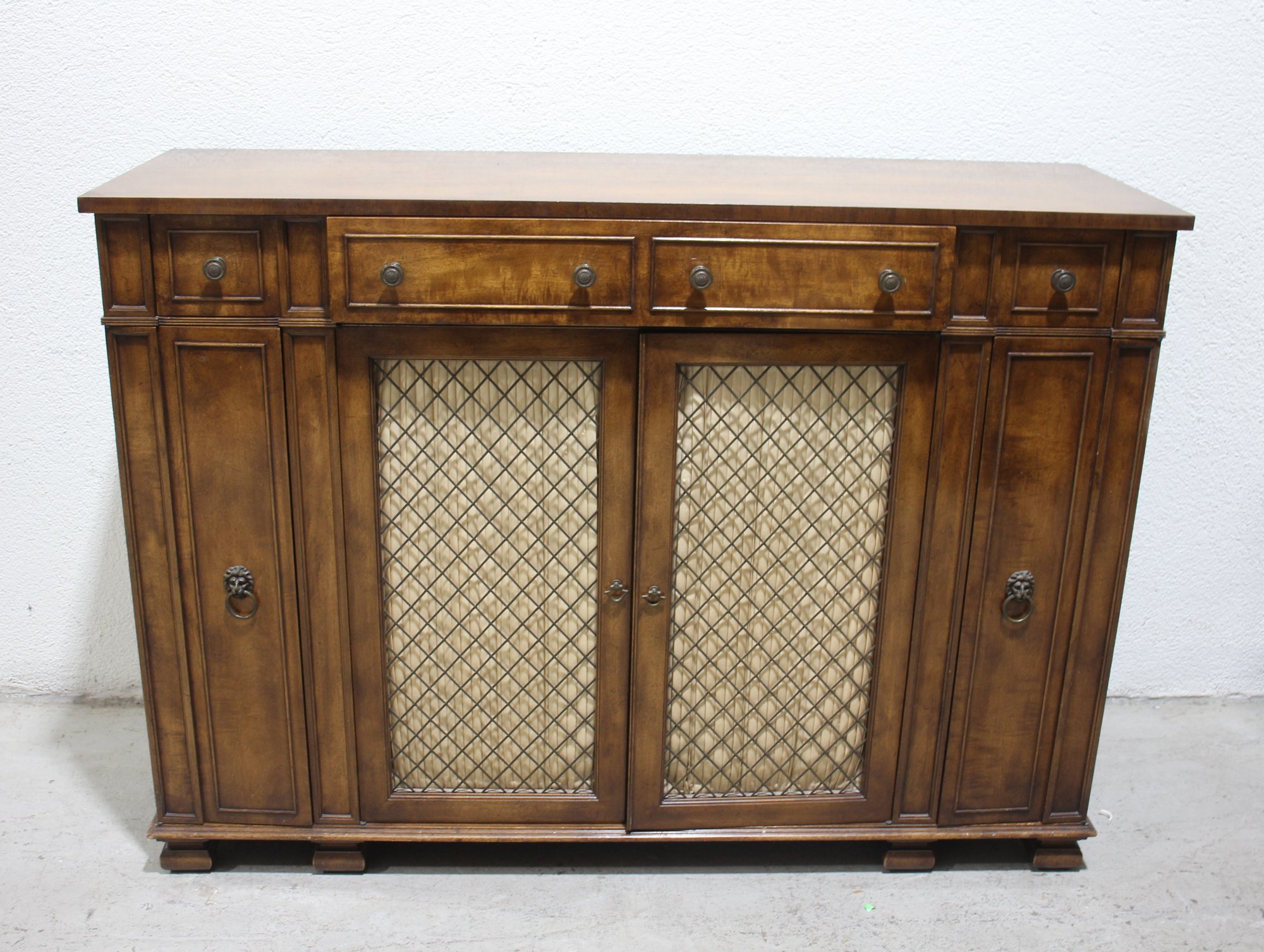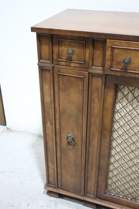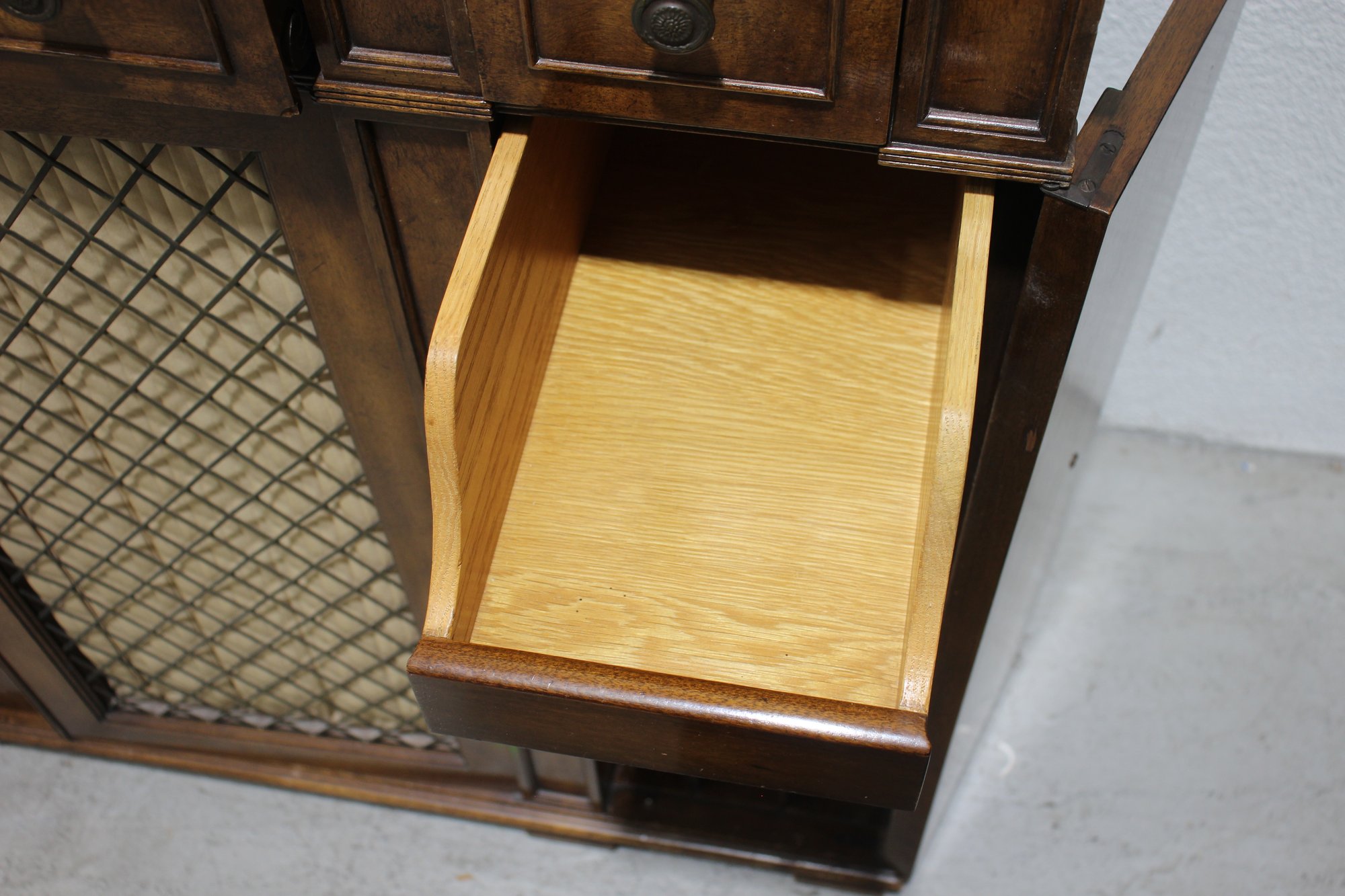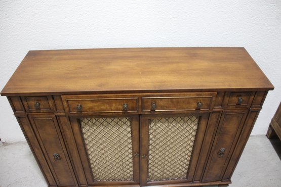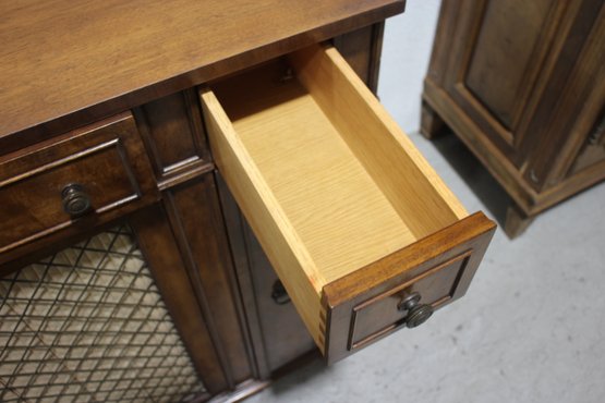 This beautiful vintage sideboard buffet by O.C.F. (Old Colony Furniture Co.) combines classic elegance with functional storage. Measuring 37.5”H x 52”W x 16.5”D, this solid wood piece features a rich warm finish, ornate metal mesh front doors, and multiple drawers and cabinets for versatile storage.