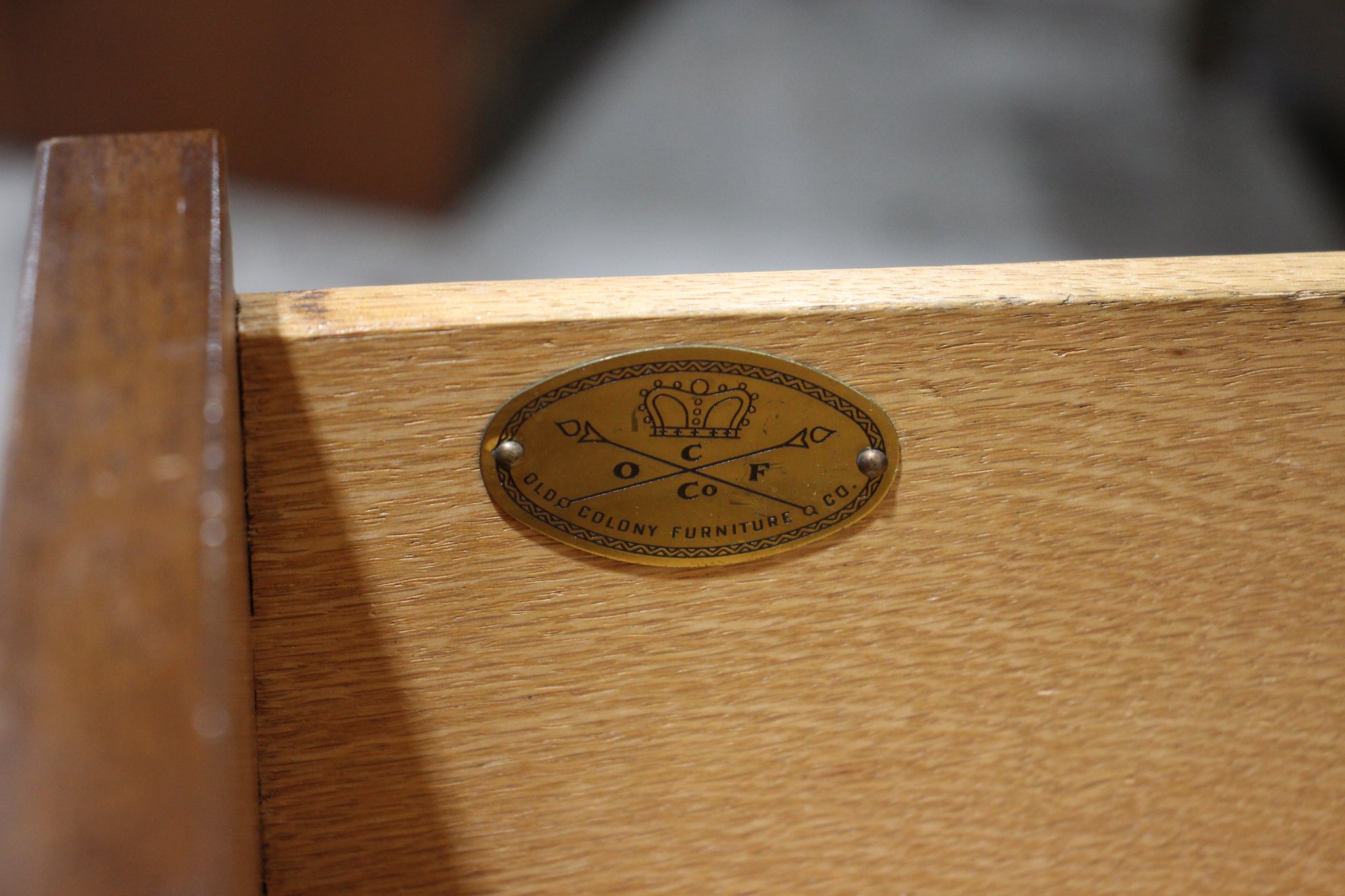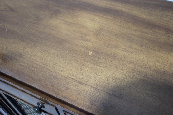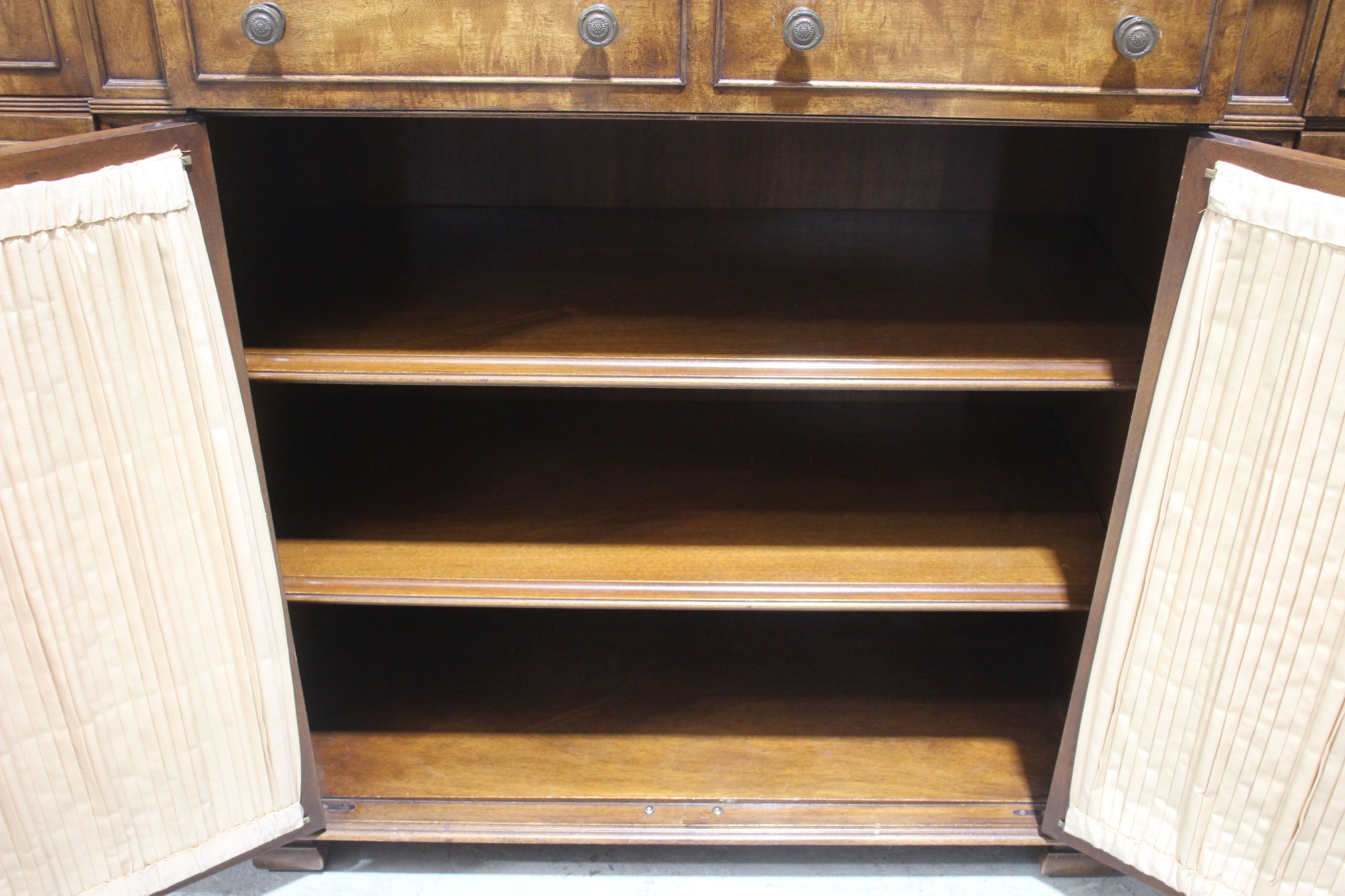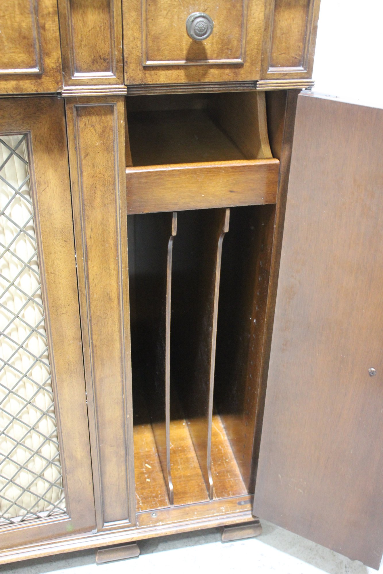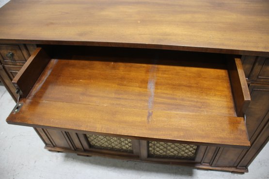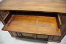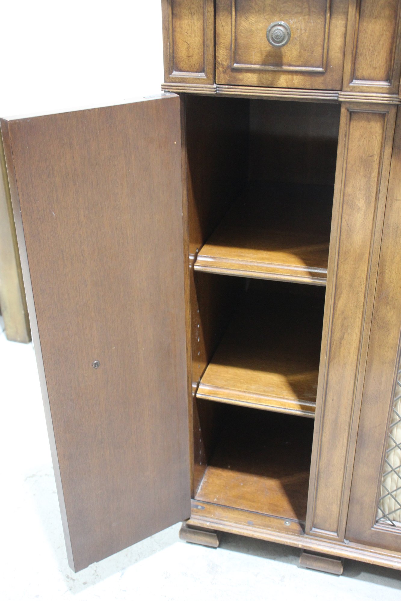 This beautiful vintage sideboard buffet by O.C.F. (Old Colony Furniture Co.) combines classic elegance with functional storage. Measuring 37.5”H x 52”W x 16.5”D, this solid wood piece features a rich warm finish, ornate metal mesh front doors, and multiple drawers and cabinets for versatile storage.