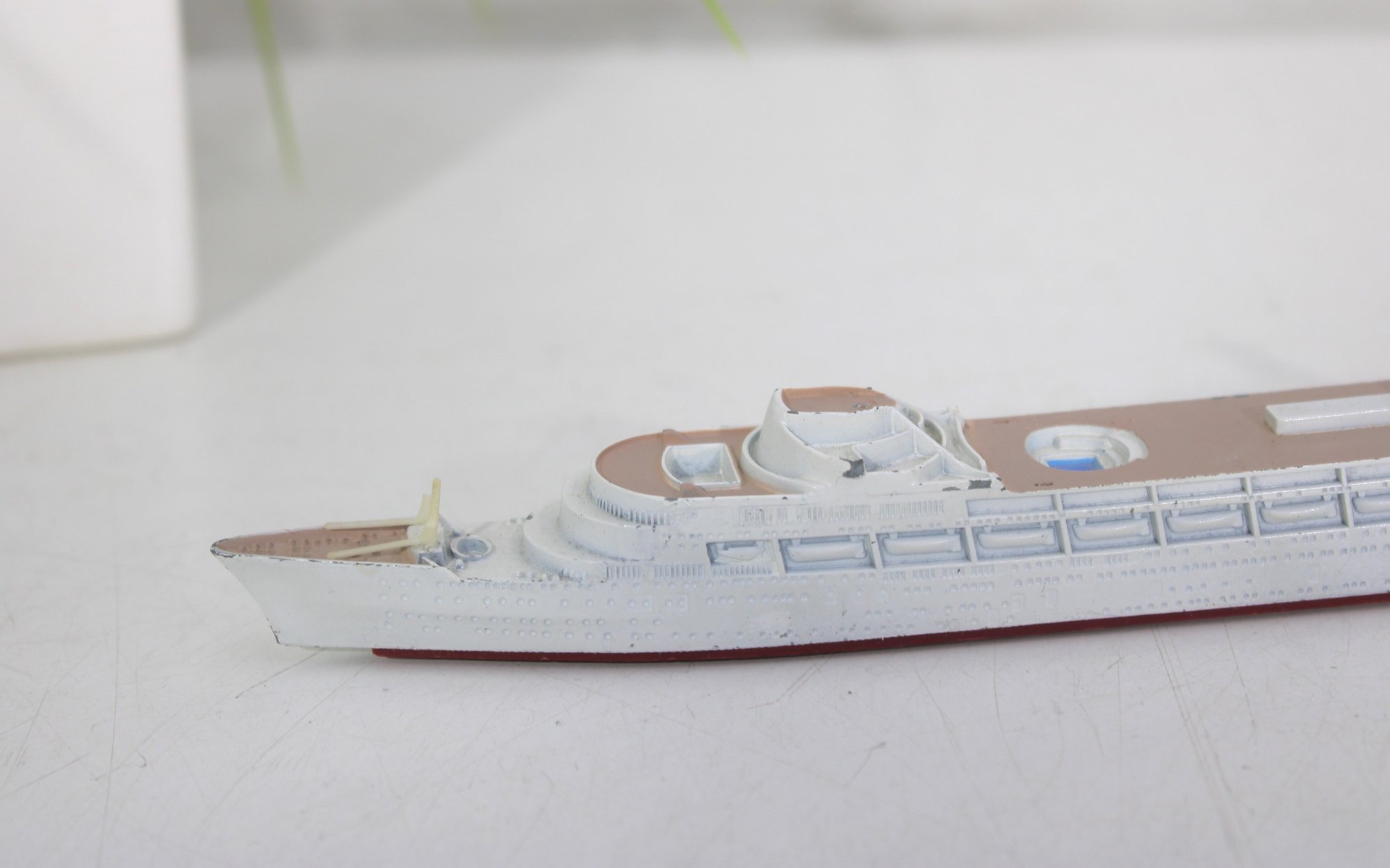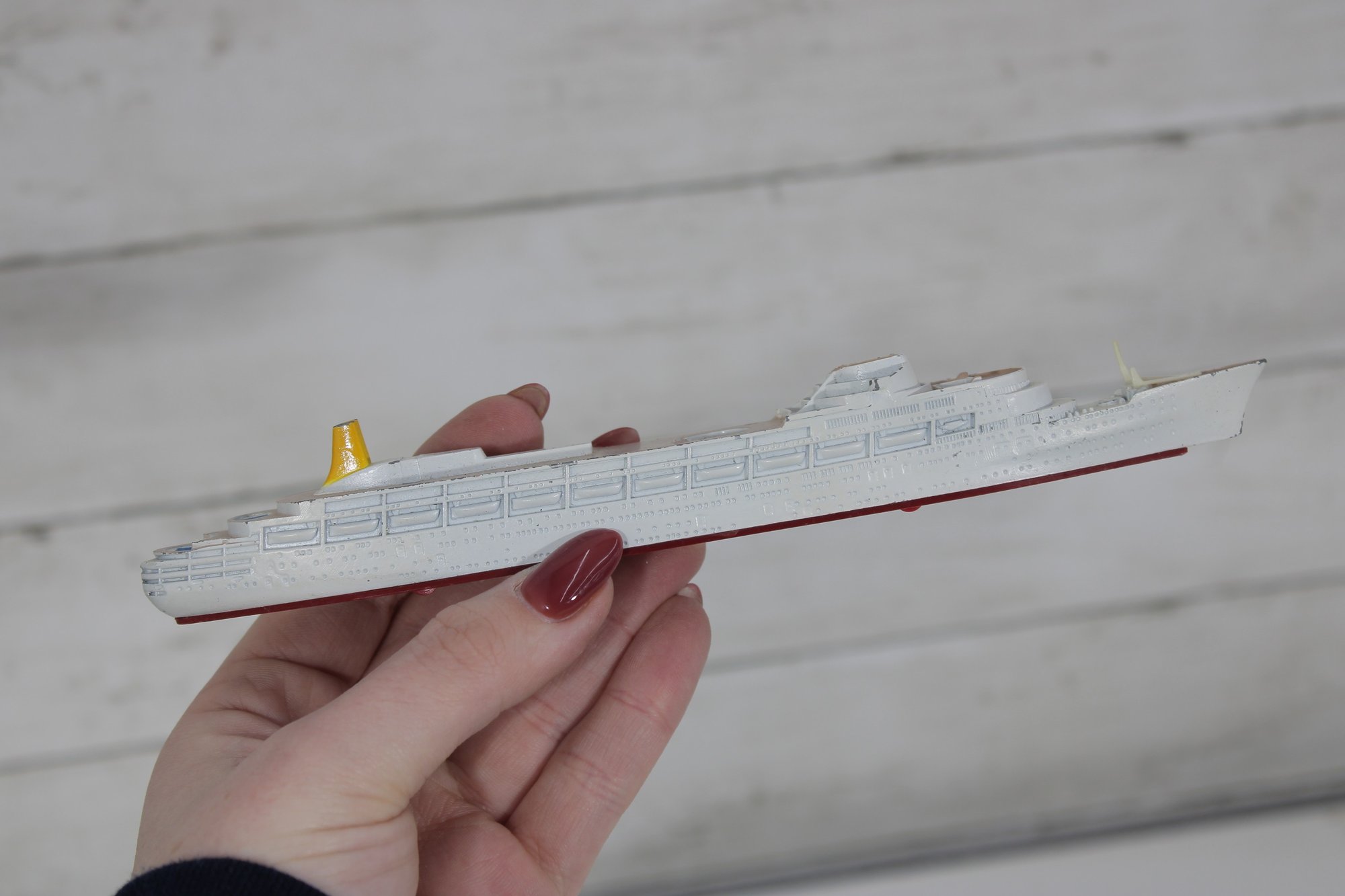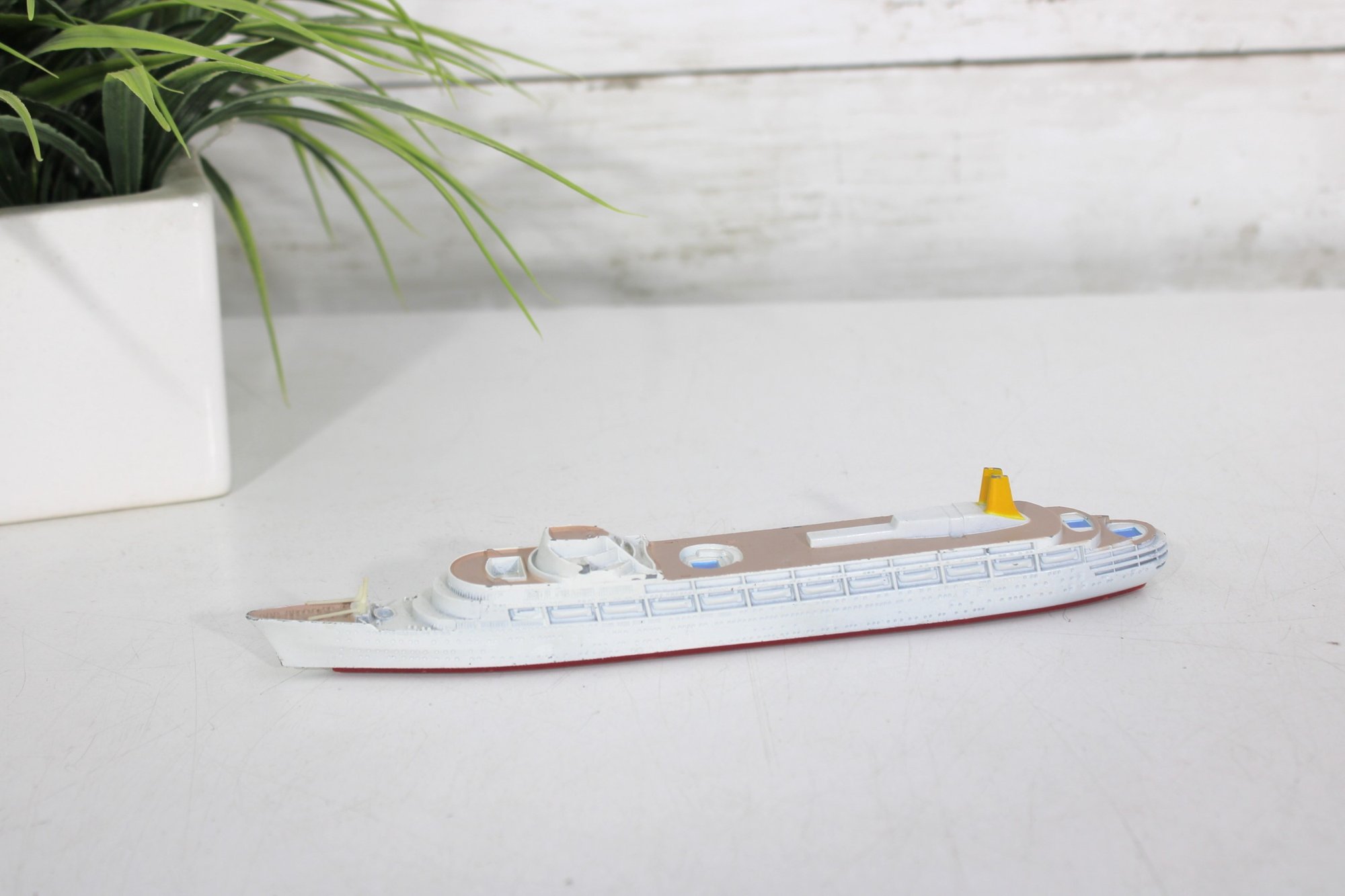 The model includes molded deck details such as lifeboats, cabin structures, and railings, giving it nice dimension and character for its size. Perfect for display on a shelf, desk, or within a nautical-themed collection.