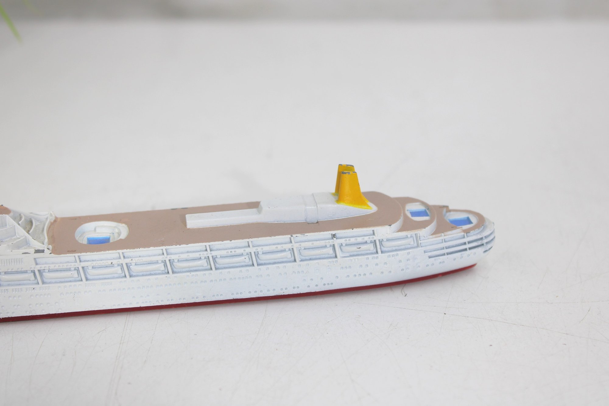 This classic passenger ship features a white hull with fine window detailing, tan deck surfaces, and a bright yellow smokestack. The streamlined design captures the elegance of mid-century ocean liners, making it a great decorative piece for maritime enthusiasts. Part of the Tri-ang Minic Ships