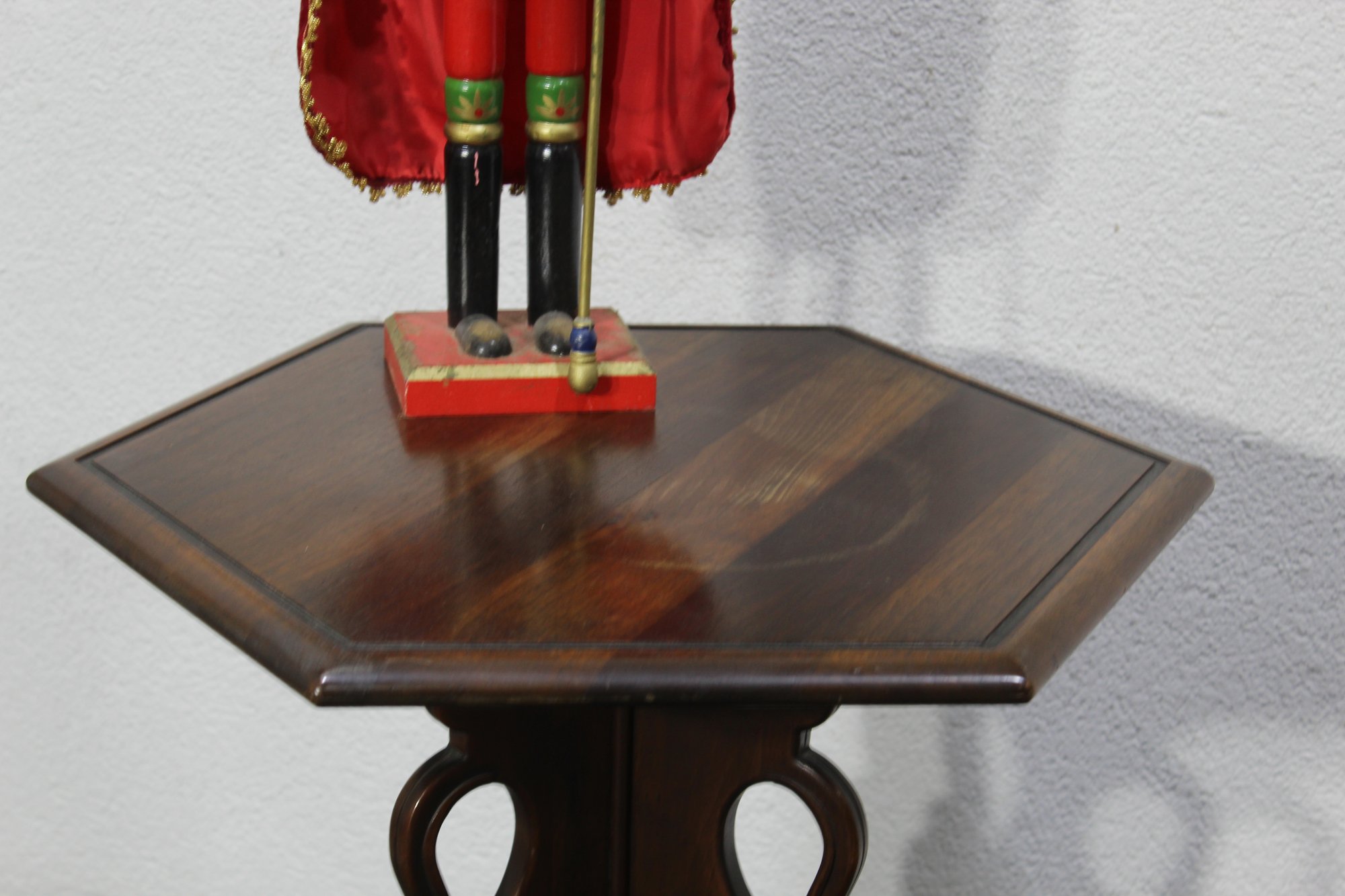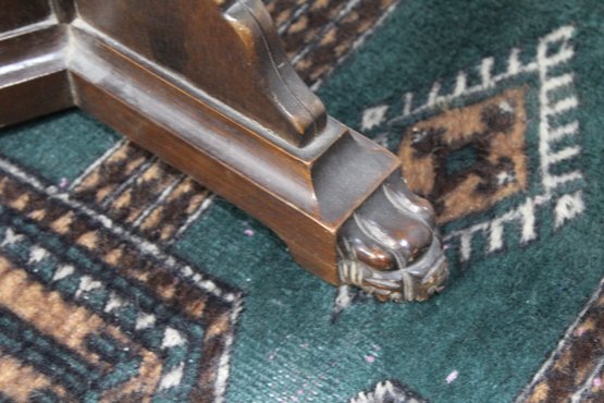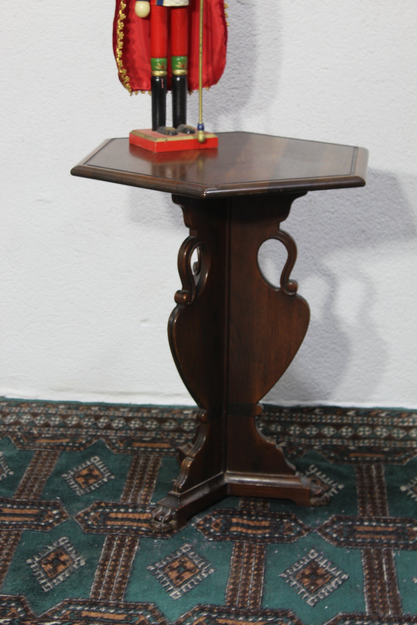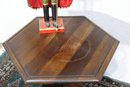 Add charm and elegance to your space with this vintage octagonal accent table. This piece features a unique hexagonal tabletop with subtle wood grain details and a warm, rich finish. The intricate pedestal base boasts carved details and claw-style feet, reflecting the craftsmanship of a bygone era.