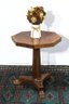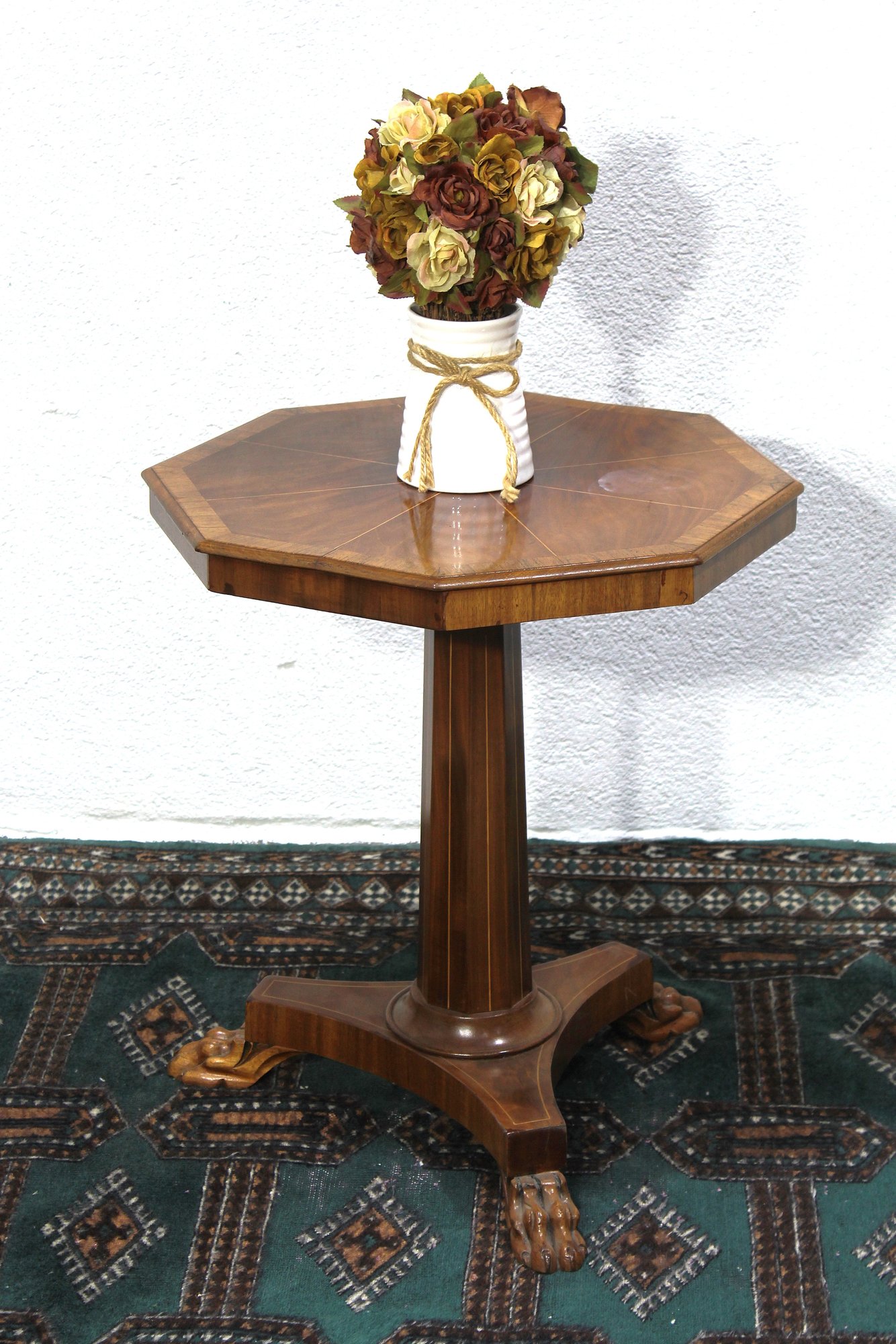This charming vintage octagonal pedestal side table is a true testament to classic craftsmanship. The table features a beautifully inlaid top with a starburst veneer pattern, offering an elegant aesthetic perfect for any living space. The pedestal base showcases intricate detailing, culminating in carved claw feet for a touch of timeless sophistication.