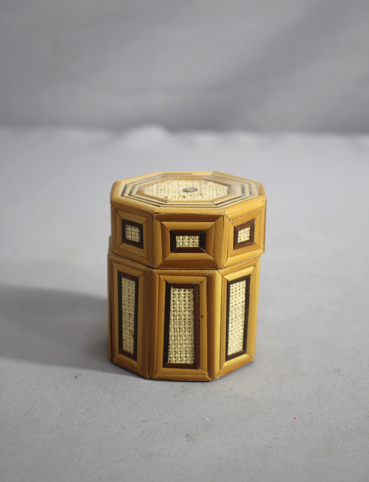 The box is constructed from finely finished wood, with each of the eight sides featuring a panel of woven rattan, giving it a textural contrast and a rustic aesthetic. The natural color of the rattan is preserved, offering a warm, earthy tone against the polished wooden frame.
