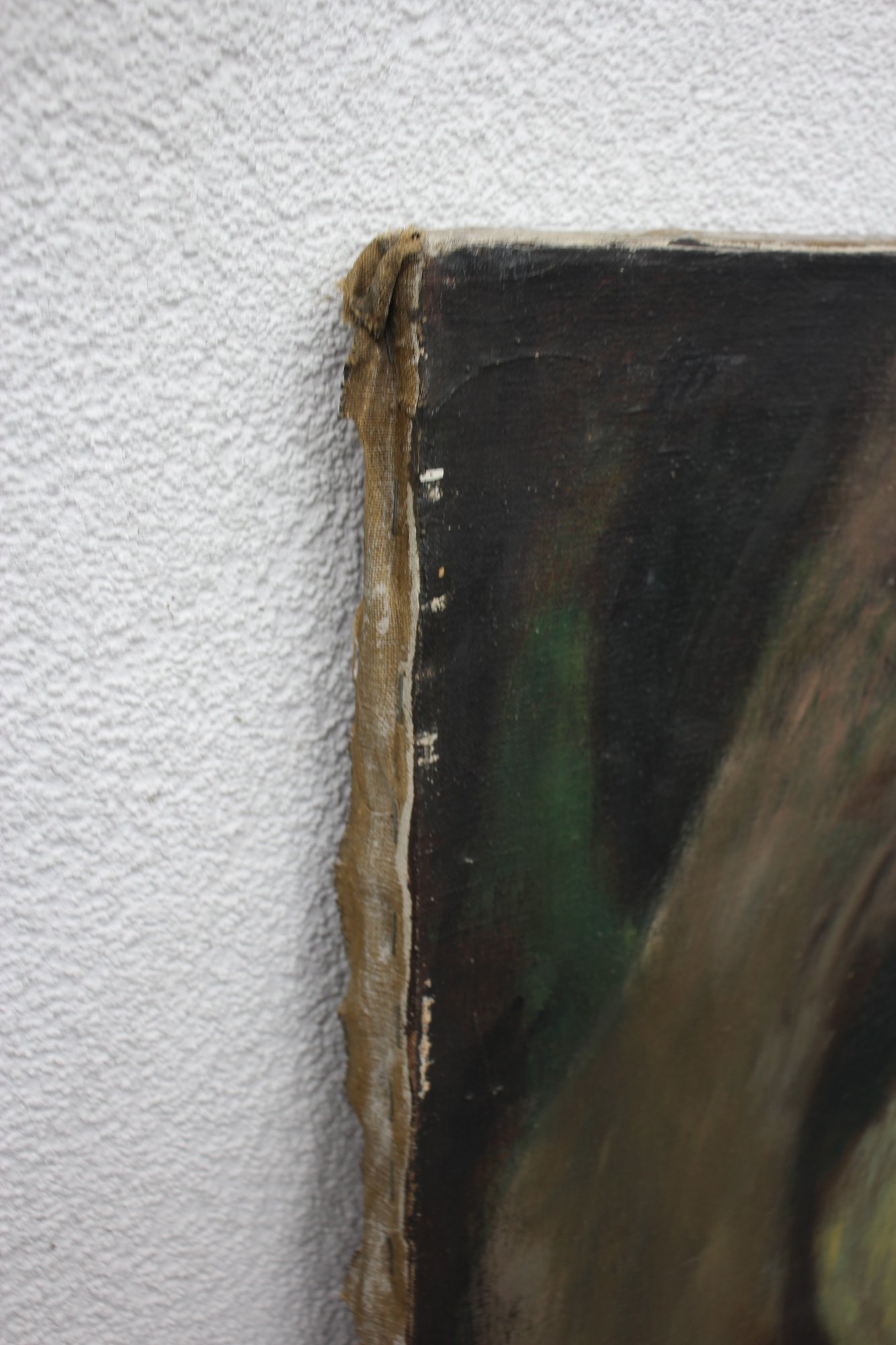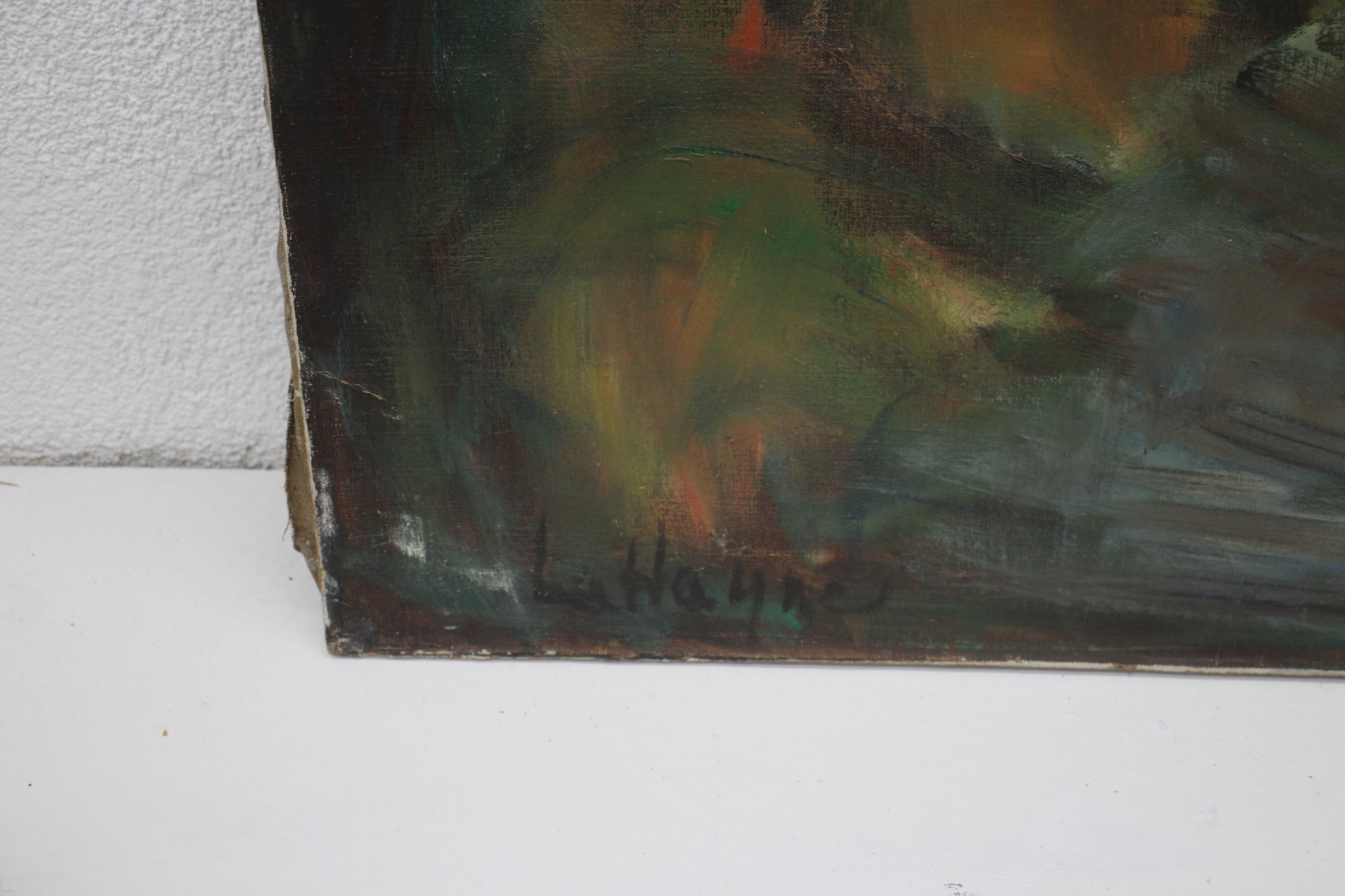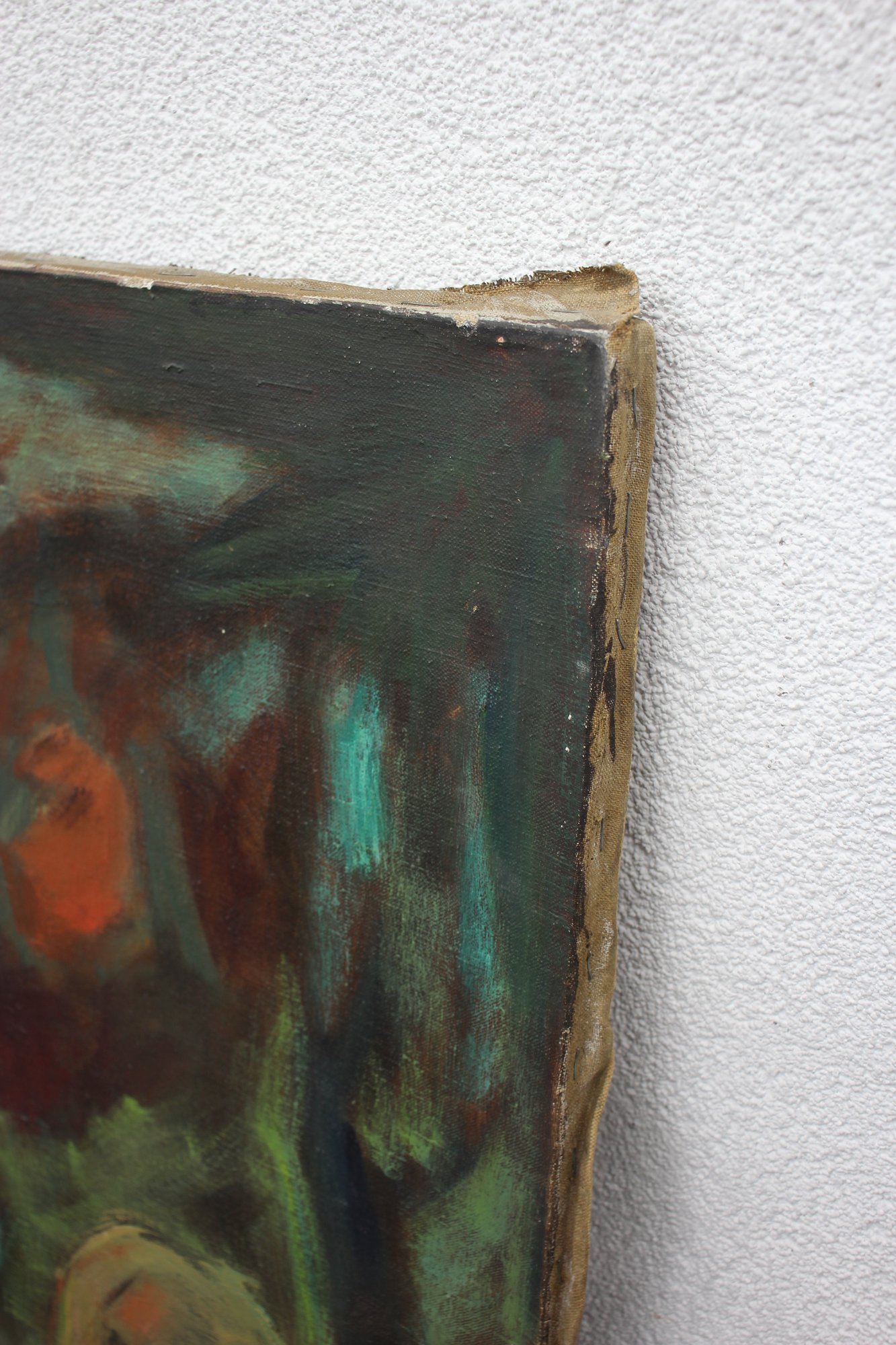 This intriguing vintage oil painting on canvas portrays an abstract depiction of a nude figure in a forest-like setting. The piece uses bold brushstrokes and a vivid, earthy color palette, creating a mysterious and emotional ambiance.
