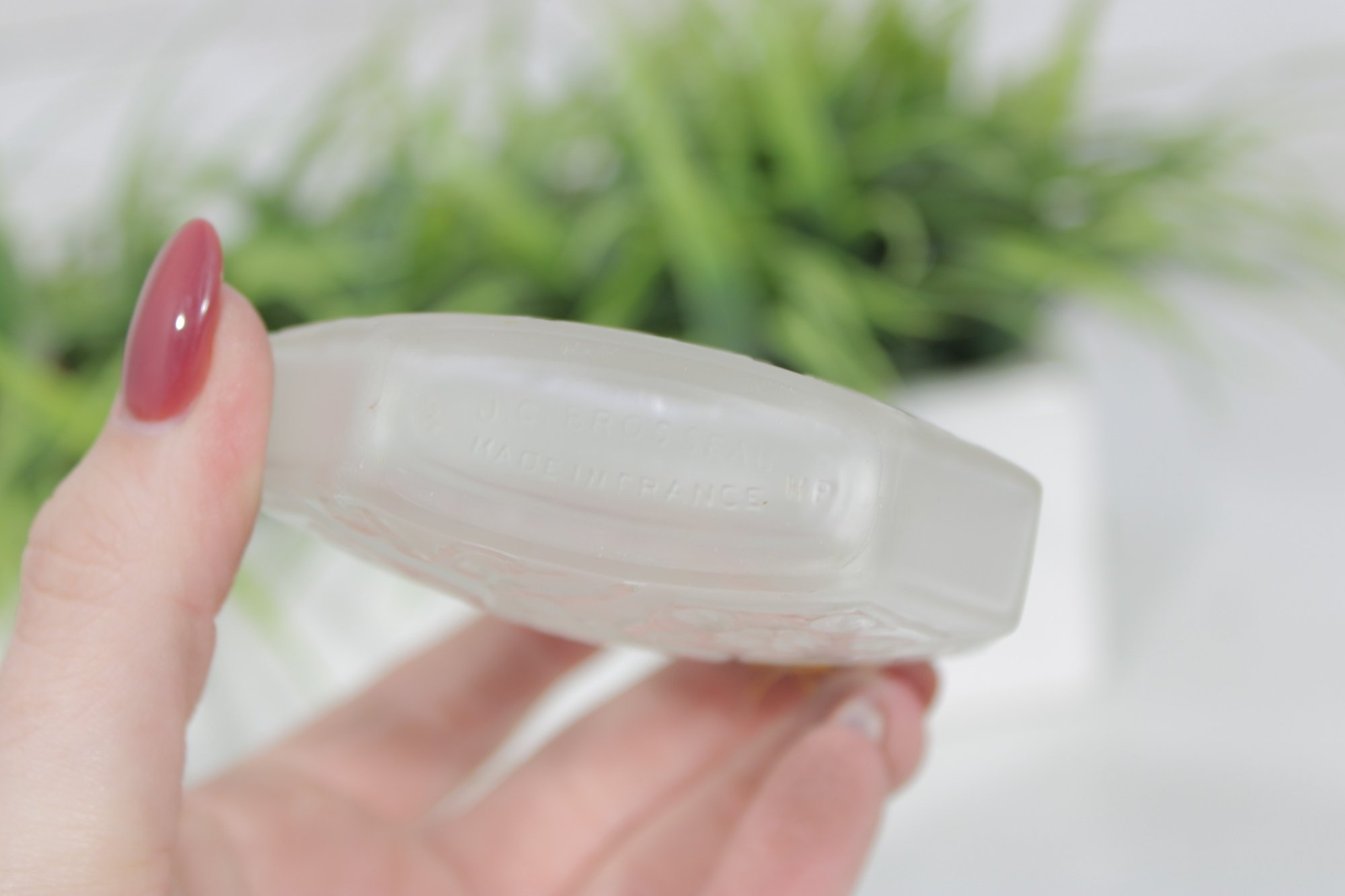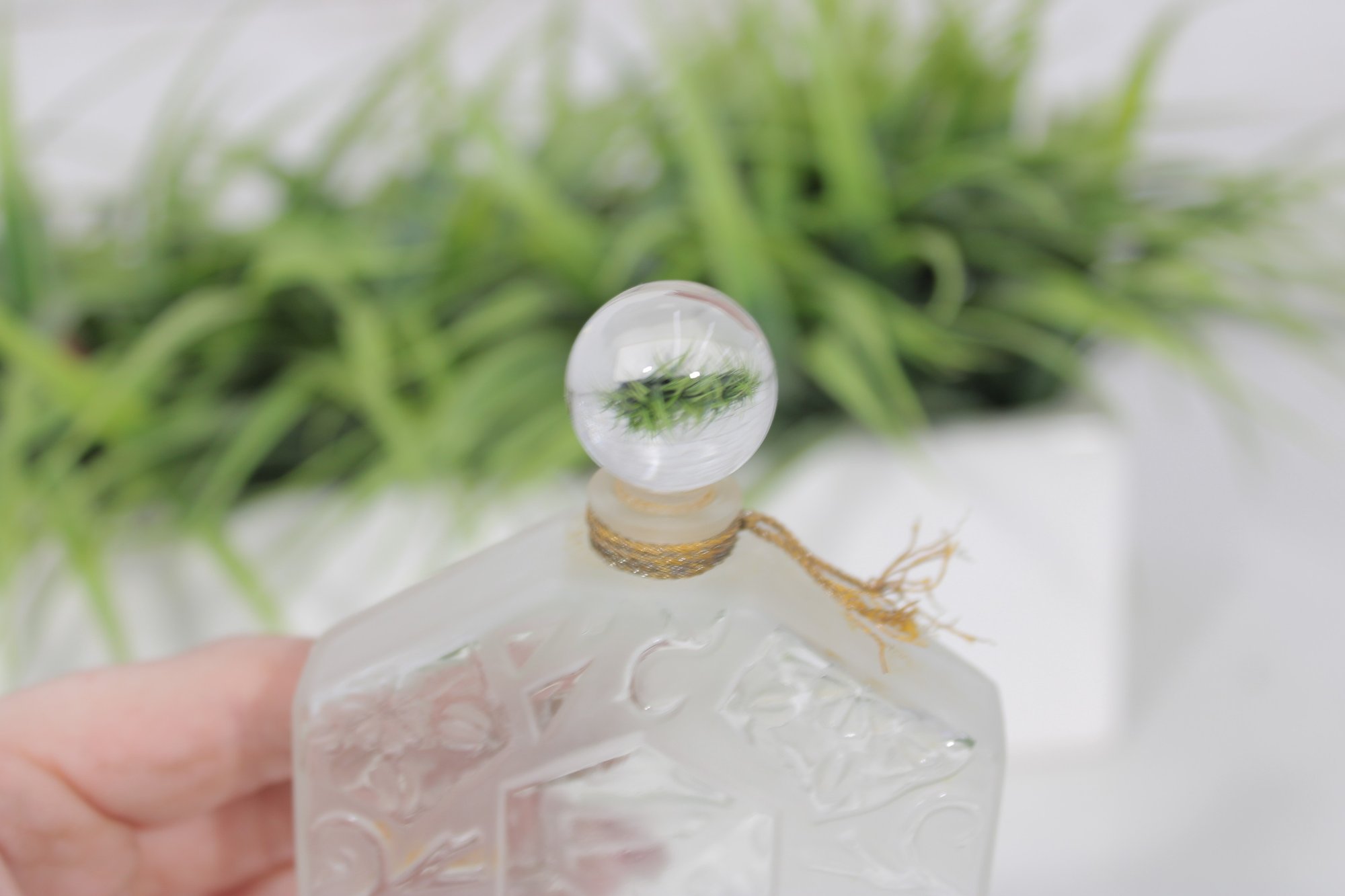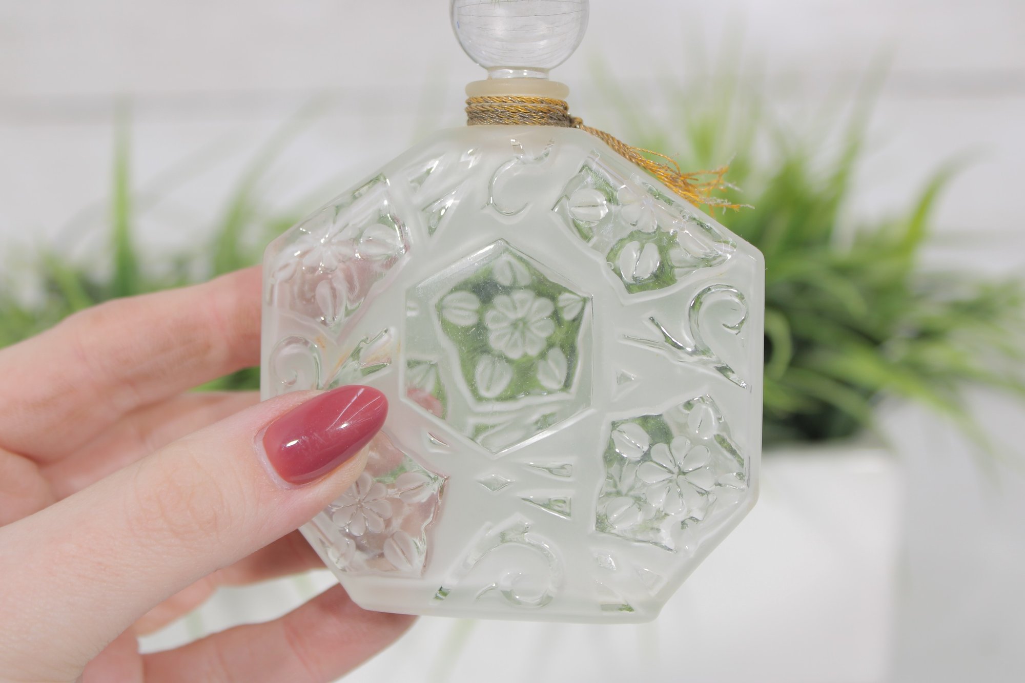 This iconic bottle features the classic hexagonal shape with raised floral relief panels and embossed “OMBRE ROSE” lettering across the front. The clear glass design highlights delicate flower detailing within the geometric panels. The original round glass stopper is included and features a decorative floral insert.