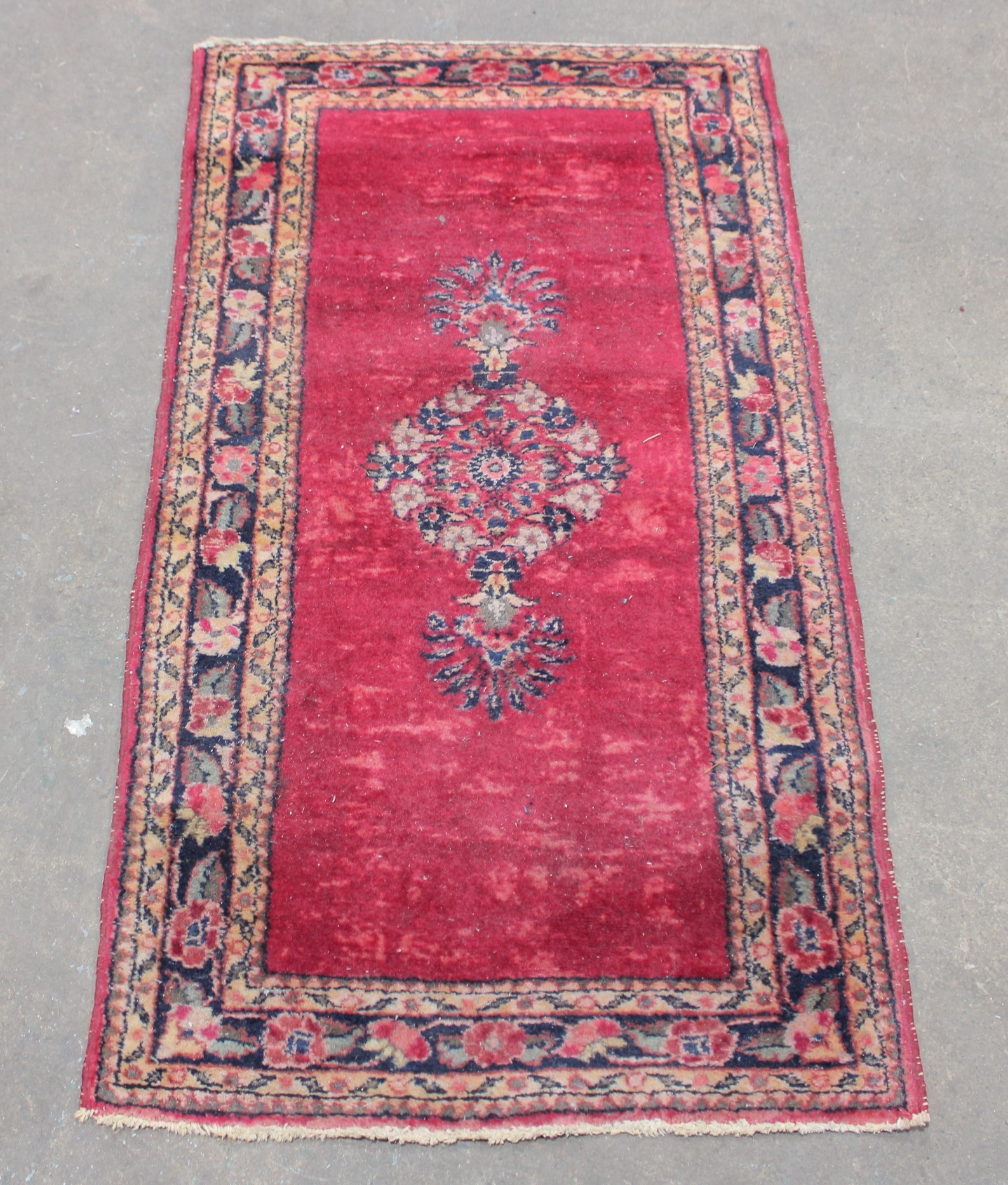 The rug’s simple yet elegant layout highlights the central ornament against a vibrant red ground, framed by a detailed floral border in complementary blue, ivory, and muted gold tones. Its smaller size makes it perfect for adding a touch of traditional character without overwhelming a space.