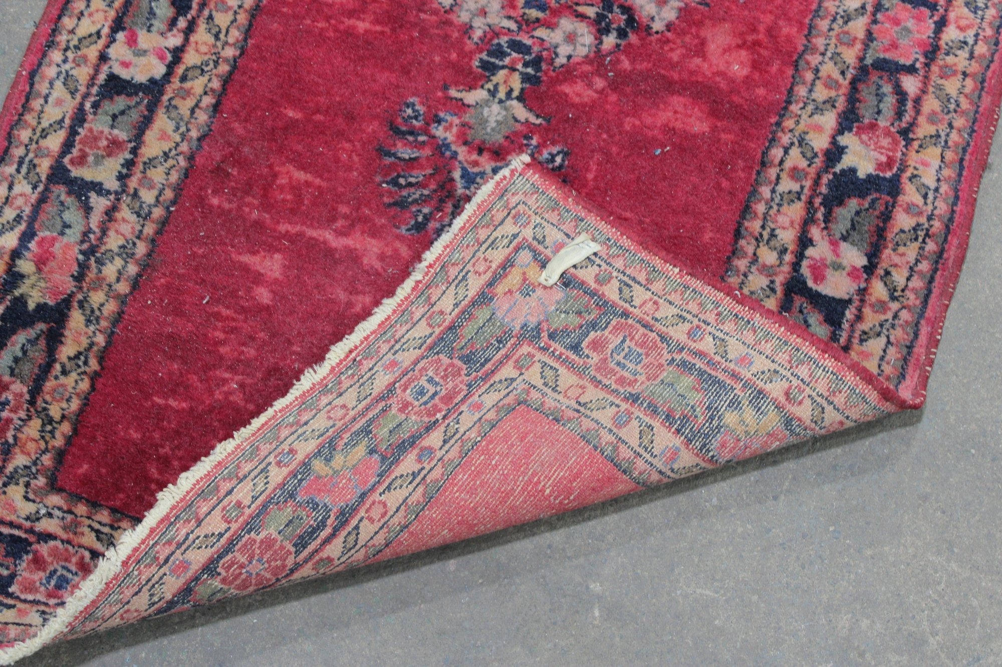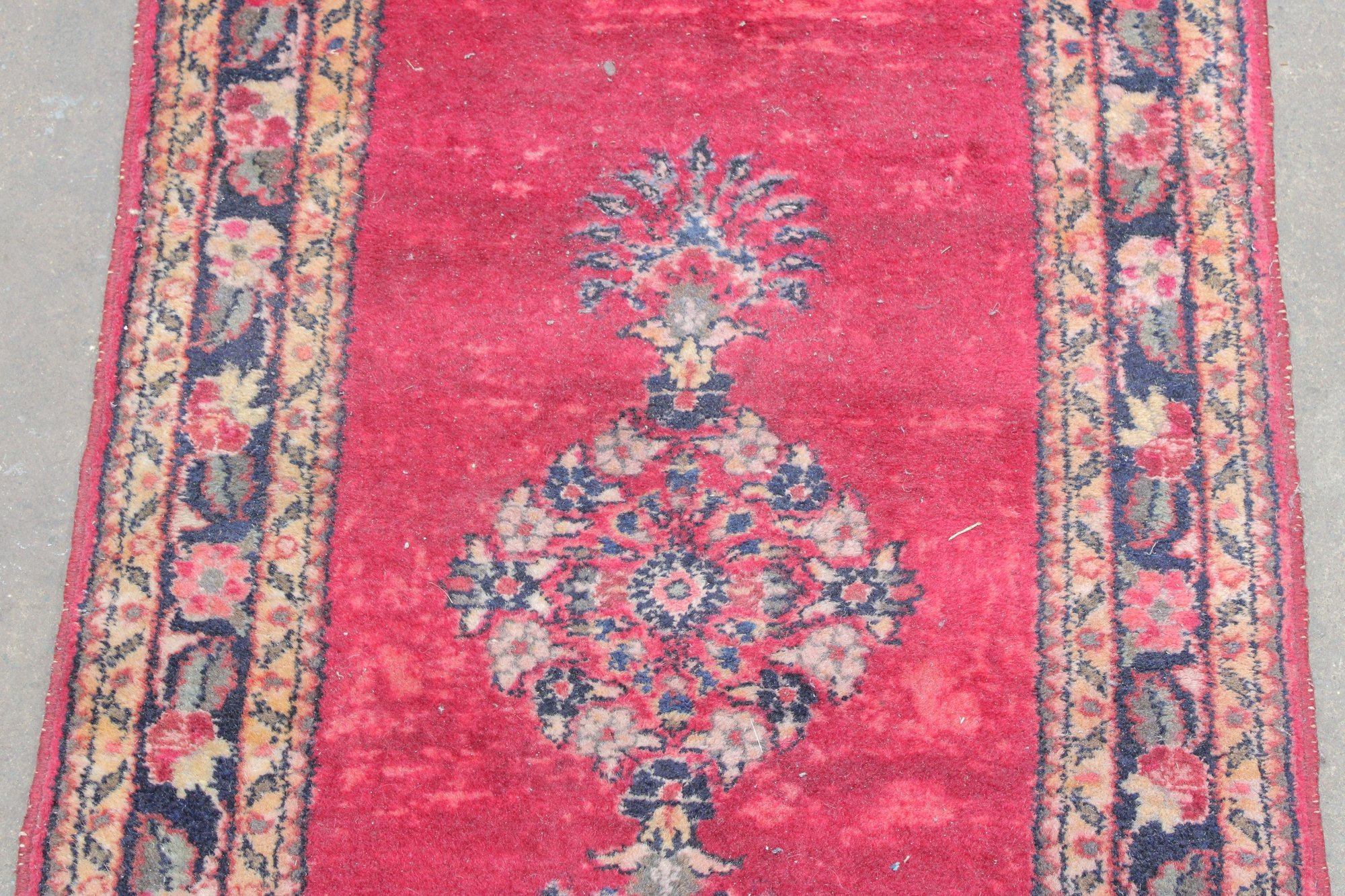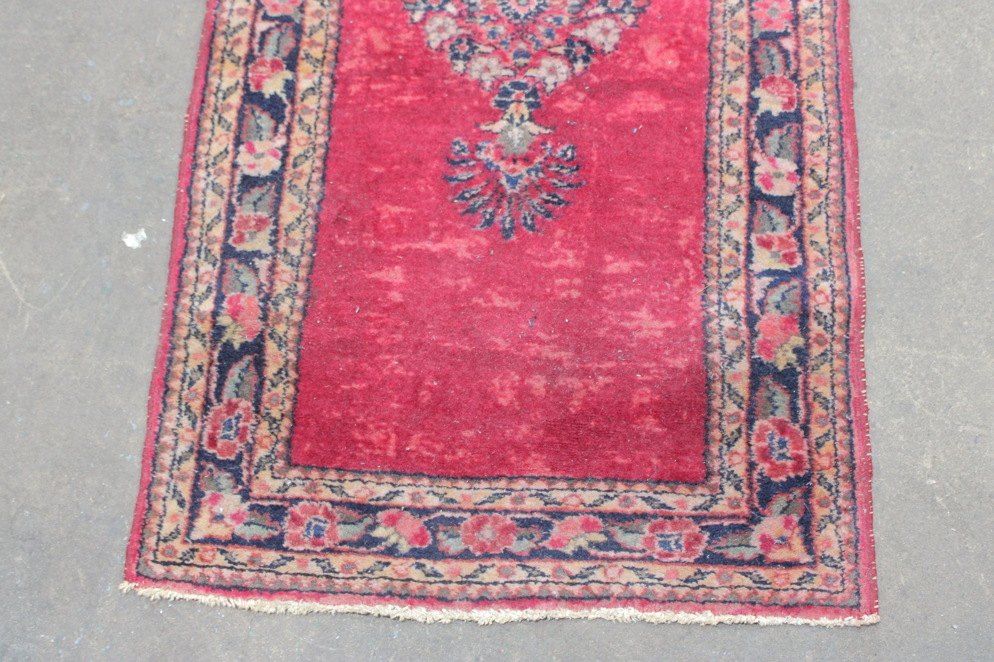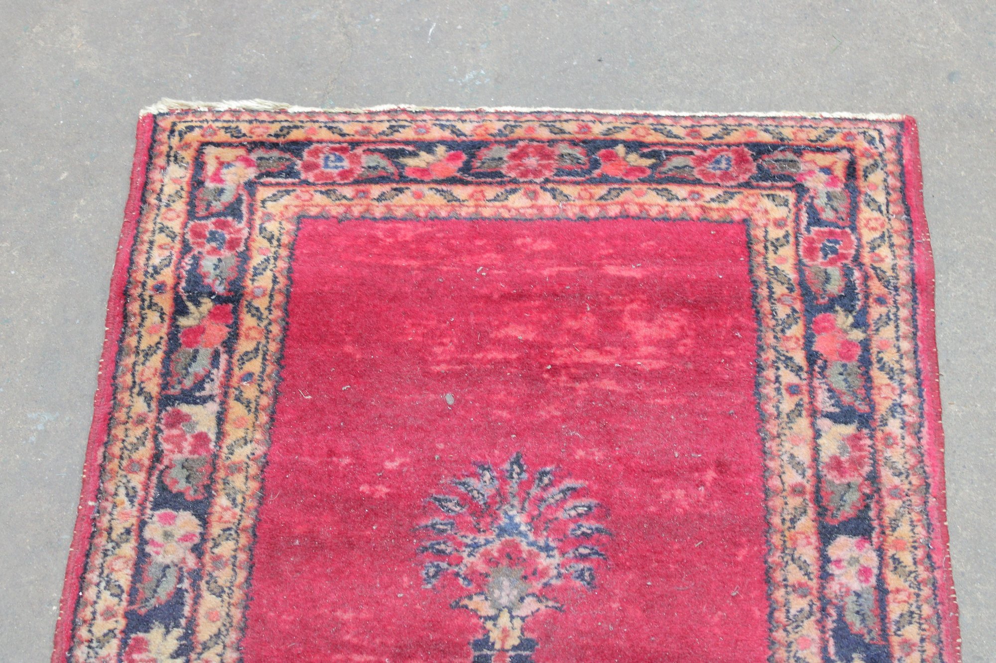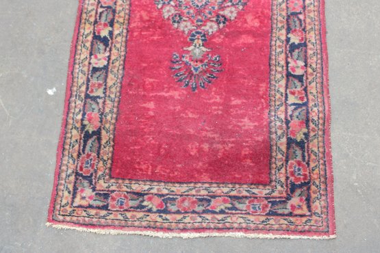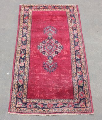 Classic vintage oriental style accent rug featuring a rich red field accented by a central floral medallion and decorative border. The design blends traditional motifs with a warm, time-softened color palette, making it a versatile piece suited for entryways, bedside placement, or layered décor.