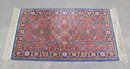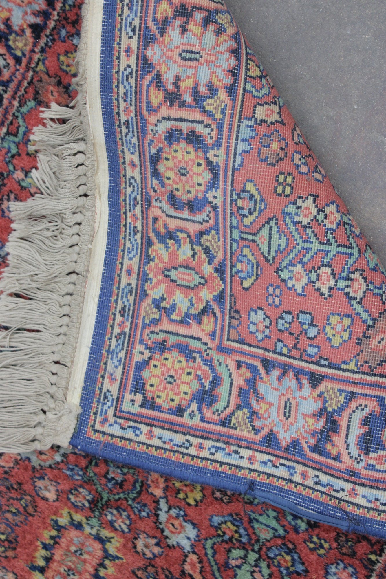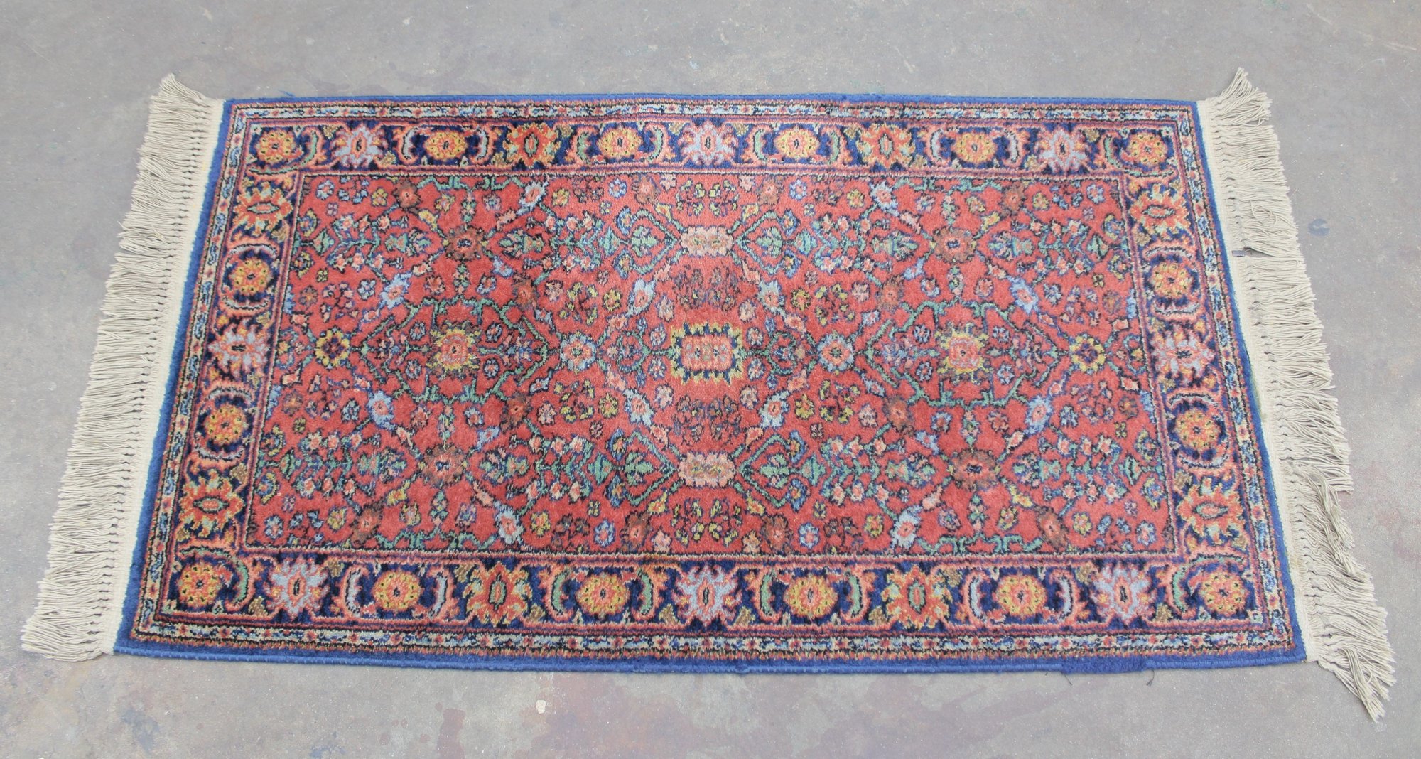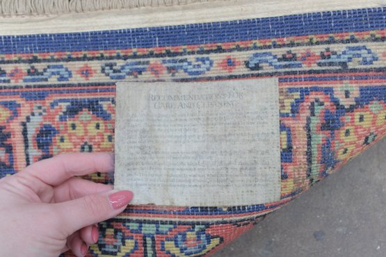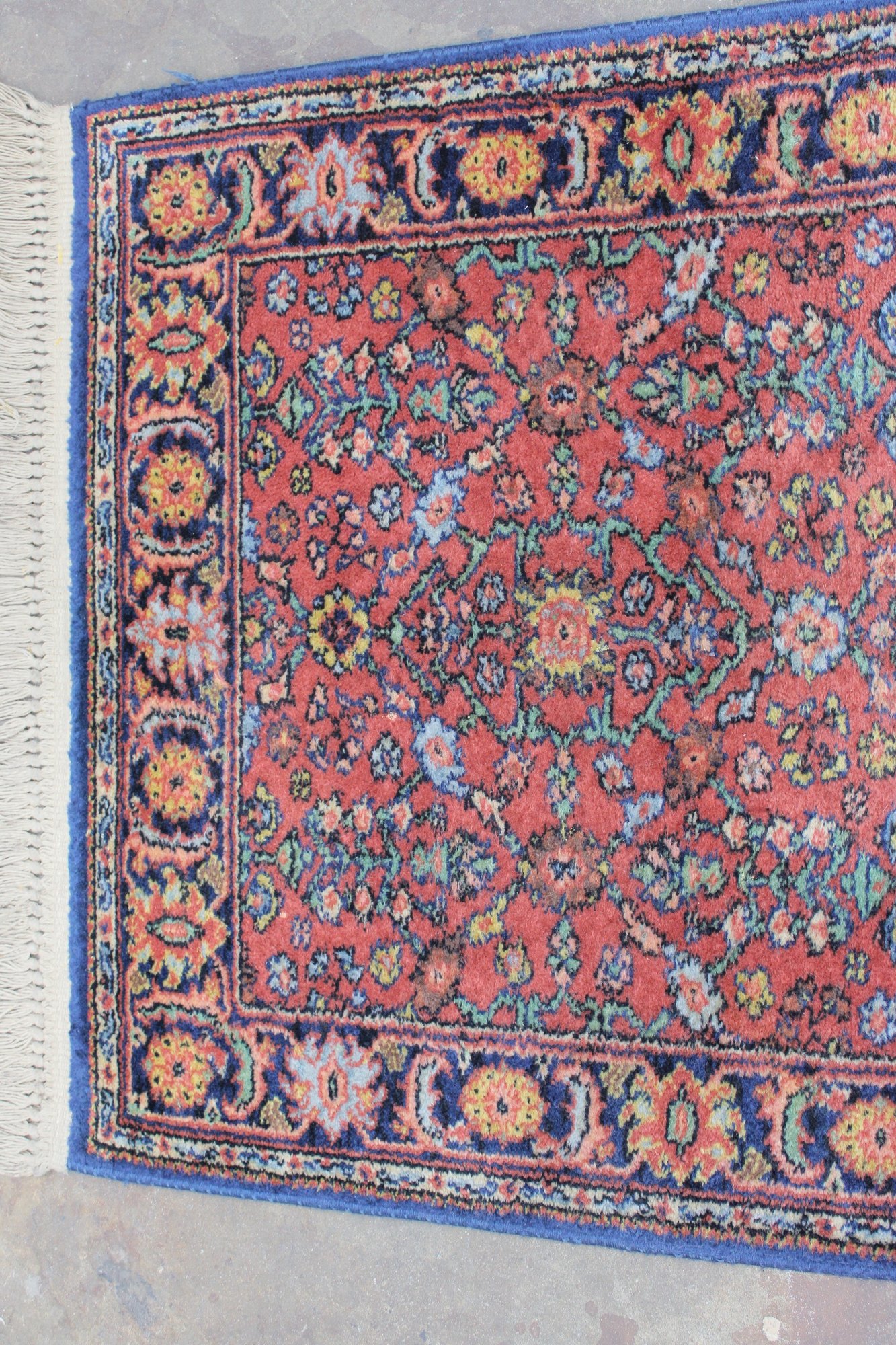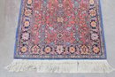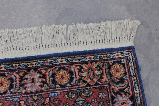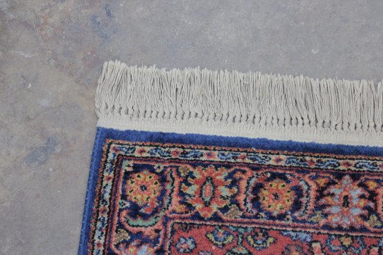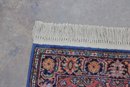 The rug showcases detailed motifs in shades of blue, gold, ivory, and green, framed by a decorative border that enhances its traditional Persian-inspired look. Finished with fringe on both ends, this piece brings timeless charm and character to any setting.