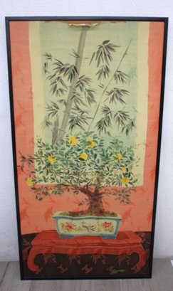 This beautiful framed textile art piece features a classic oriental design with a bamboo motif and floral arrangements in a detailed planter pot. The backdrop has warm hues, primarily of orange and green, enhancing the vintage look of the piece. The artwork is housed in a black frame which complements its aesthetic. Please note that the textile has some signs of age, including wear at the top and bottom edges, with minor fabric tears and folds (as seen in the photos). Perfect for collectors of Asian-inspired decor or as a unique statement piece for your space.