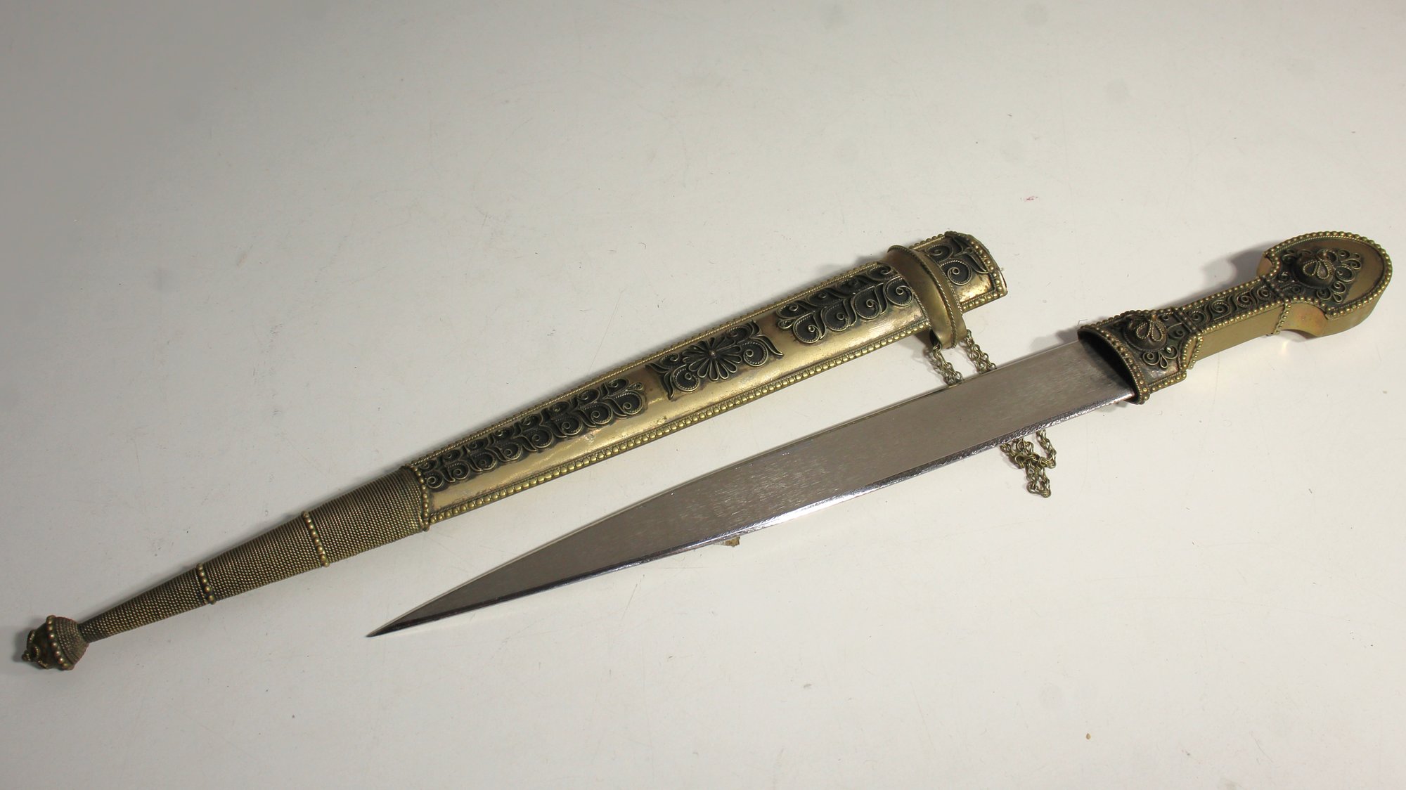 This beautifully crafted vintage brass dagger features an ornately engraved handle and scabbard, making it a striking display piece. The scabbard showcases intricate floral and geometric designs, complemented by decorative chain accents, adding to the overall charm and character of the piece. The dagger itself has a sharp, polished blade that fits snugly into the scabbard, providing both elegance and functionality.