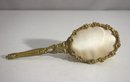 This elegant vintage handheld vanity brush features a beautifully ornate brass frame with intricate floral and scroll designs. The brush back showcases a pearlescent finish, adding to its luxurious appeal. Its lightweight design and detailed craftsmanship make it a timeless addition to any vanity or decor collection.