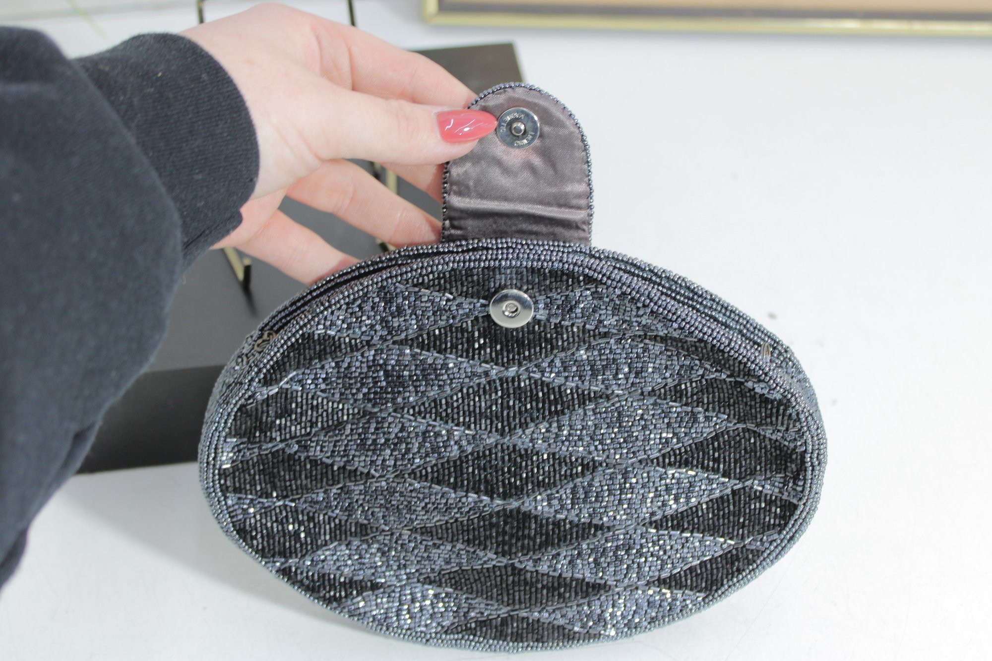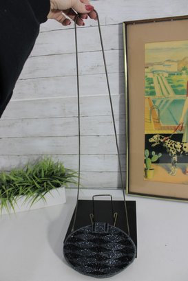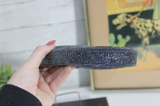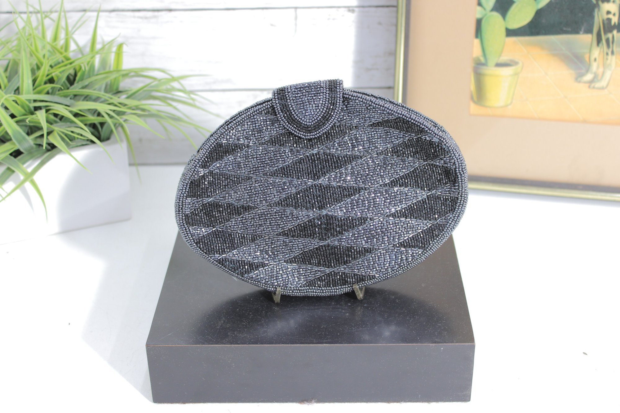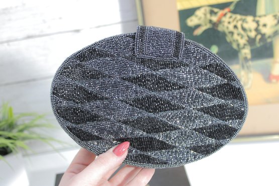 Striking vintage oval evening purse featuring intricate black and silver micro-beadwork in a bold geometric pattern. This elegant bag sparkles beautifully in the light and offers a sleek, Art Deco–inspired look that’s perfect for formal wear or a glamorous night out.