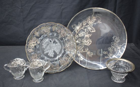 This auction presents a unique opportunity to acquire a beautiful set of overlay glassware, boasting delicate floral patterns that are timeless in design. Ideal for collectors and enthusiasts alike, this set promises to be the centerpiece of any table setting.Silver overlay designs on glass create a striking contrast, making each piece a work of art. Includes serving plates, cups, and a bowl, providing you with a versatile range for serving and entertaining.