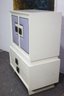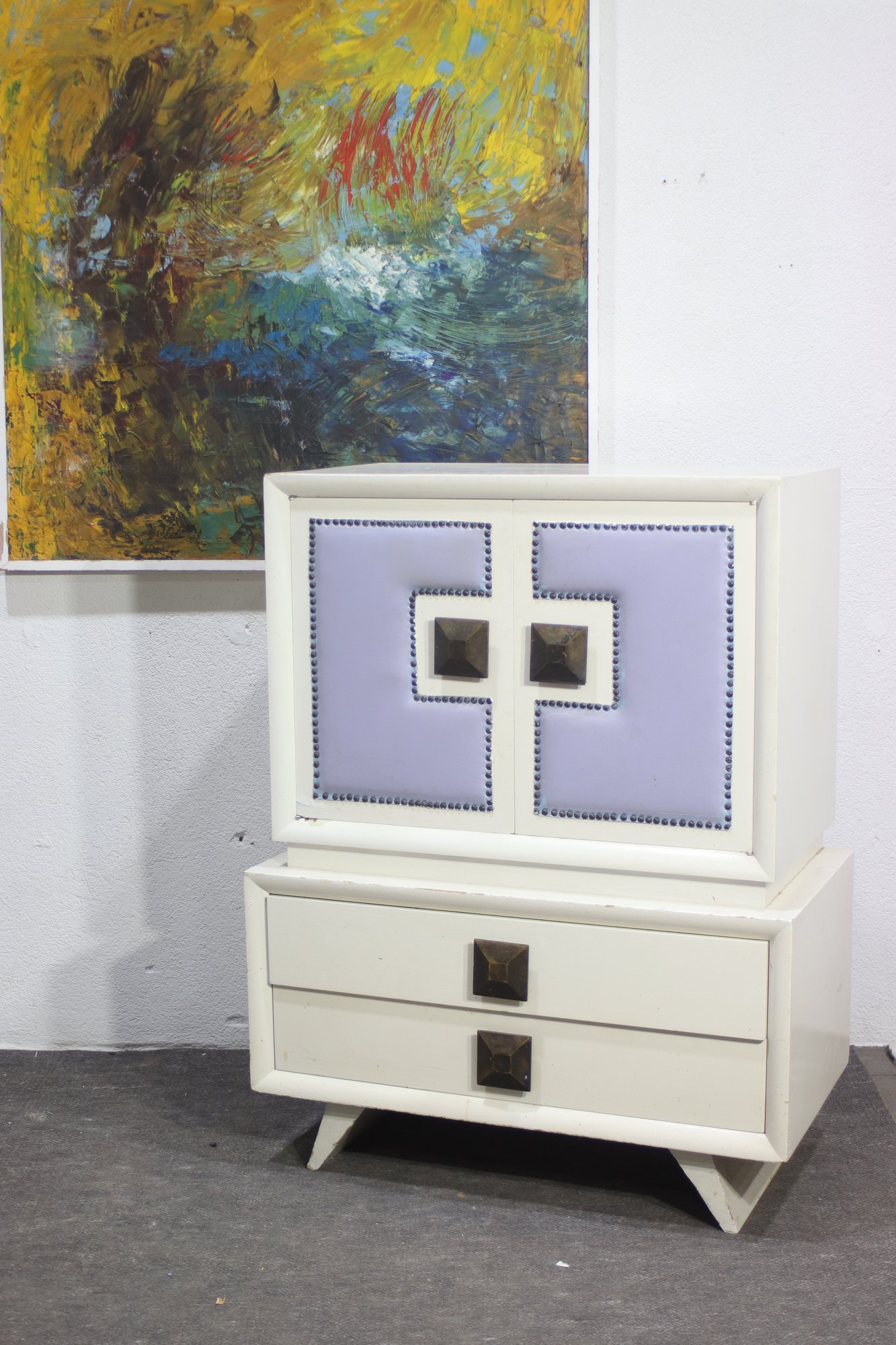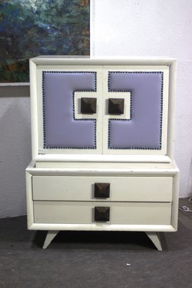 Make a bold statement with this one-of-a-kind vintage highboy dresser, featuring a painted wood frame with striking leather-paneled doors and decorative nailhead trim. This mid-century modern-inspired piece offers ample storage while adding a touch of luxury to any space.