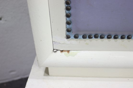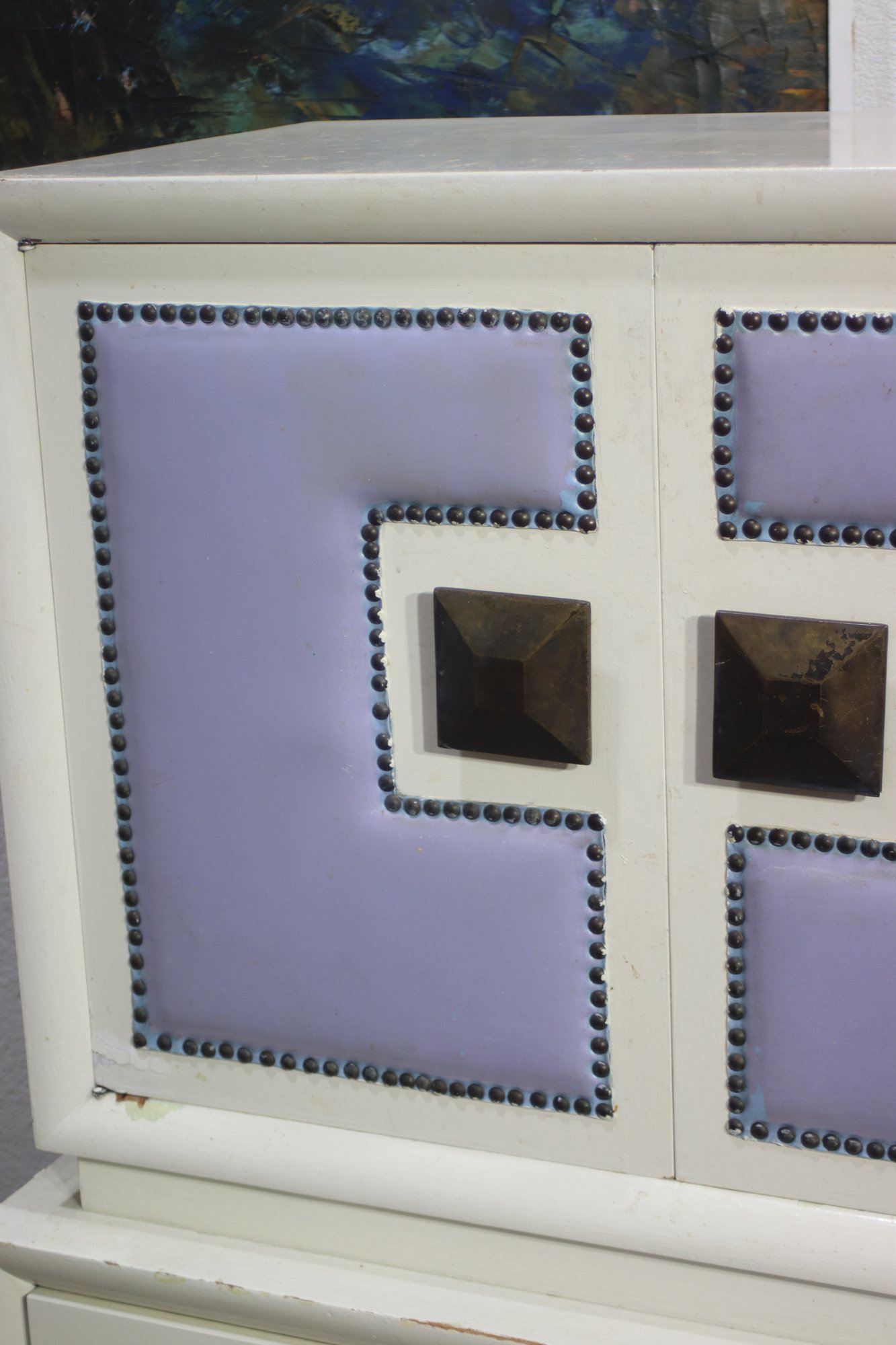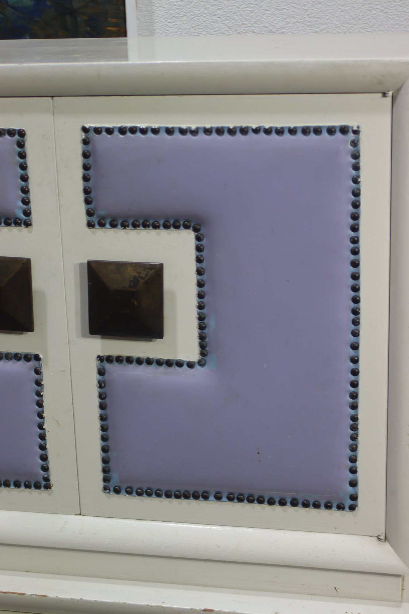 Lavender leather inlays on cabinet doors with nailhead trim detailing