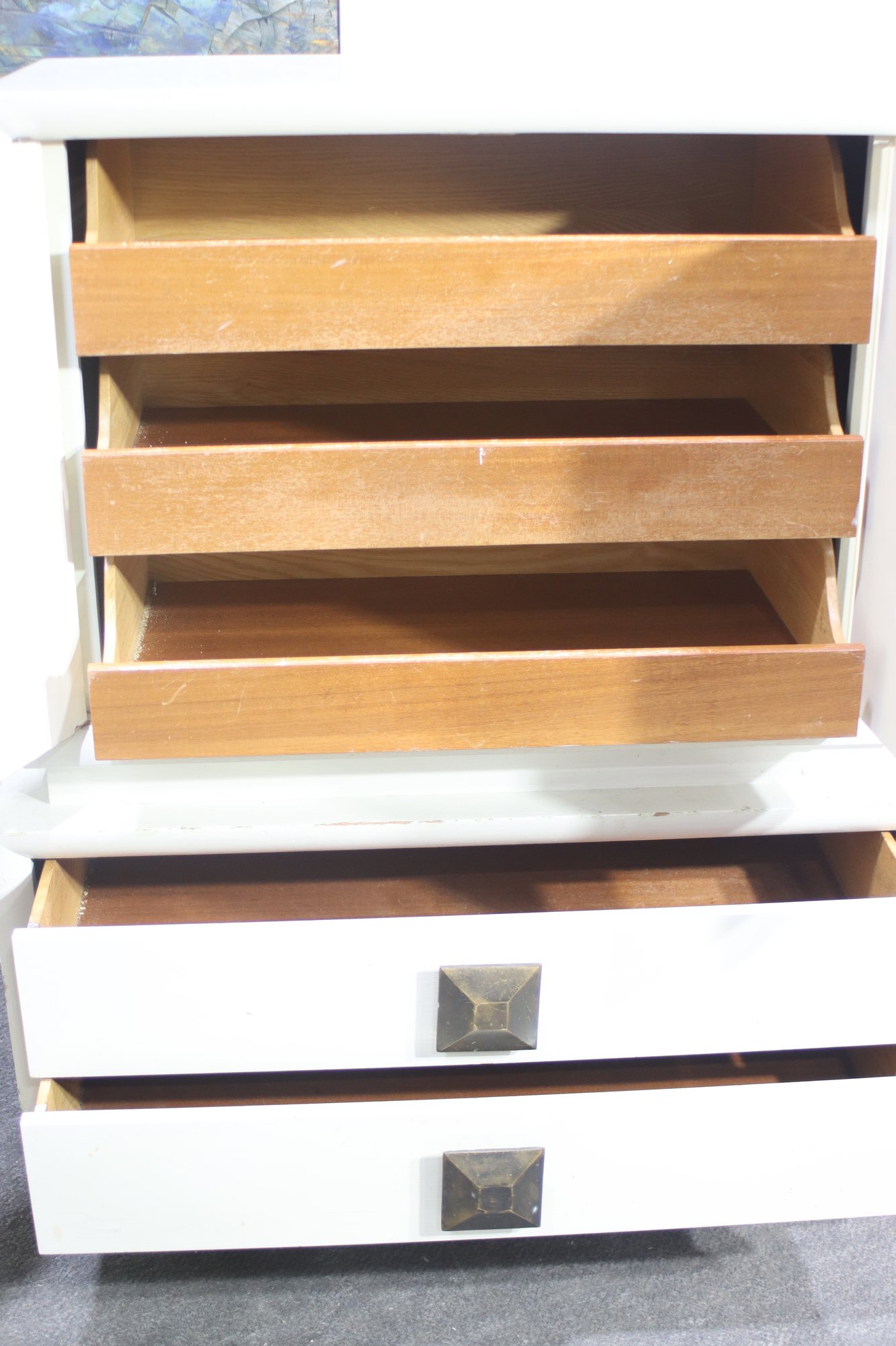 Two large lower drawers with sculptural square metal pulls