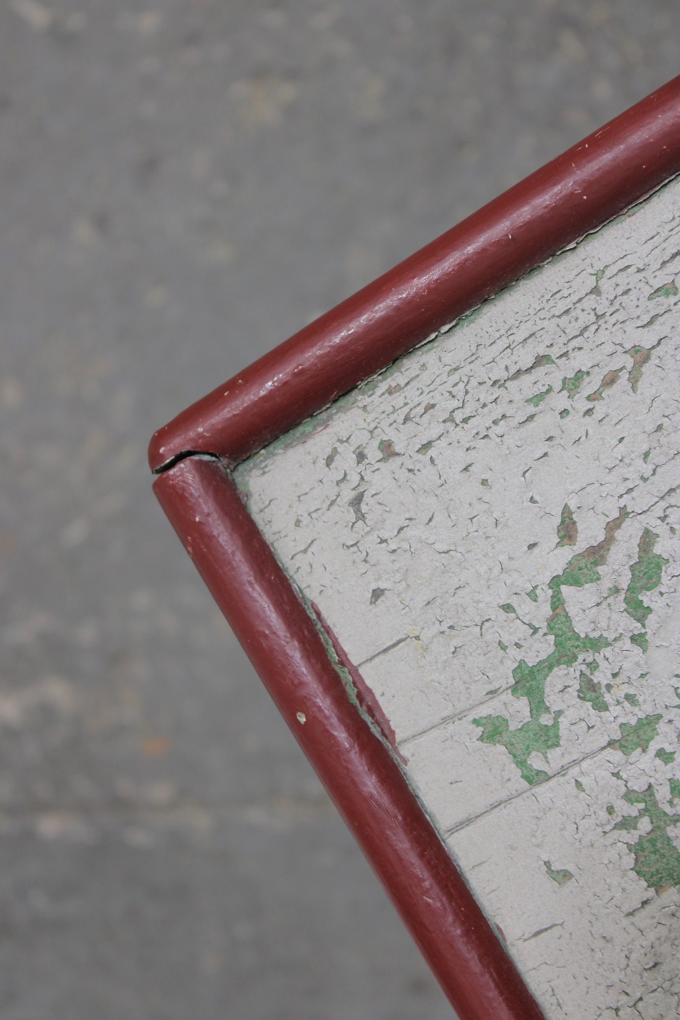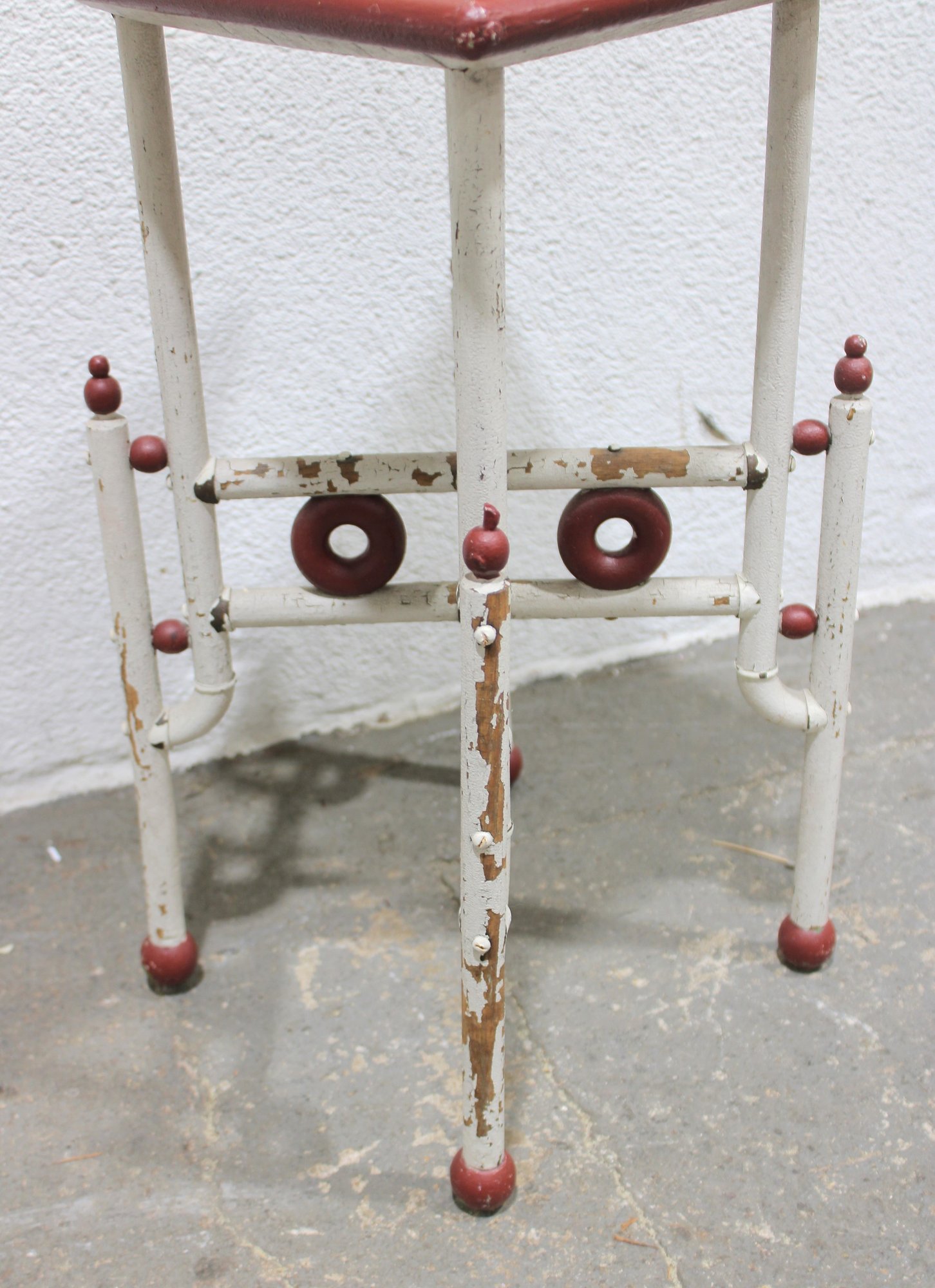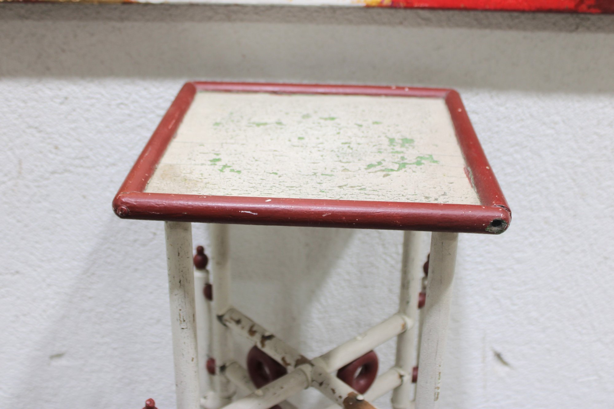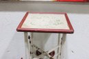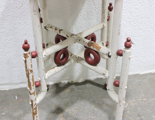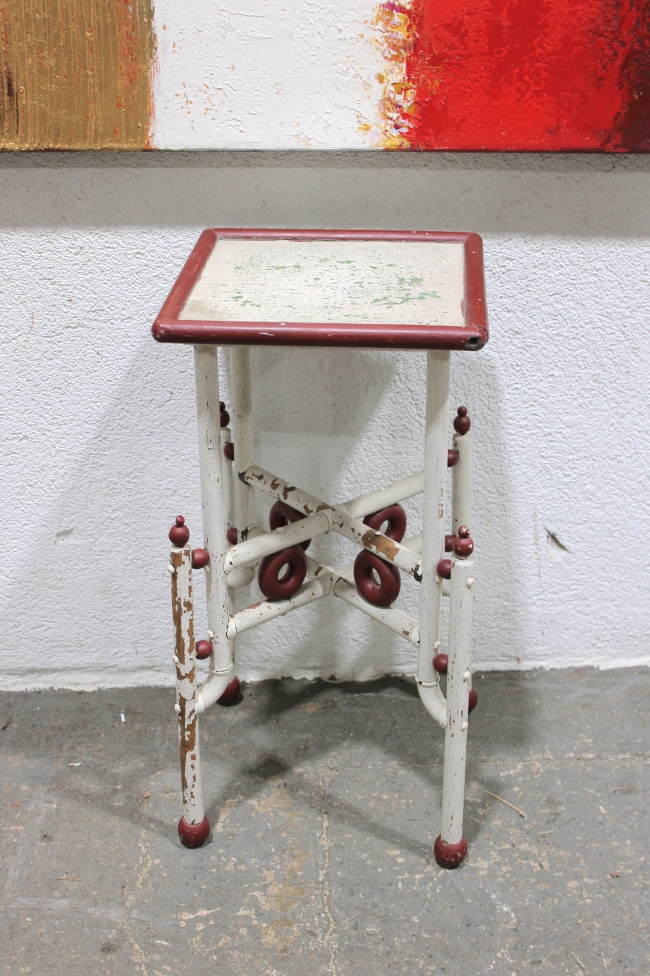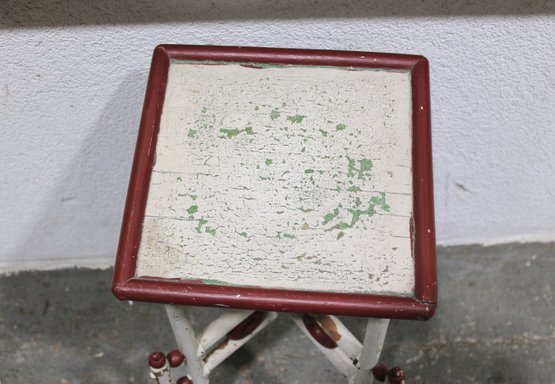 vintage wooden plant stand or accent pedestal table featuring a decorative painted finish and classic cottage-style design. The piece is finished in white with red trim and accents, giving it a rustic, country-inspired look.