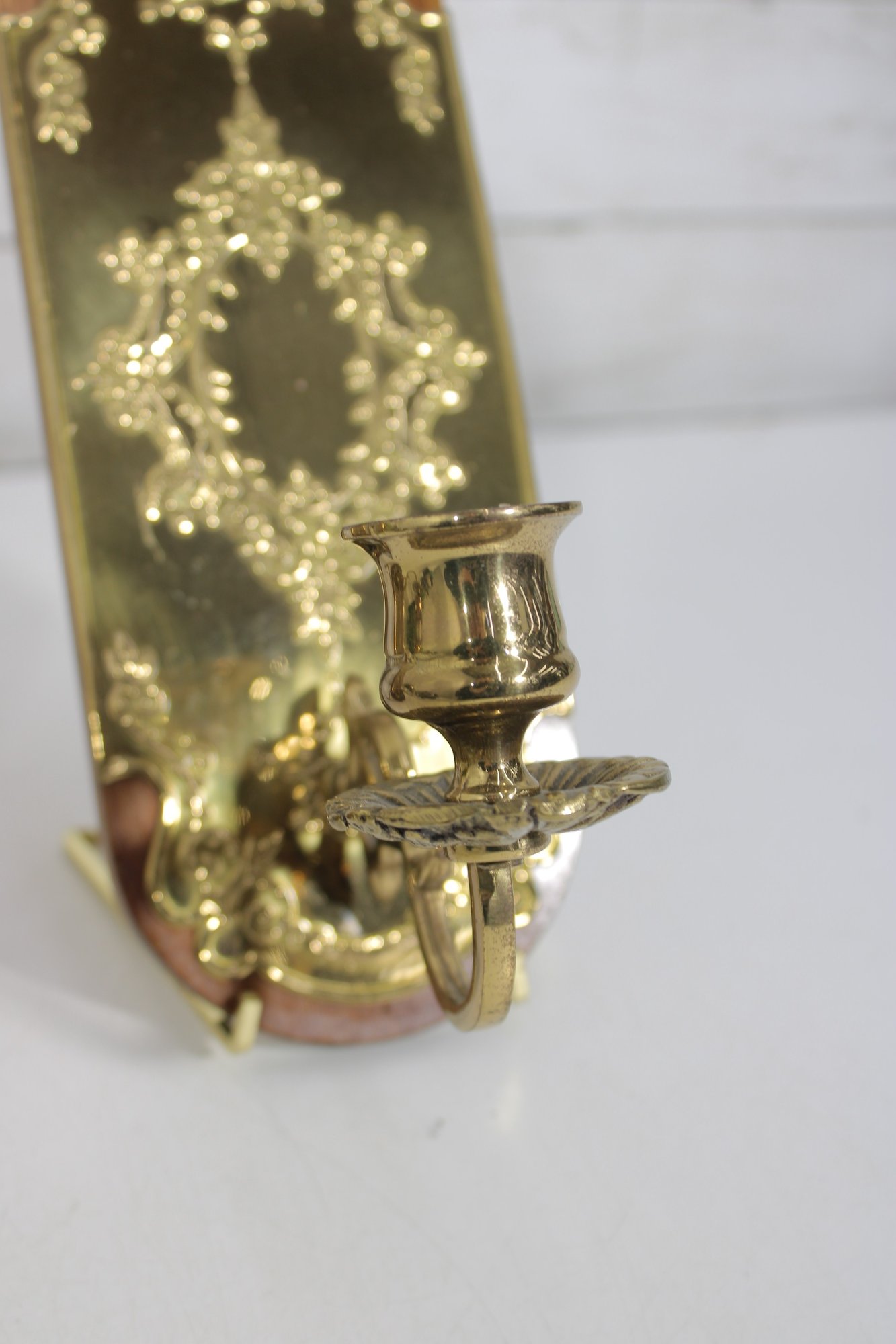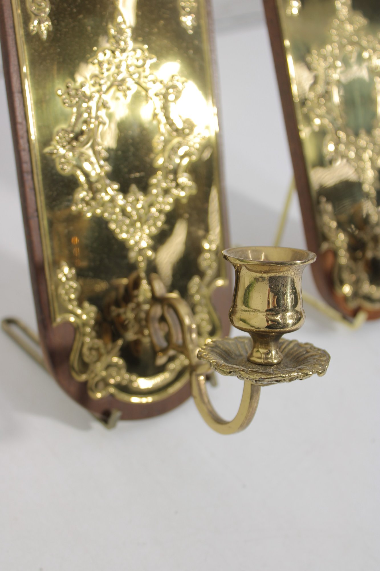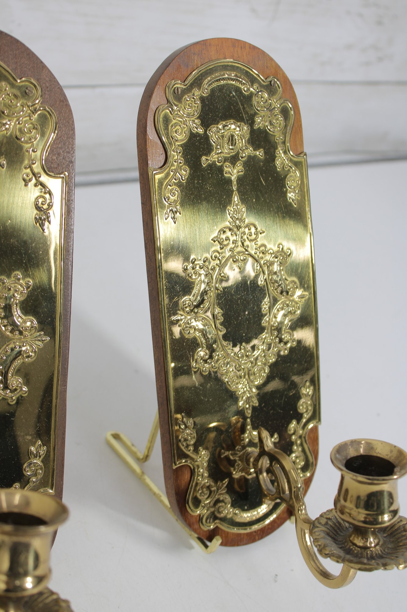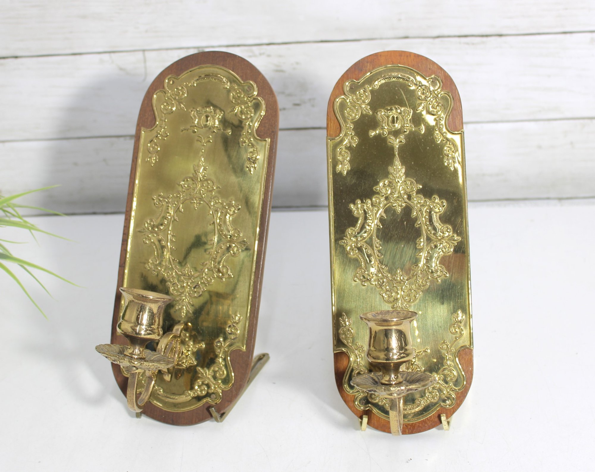 pair of brass wall candle sconces featuring ornate floral and scrollwork designs mounted on wooden backplates. These decorative sconces showcase a richly detailed embossed brass front with a warm golden tone, adding a classic and sophisticated touch to any space.
