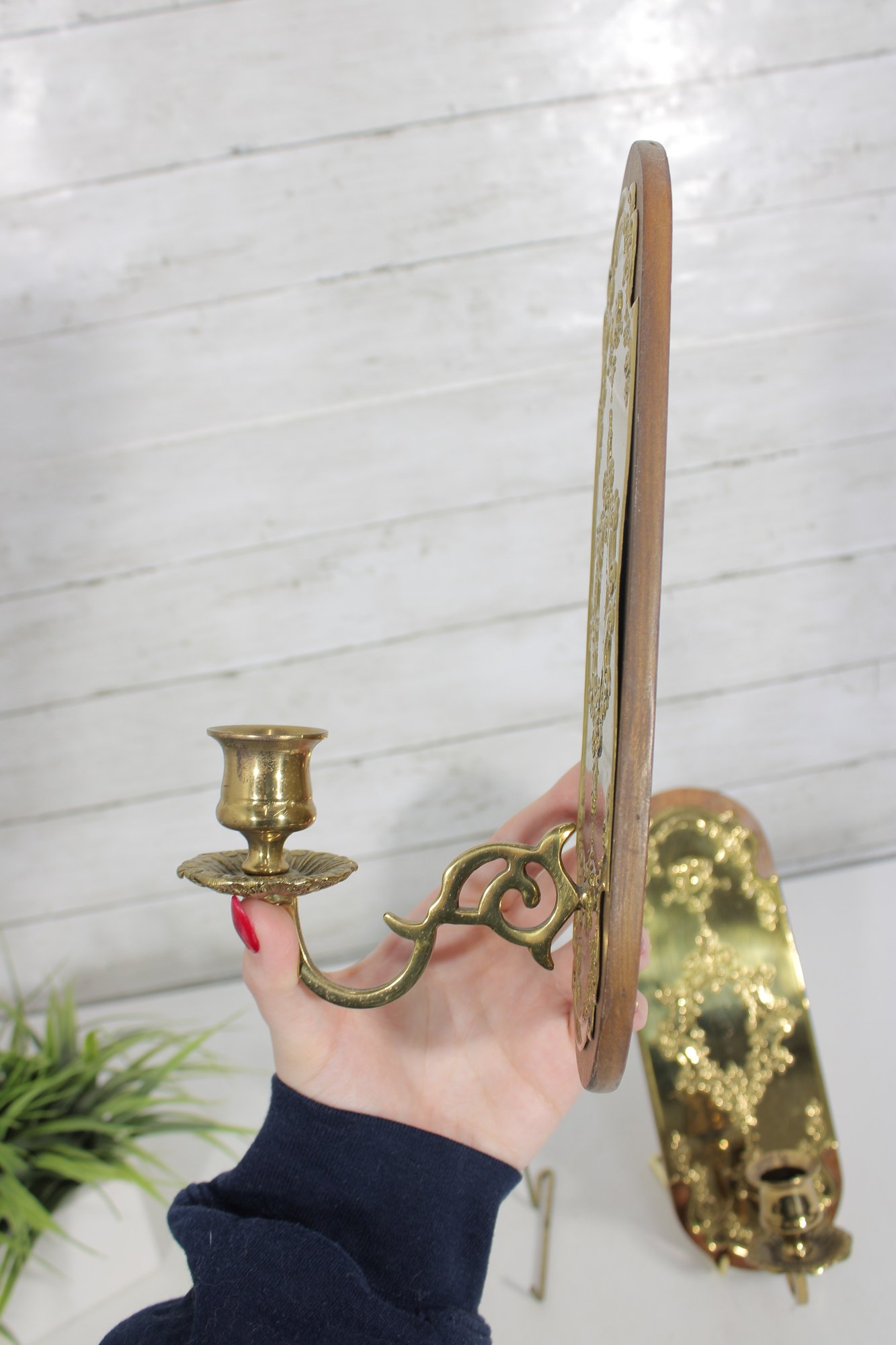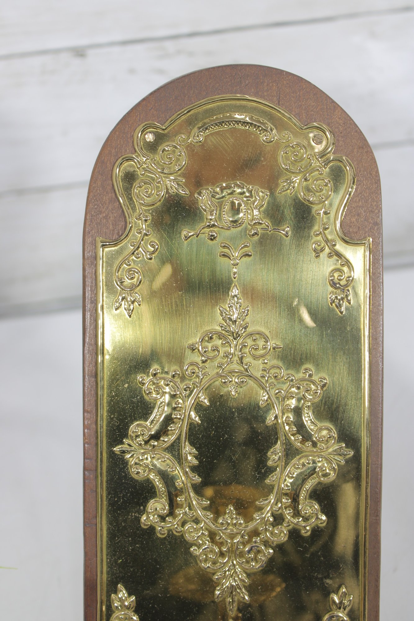 Both pieces are in good vintage condition with light surface wear and patina consistent with age. The brass retains a nice shine, and the wooden backs show minor signs of use. Mounting hardware not included.