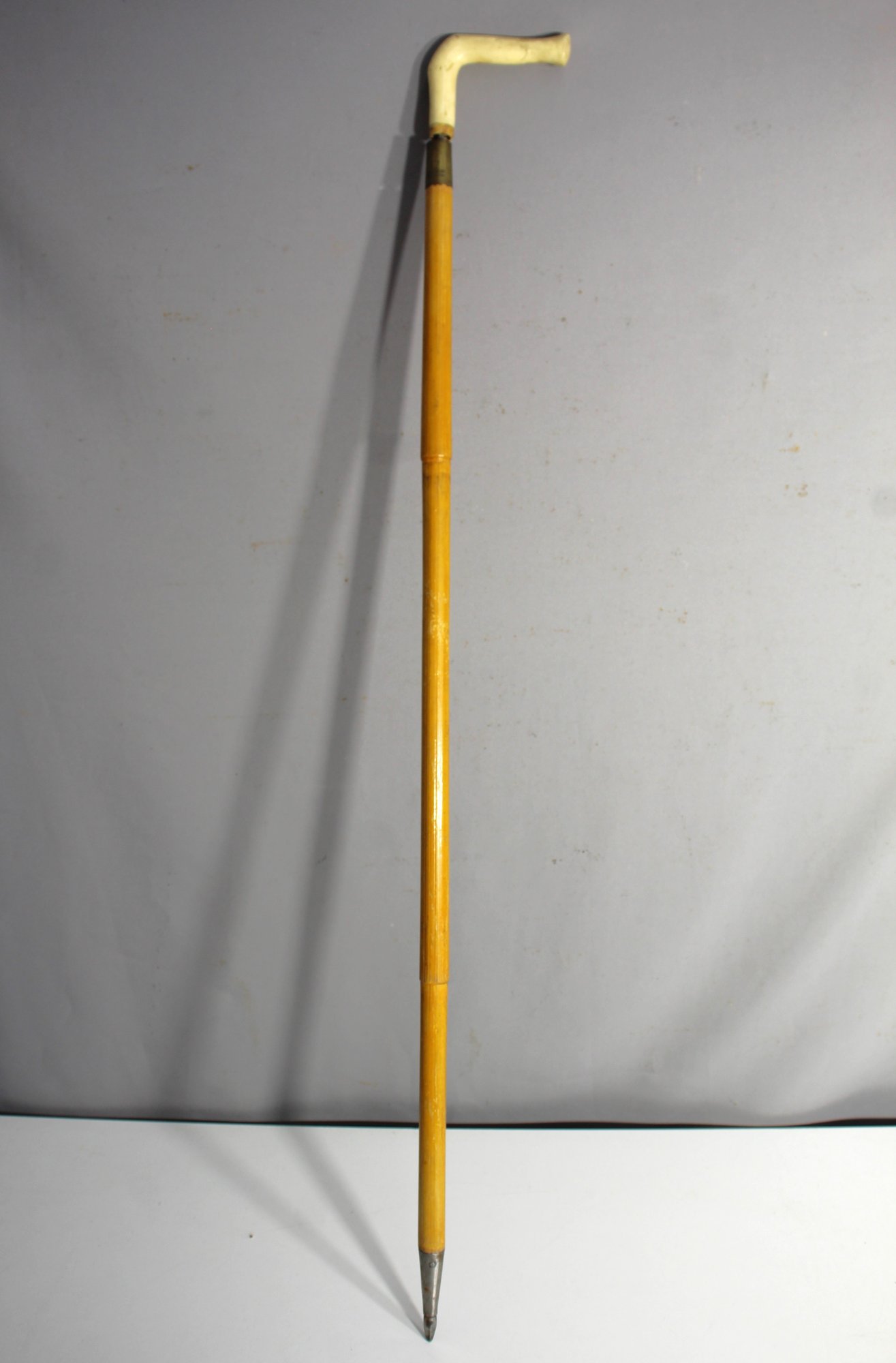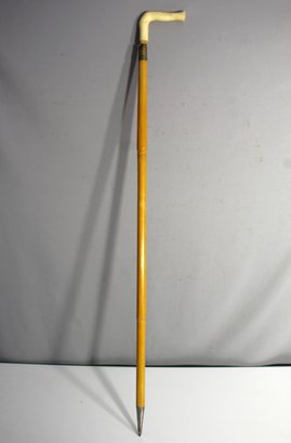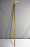 a vintage walking cane showcasing a beautifully polished wooden shaft with a unique removable ivory-like handle. The cane is marked "Made In Pakistan"," highlighting its authenticity and vintage appeal. The handle, which detaches via a metal joint, adds a touch of character and makes this piece particularly interesting for collectors of canes and vintage walking sticks.