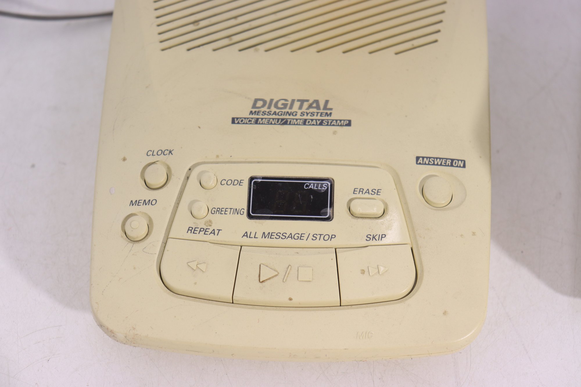 The answering machine features easy-to-use push-button controls, message playback, repeat, skip, and erase functions, along with a built-in speaker. A great example of classic late-20th-century home or office technology, perfect for collectors, retro décor, or functional vintage electronics use.