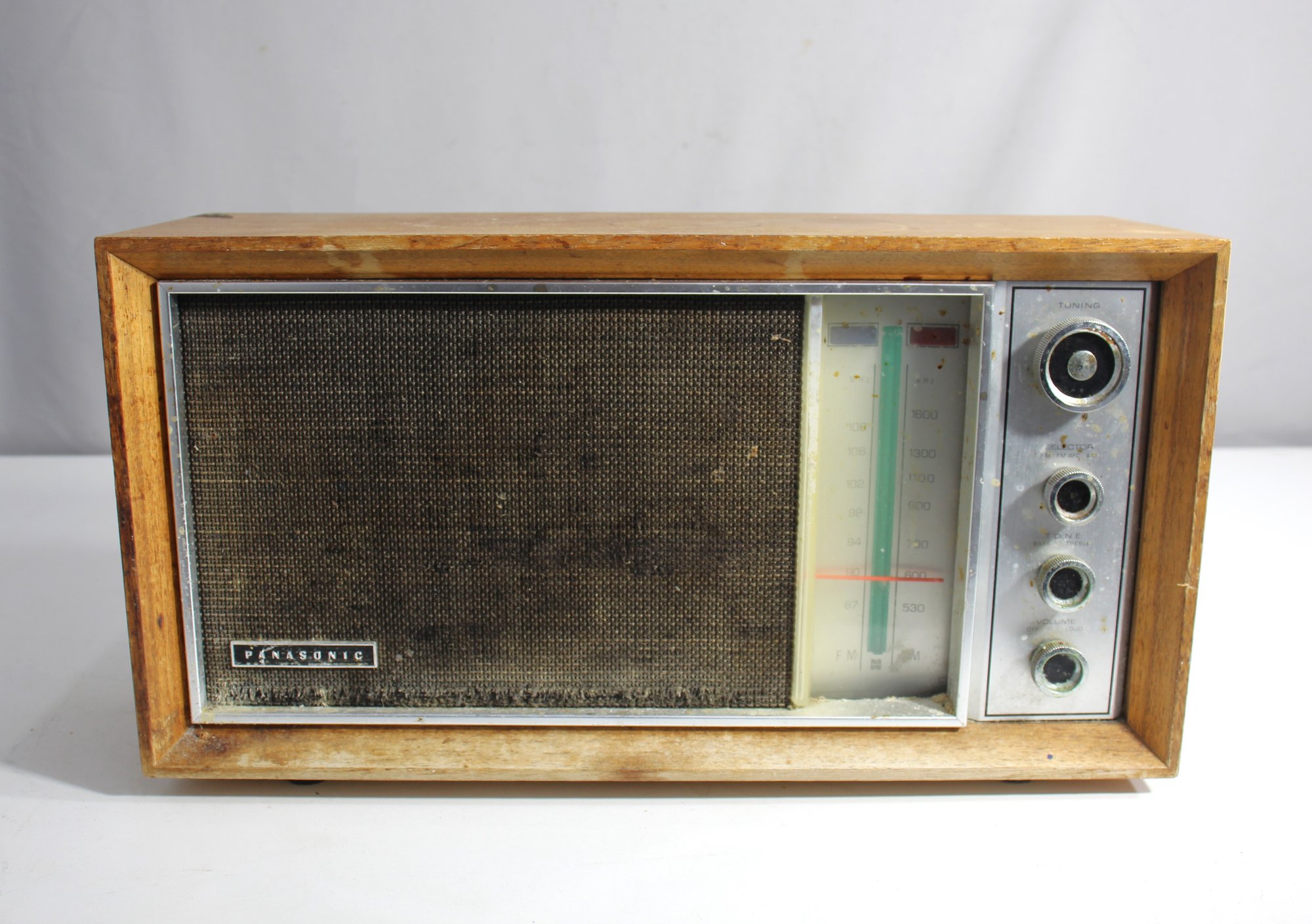 This vintage Panasonic RE-7259 radio, featuring AM and FM 2-band reception, is a collector's piece from a bygone era. Housed in a classic wood frame with a textured front speaker panel, this radio exudes retro charm. It shows signs of wear consistent with age, including some dust and fading, and requires rewiring for full functionality. Perfect for enthusiasts of vintage electronics or as a nostalgic decor item. Made in Japan.