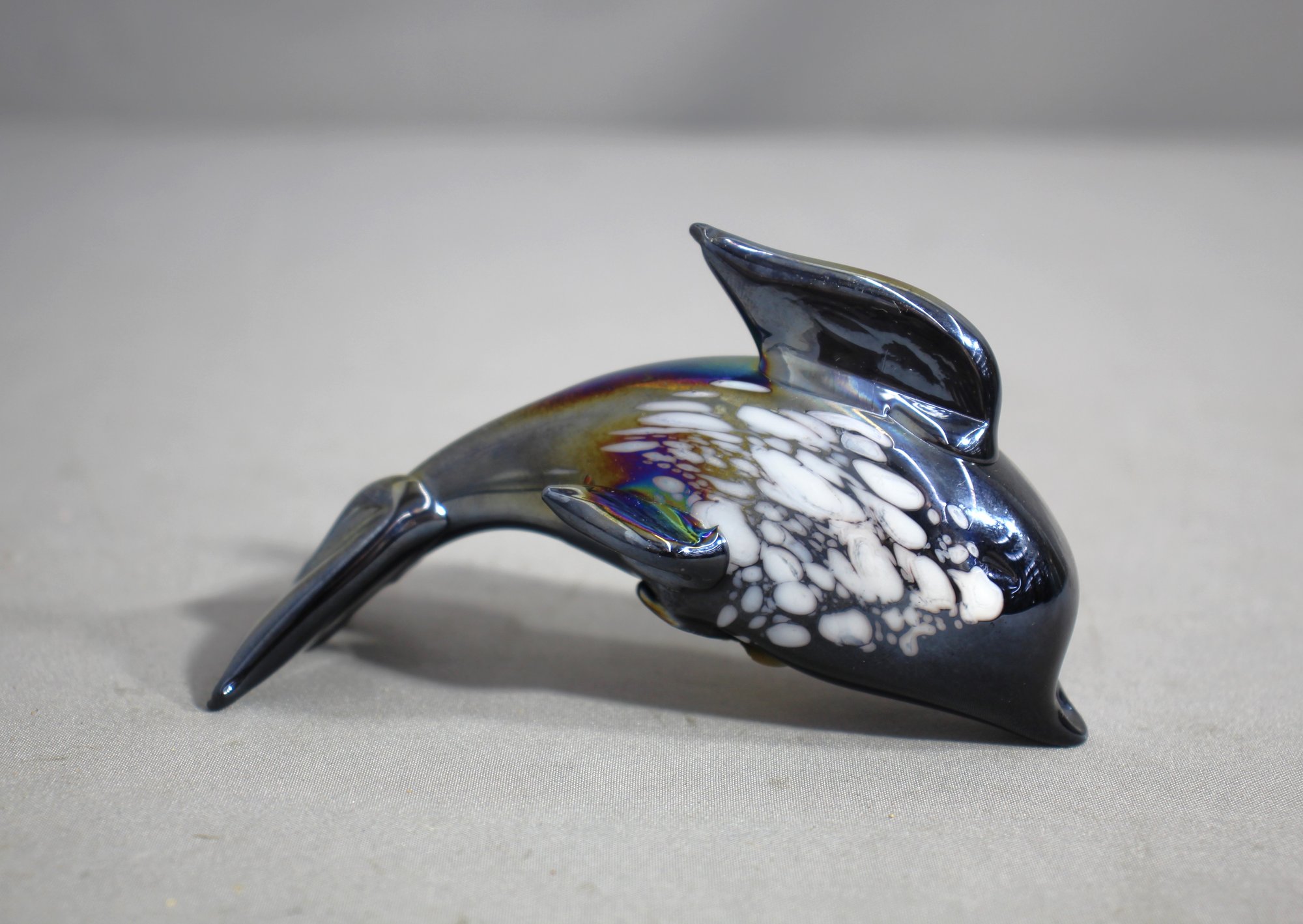 vintage art glass dolphin figurine by Pele of Hawaii showcases a stunning blue iridescent finish. The dolphin is beautifully crafted, featuring intricate details and a captivating blend of colors that shimmer in the light. The figurine is a testament to the artistry and craftsmanship of Pele of Hawaii, making it a perfect addition to any collection of vintage art glass or marine-themed decor.