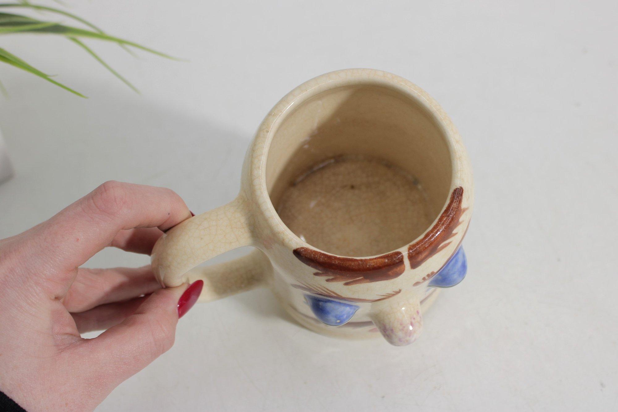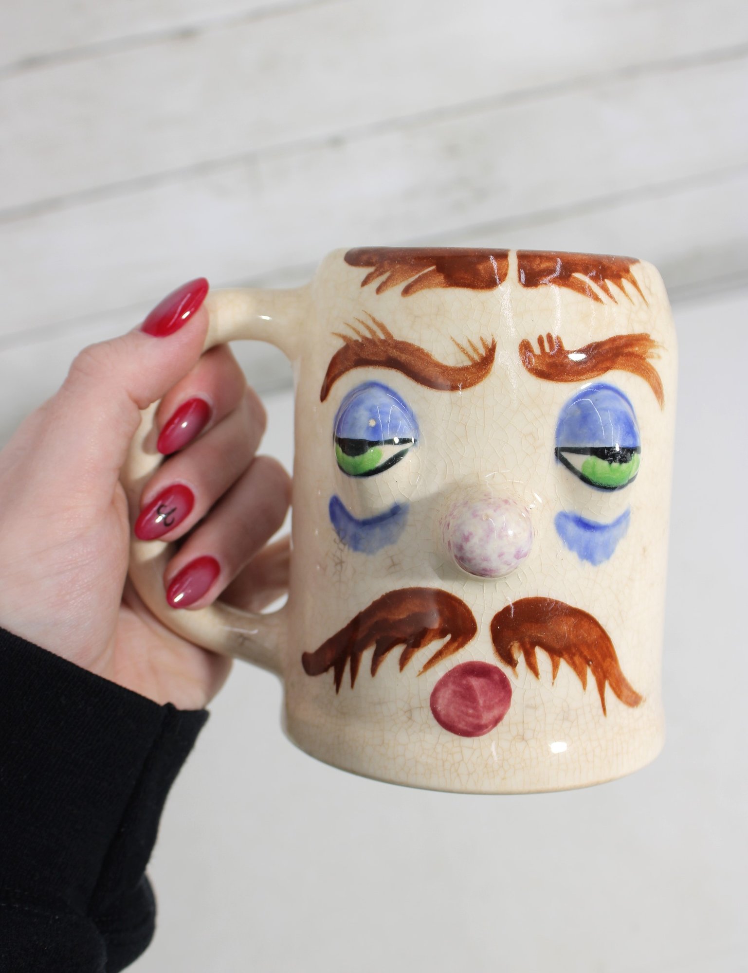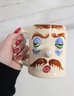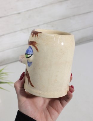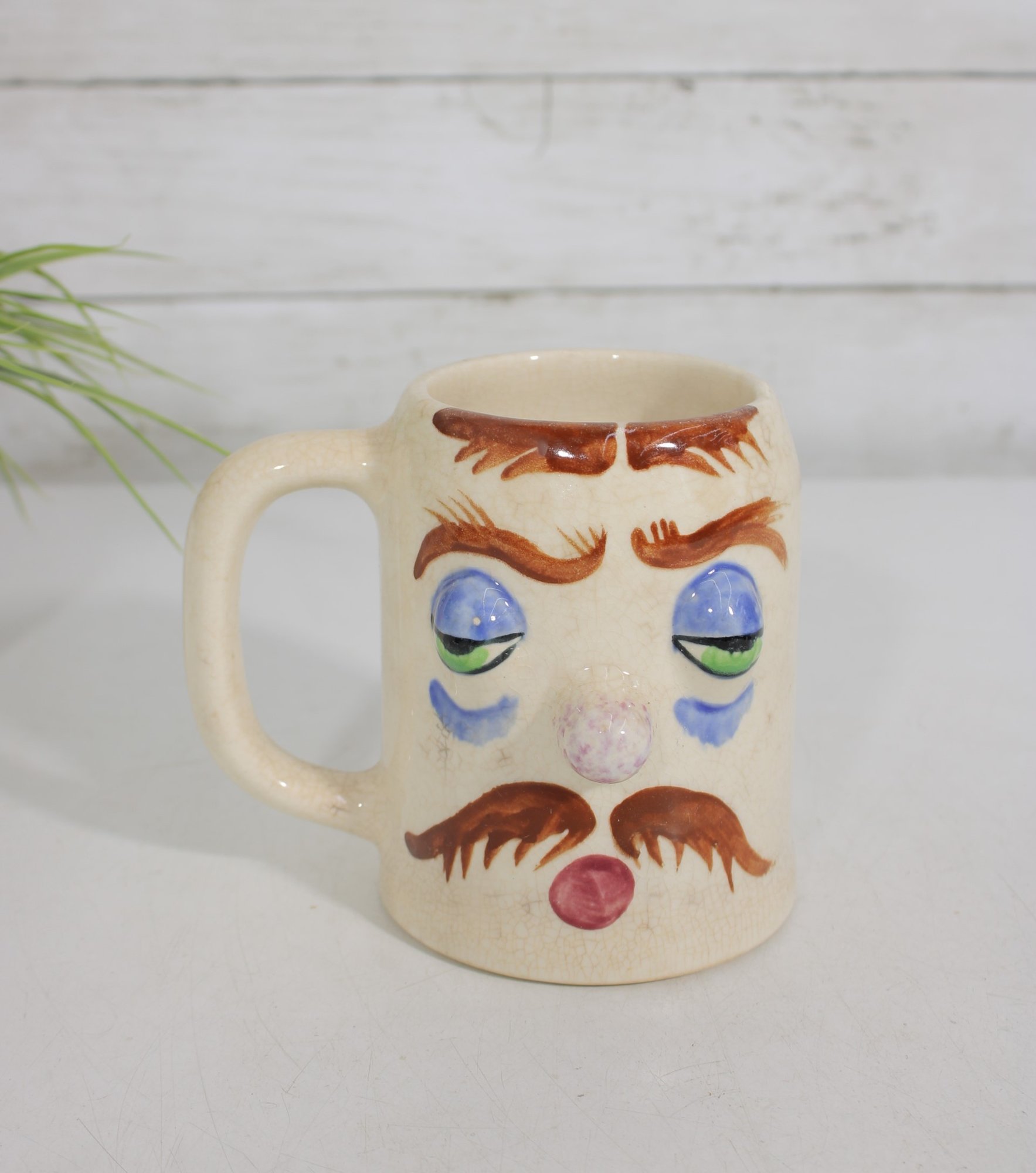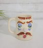 Fun and collectible vintage Pfaltzgraff “Muggsy Sleepy Sam” mug jug featuring a whimsical sleepy face design. This character mug showcases hand-painted details including droopy blue eyes, arched brows, mustache, and a rounded nose, giving it a charming and humorous personality.