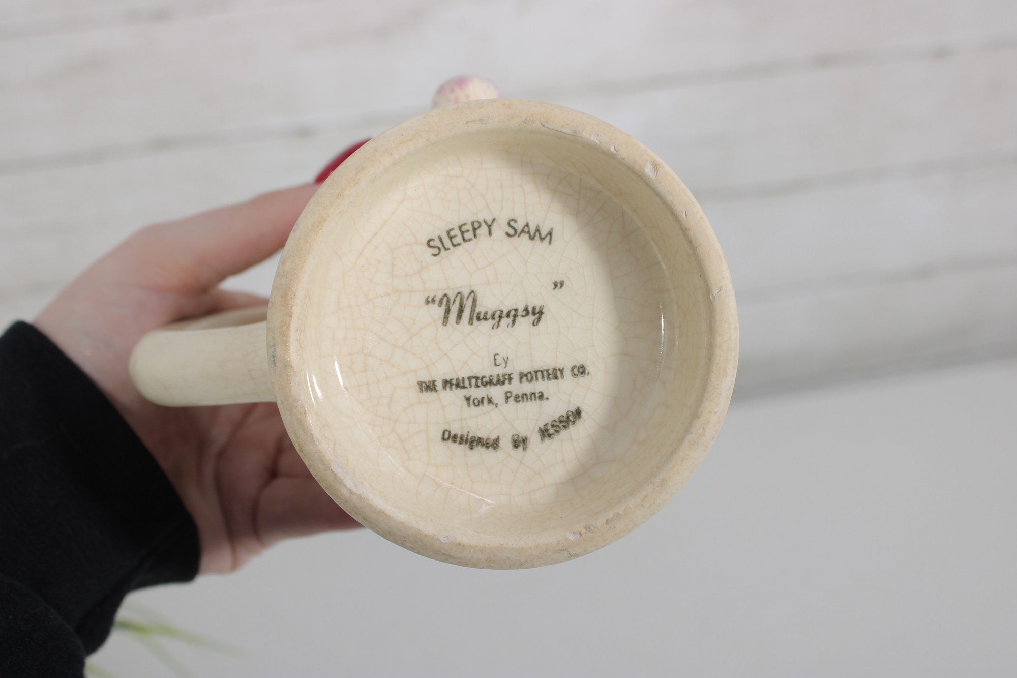 Crafted in a warm cream-toned ceramic, this piece doubles as both a mug and a small jug, making it a unique addition to any collection. The base is clearly marked with “Sleepy Sam – Muggsy” along with Pfaltzgraff information.