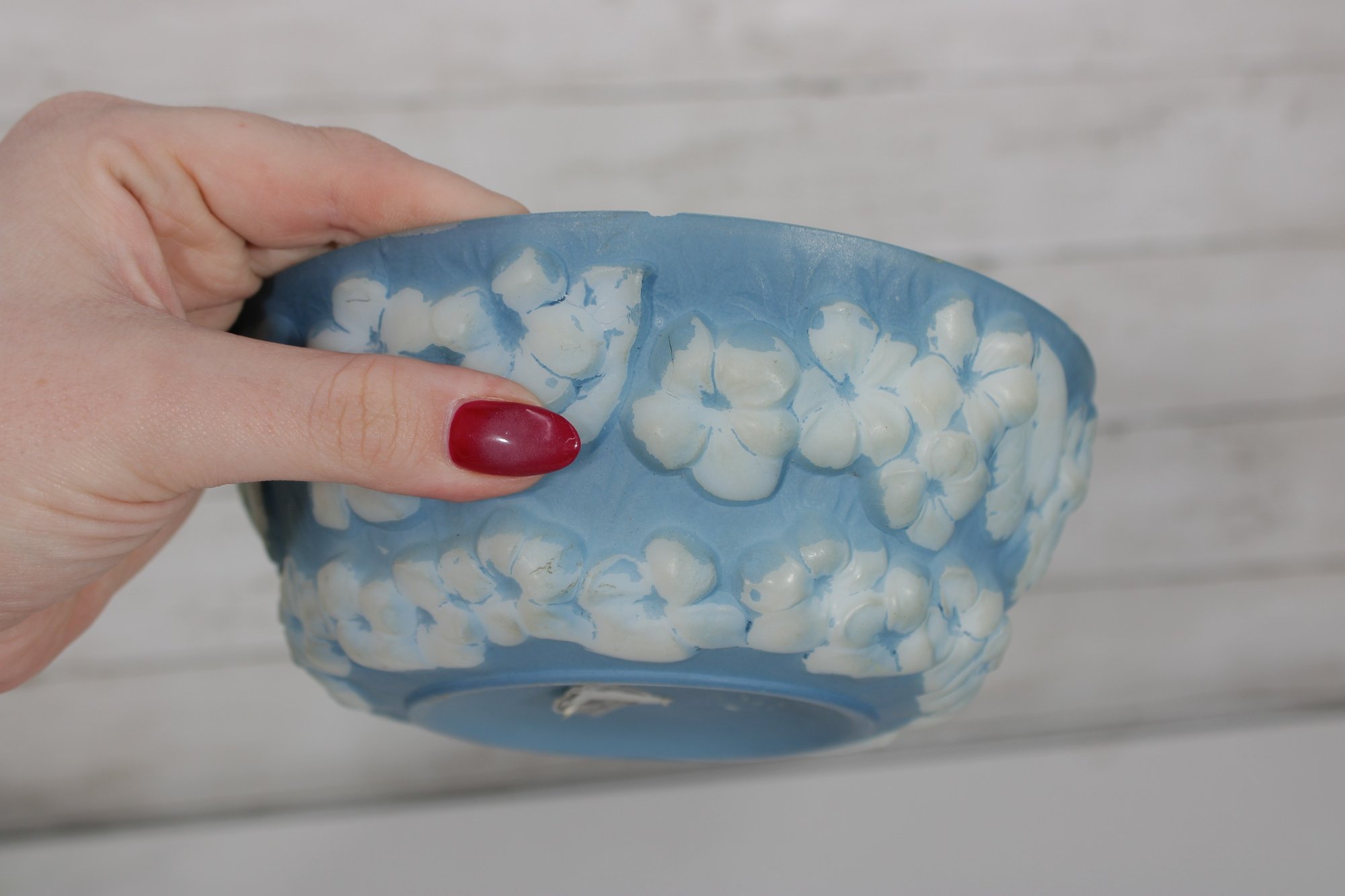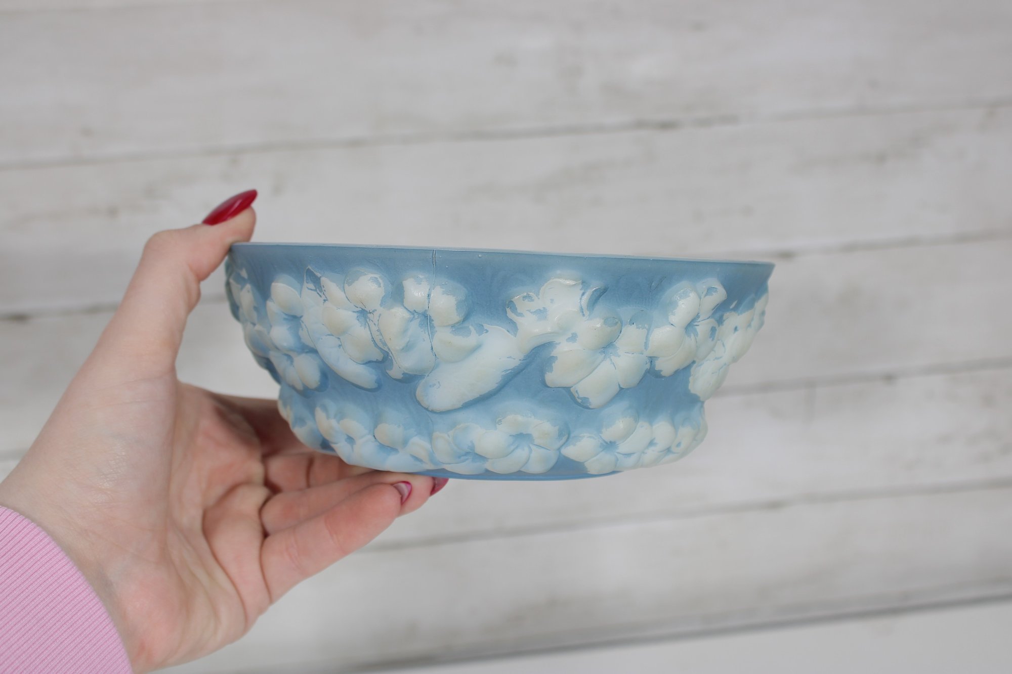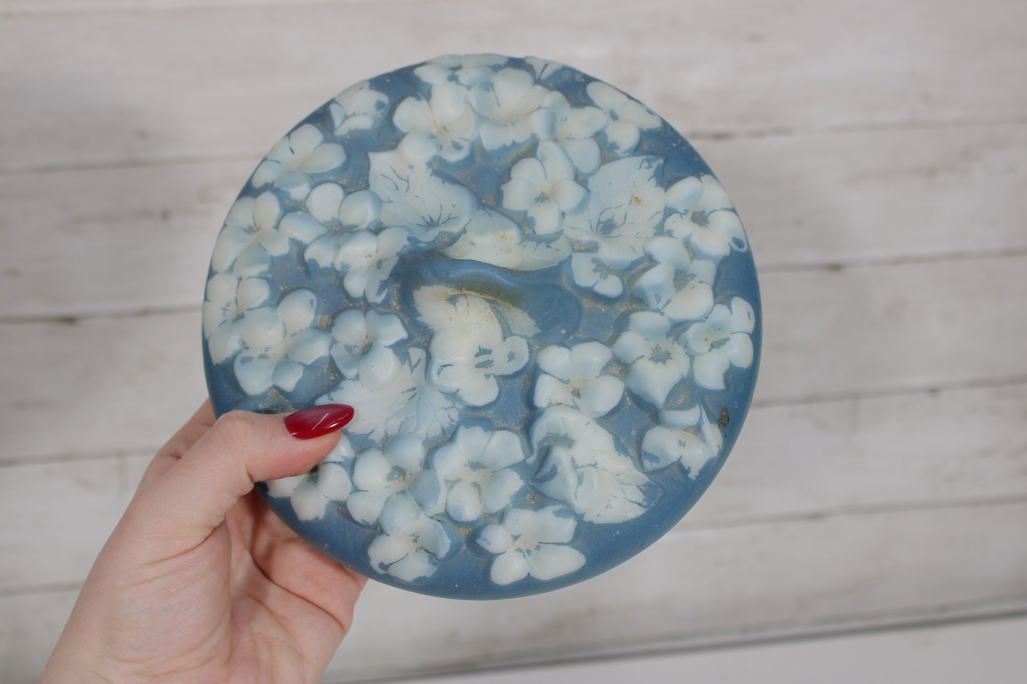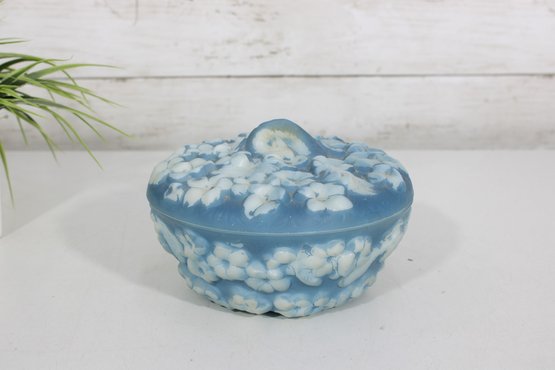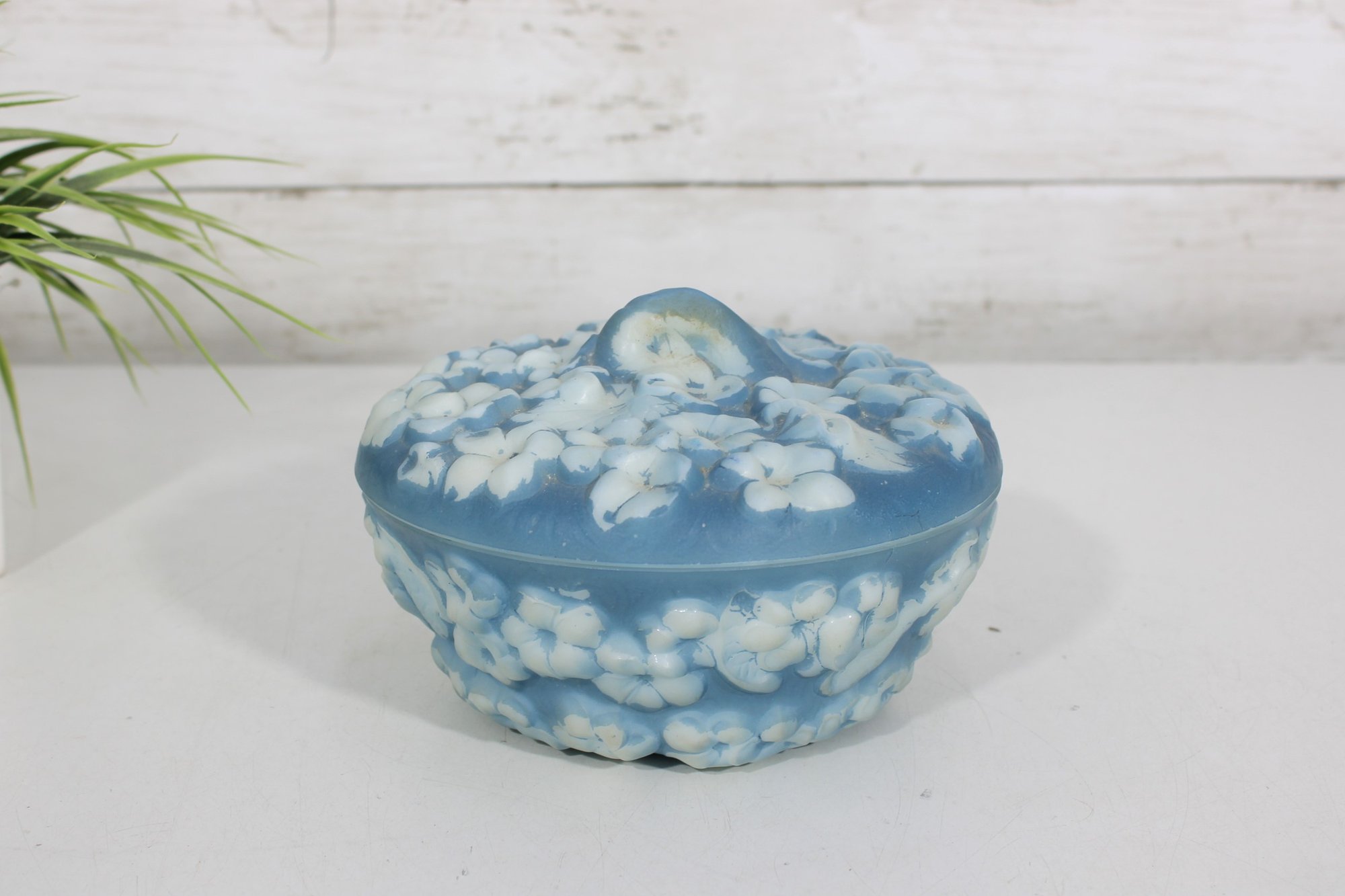a beautiful vintage Phoenix Glass Sculptured Artware covered candy dish in the sought-after “Phlox” pattern. This elegant piece features a soft blue satin glass finish with raised white floral designs, creating a delicate and sculptural look.