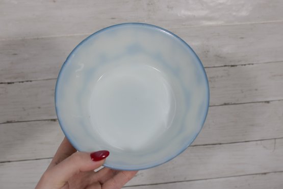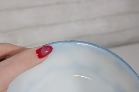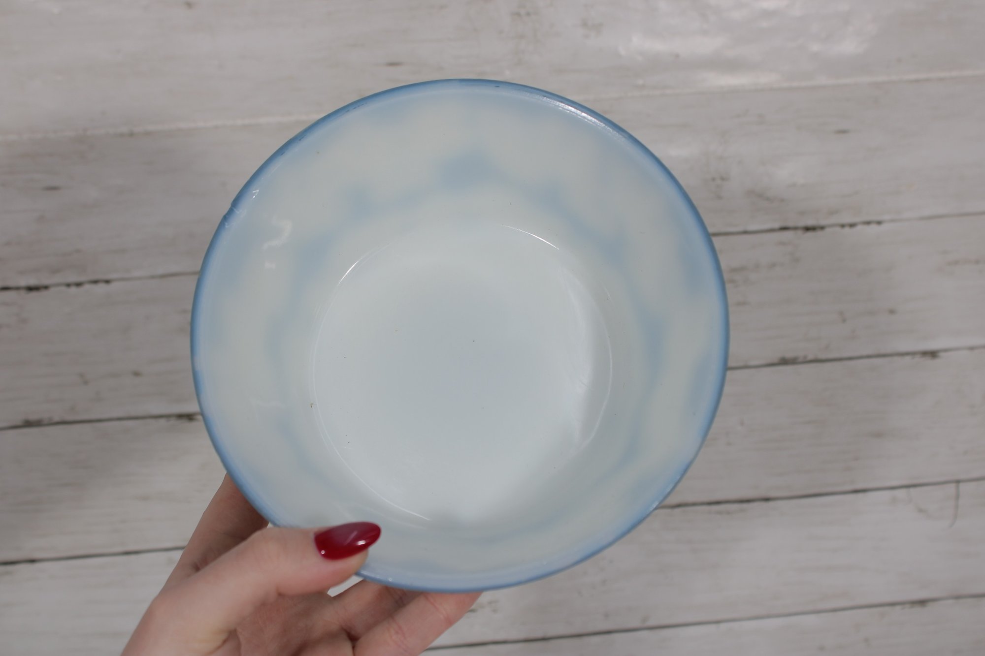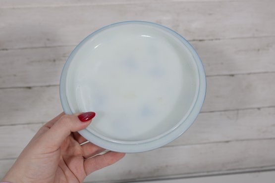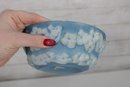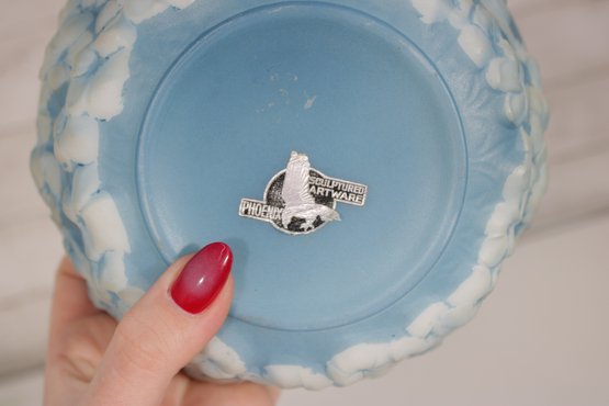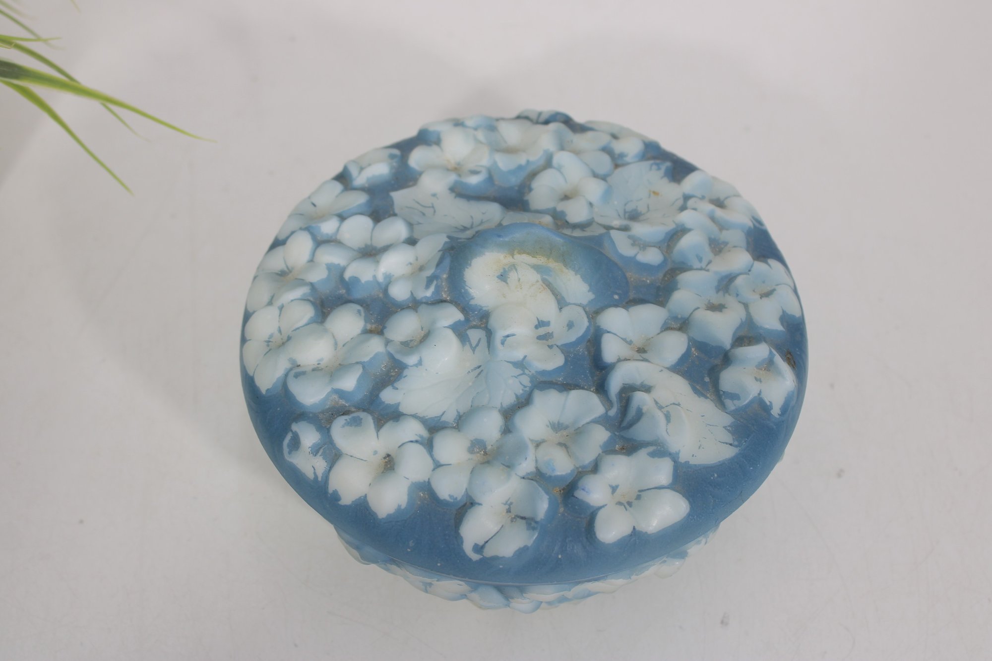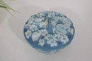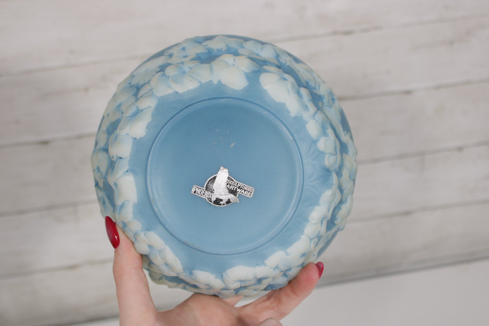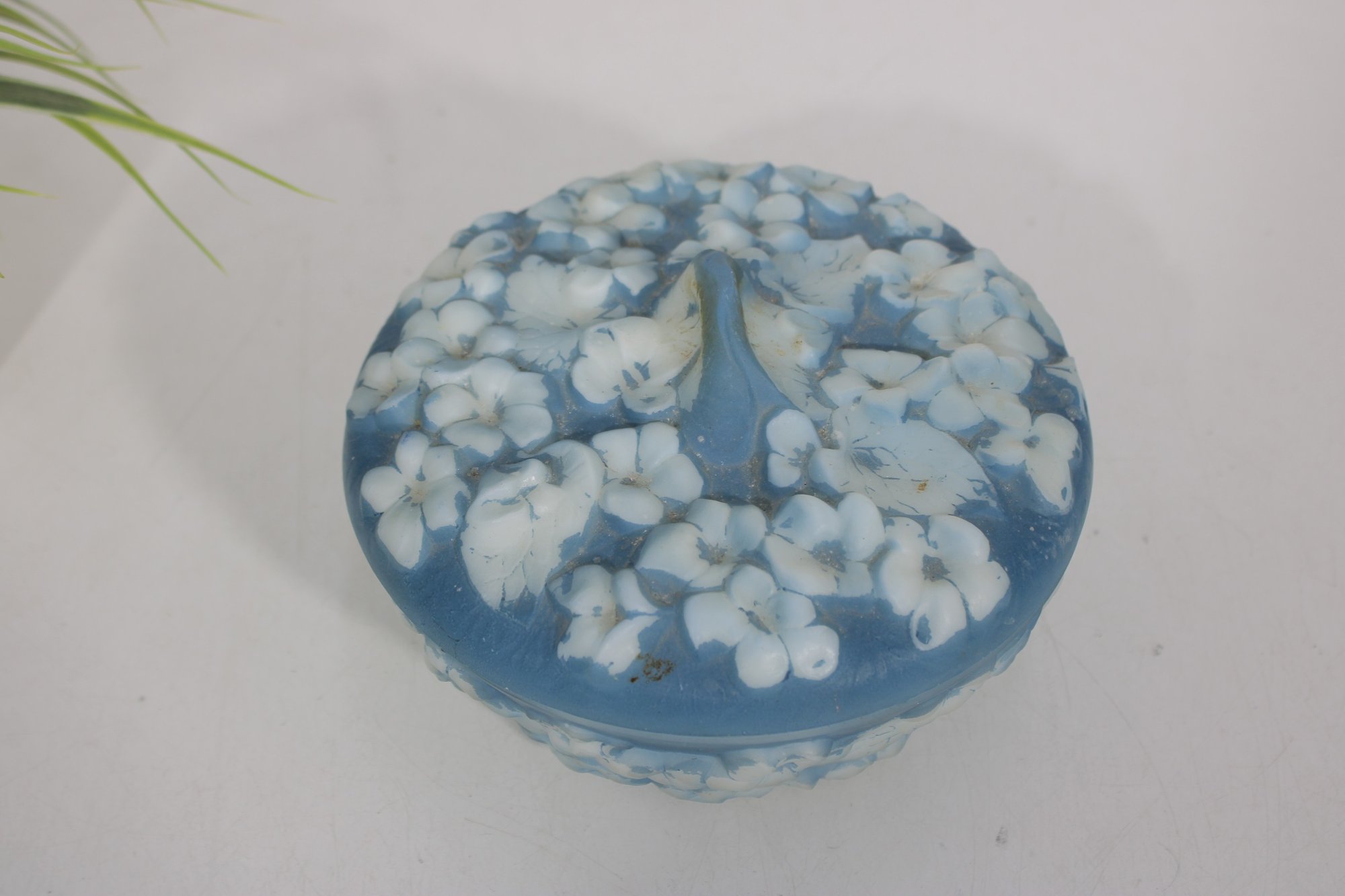 a beautiful vintage Phoenix Glass Sculptured Artware covered candy dish in the sought-after “Phlox” pattern. This elegant piece features a soft blue satin glass finish with raised white floral designs, creating a delicate and sculptural look.