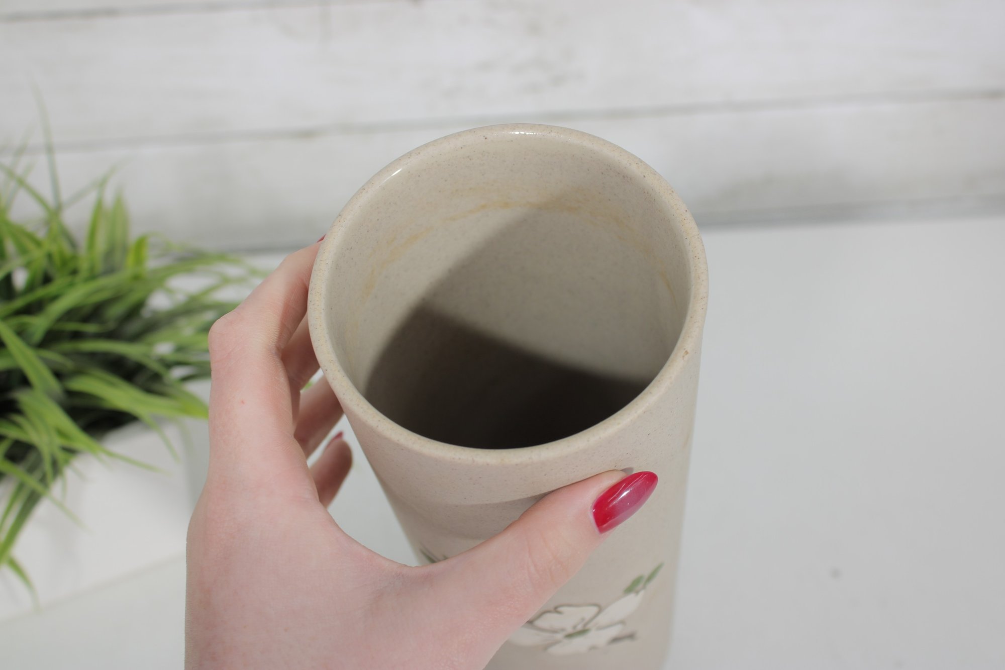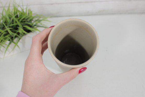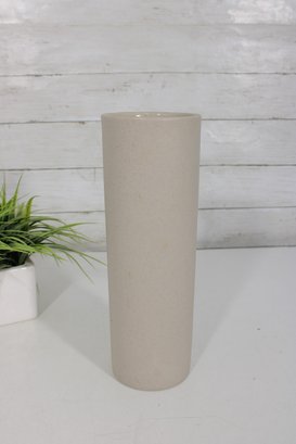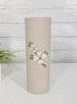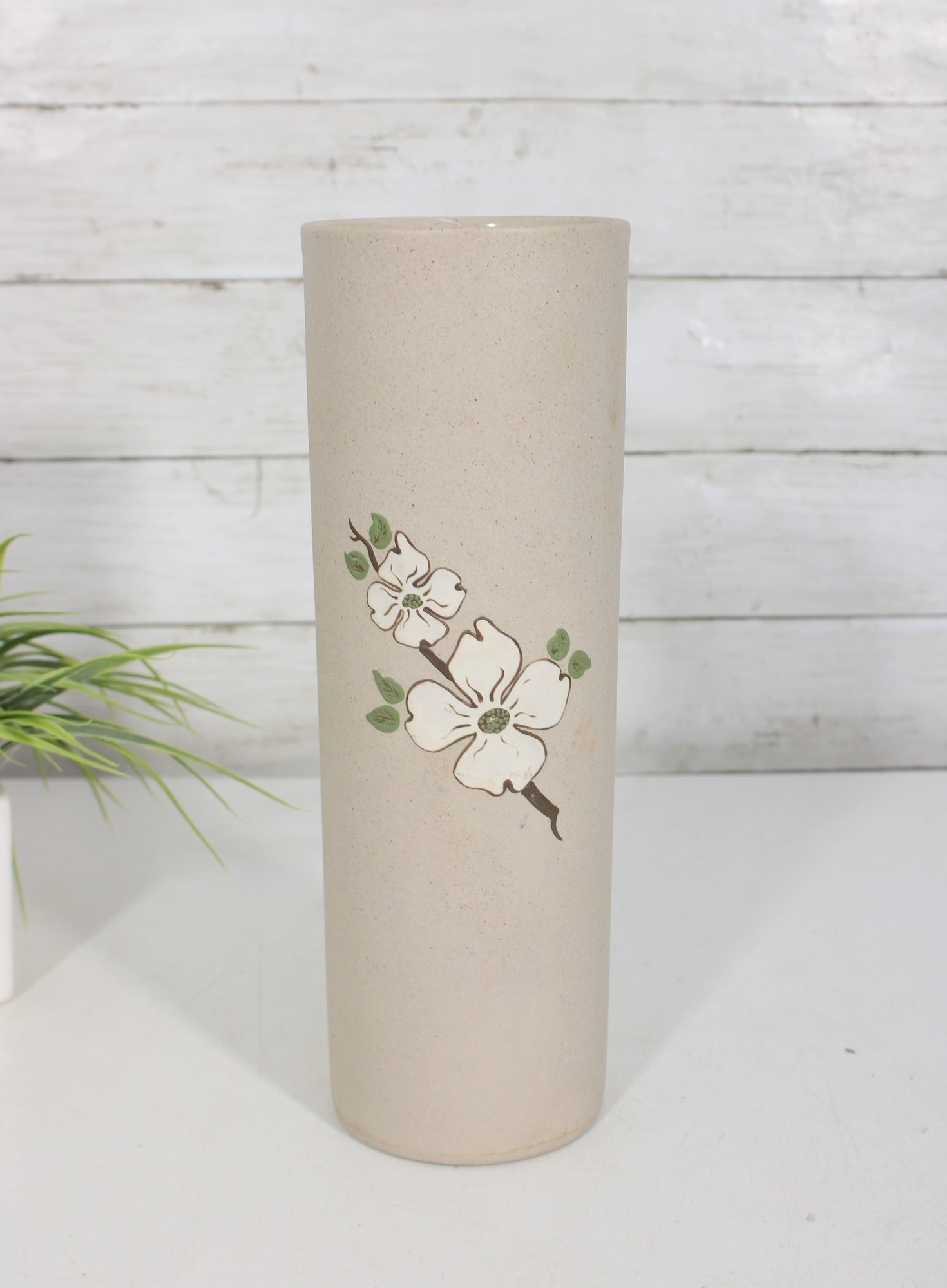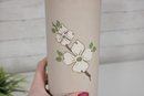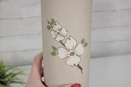 vintage ceramic vase from Pigeon Forge Pottery, Tennessee, featuring a classic dogwood floral design. This tall cylindrical vase showcases a soft matte beige glaze accented with hand-decorated white dogwood blossoms and green leaves—an iconic Southern motif.